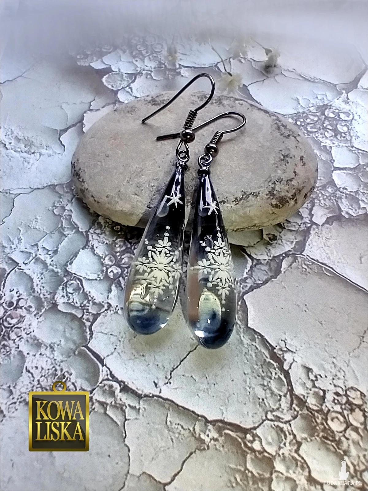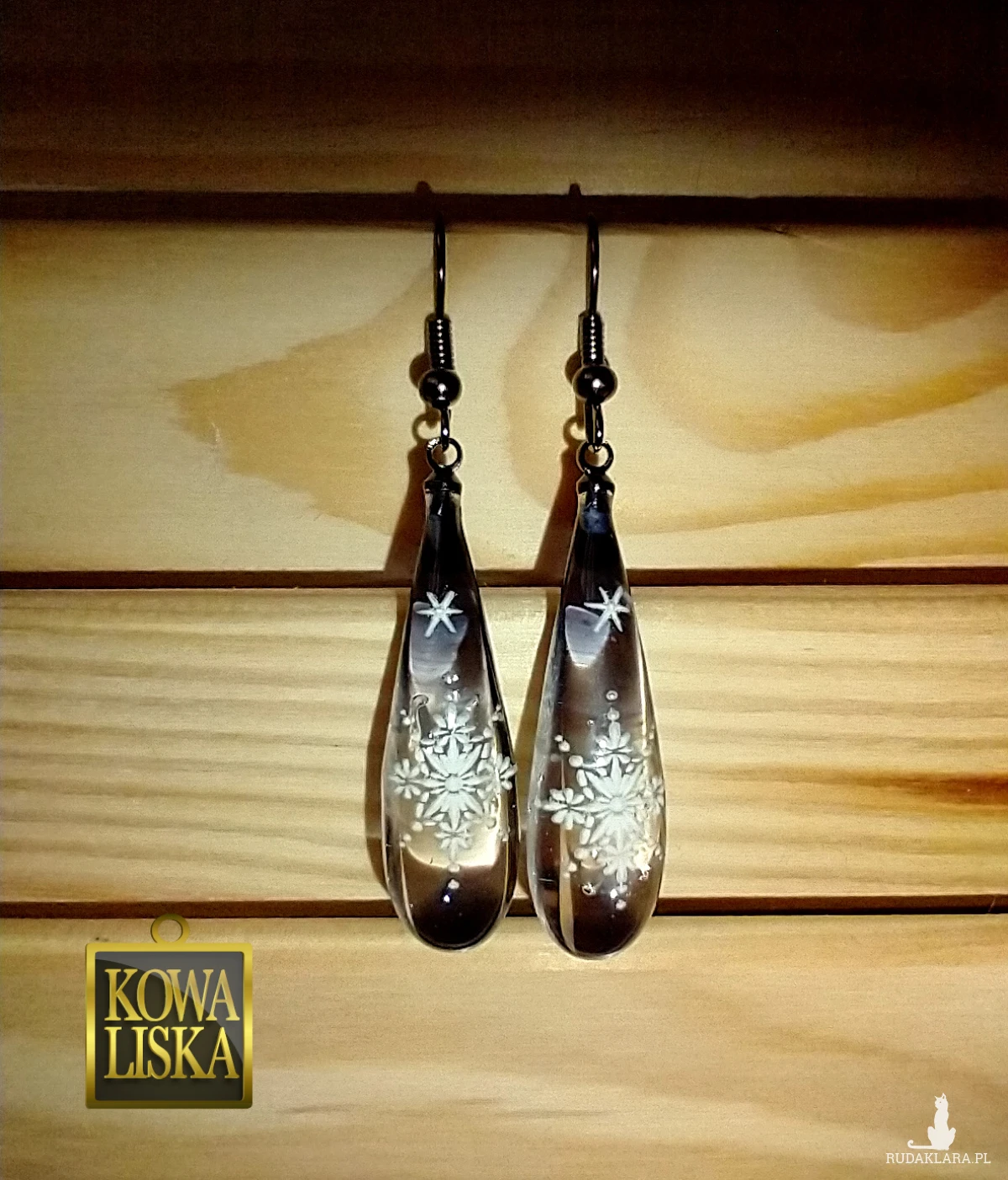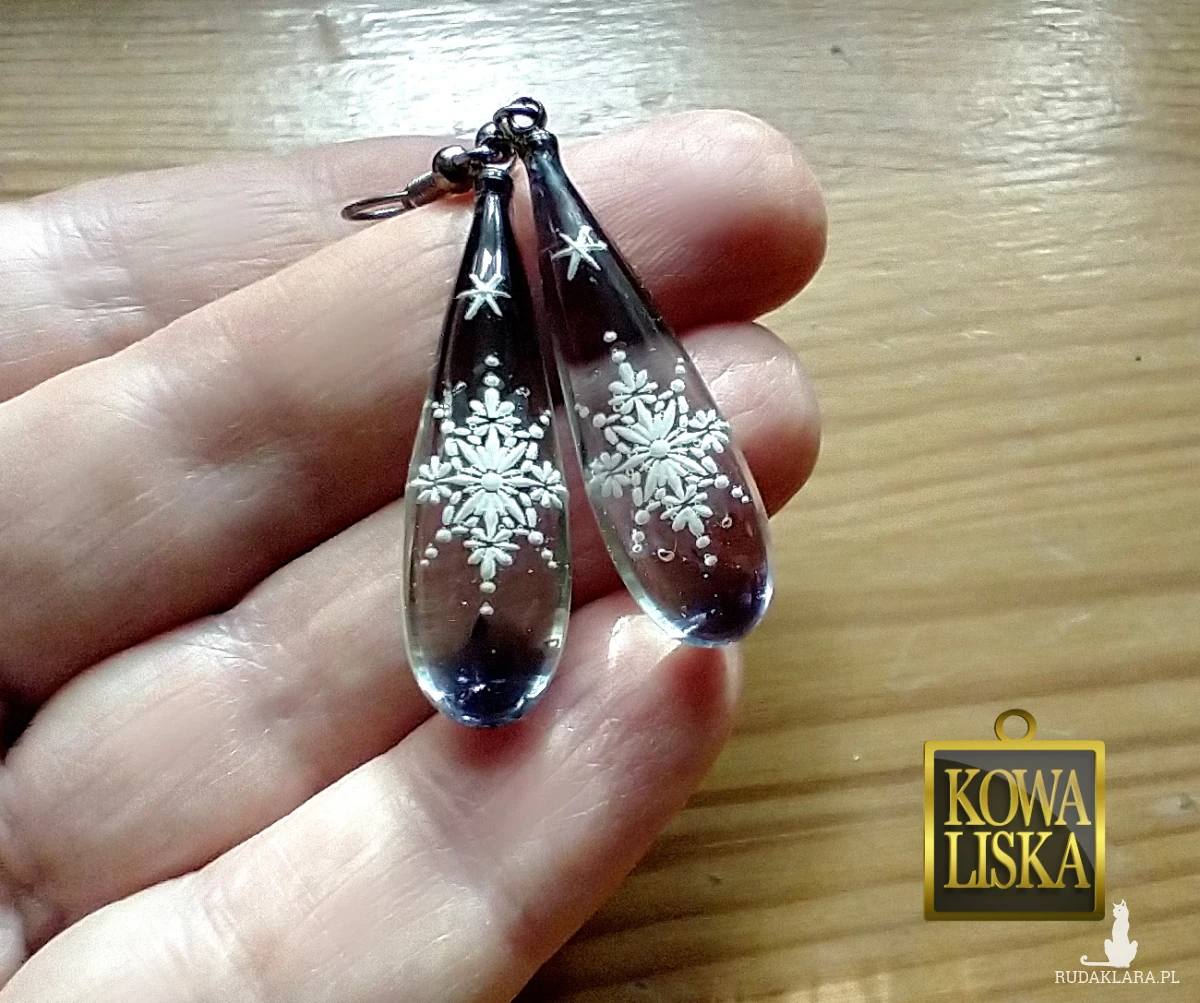 Wąskie, żywiczne sople w krystalicznym, grafitowym kolorze, zostały ozdobione białymi śnieżynkami, co dało mroźny, zimowy klimat.