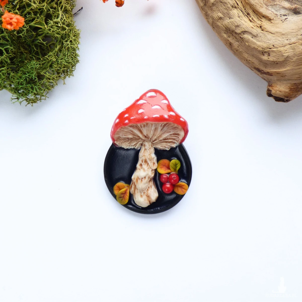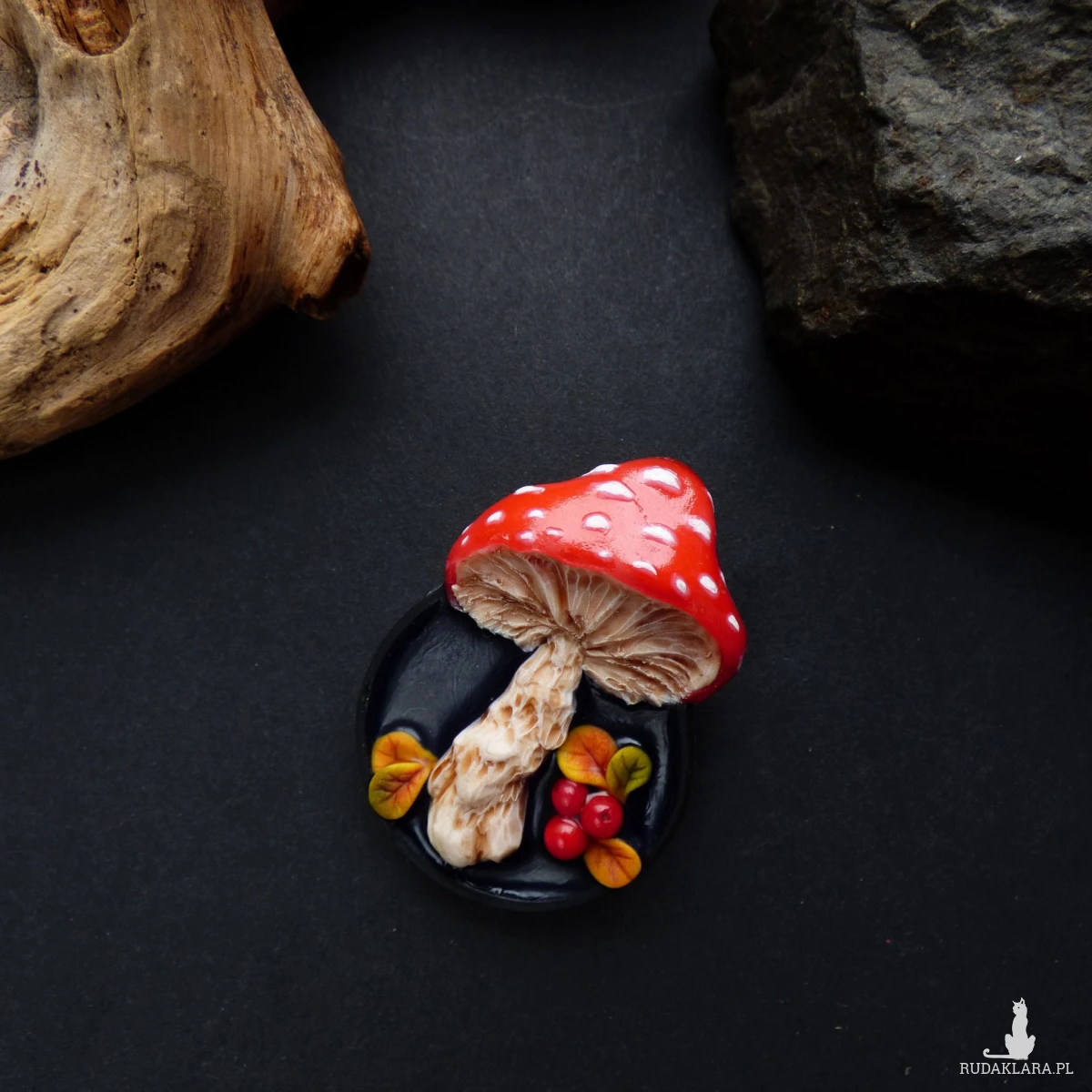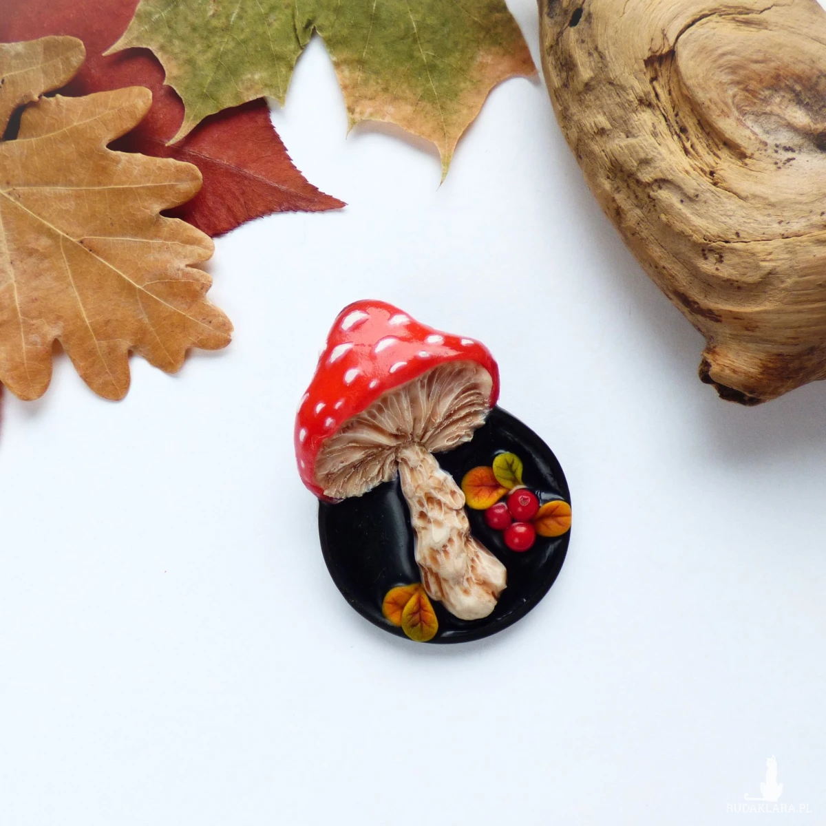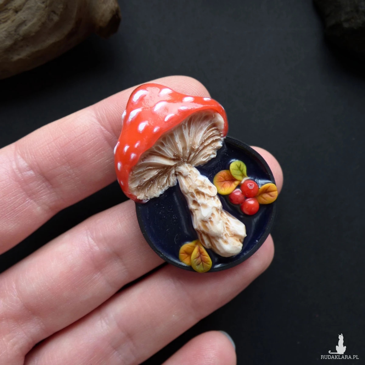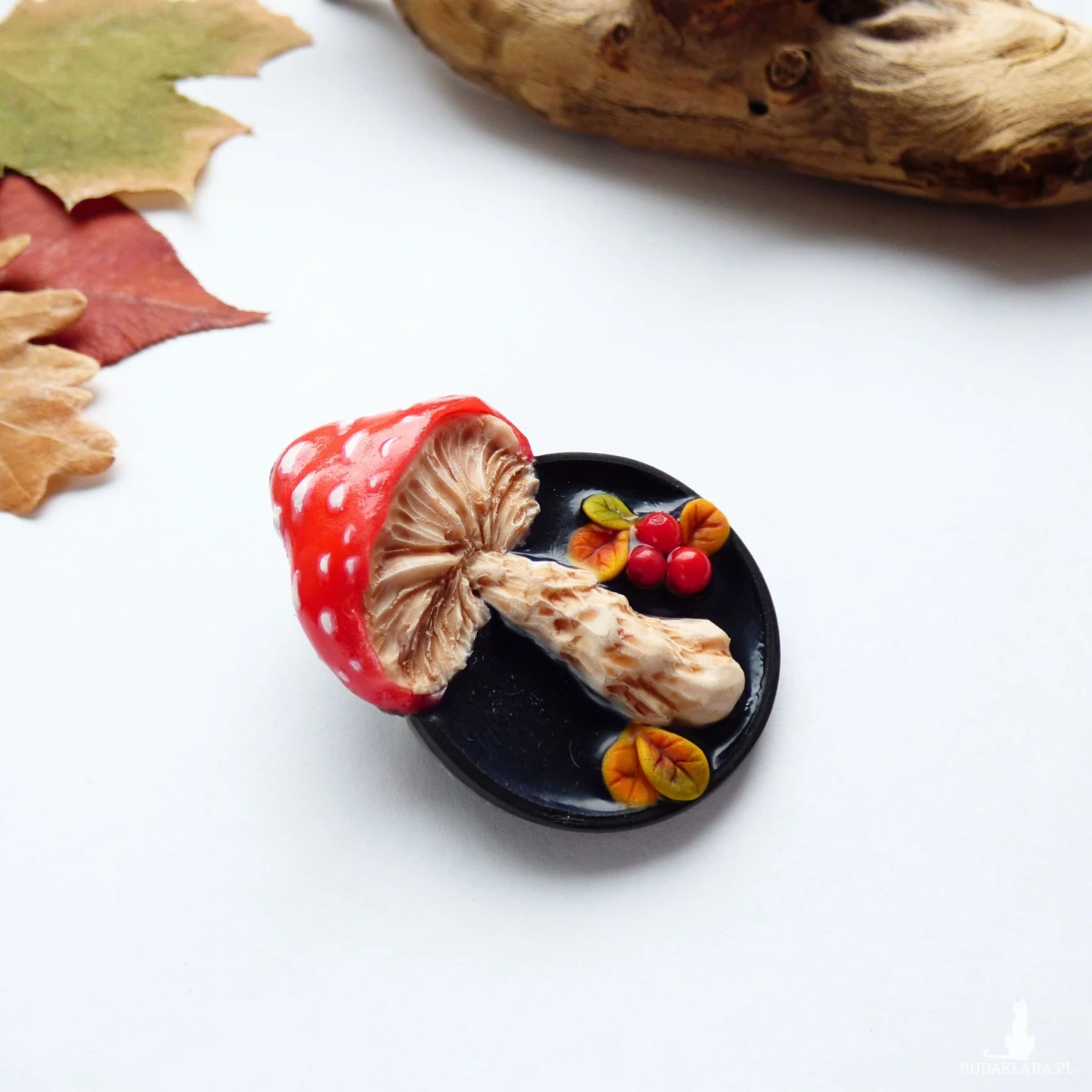 Autorska trójwymiarowa broszka modelowana ręcznie z glinki polimerowej techniką mikrorzeźby. Przedstawia ona muchomora oglądanego „od spodu” – z misternie wyrzeźbionymi blaszkami, mięsistym trzonem i kapeluszem w kolorze jasnej czerwieni z białymi kropkami. Na czarnym, połyskującym tle umieściłam miniaturowe jesienne listki i kulki czerwonego korala naturalnego w roli czerwonych jagód.