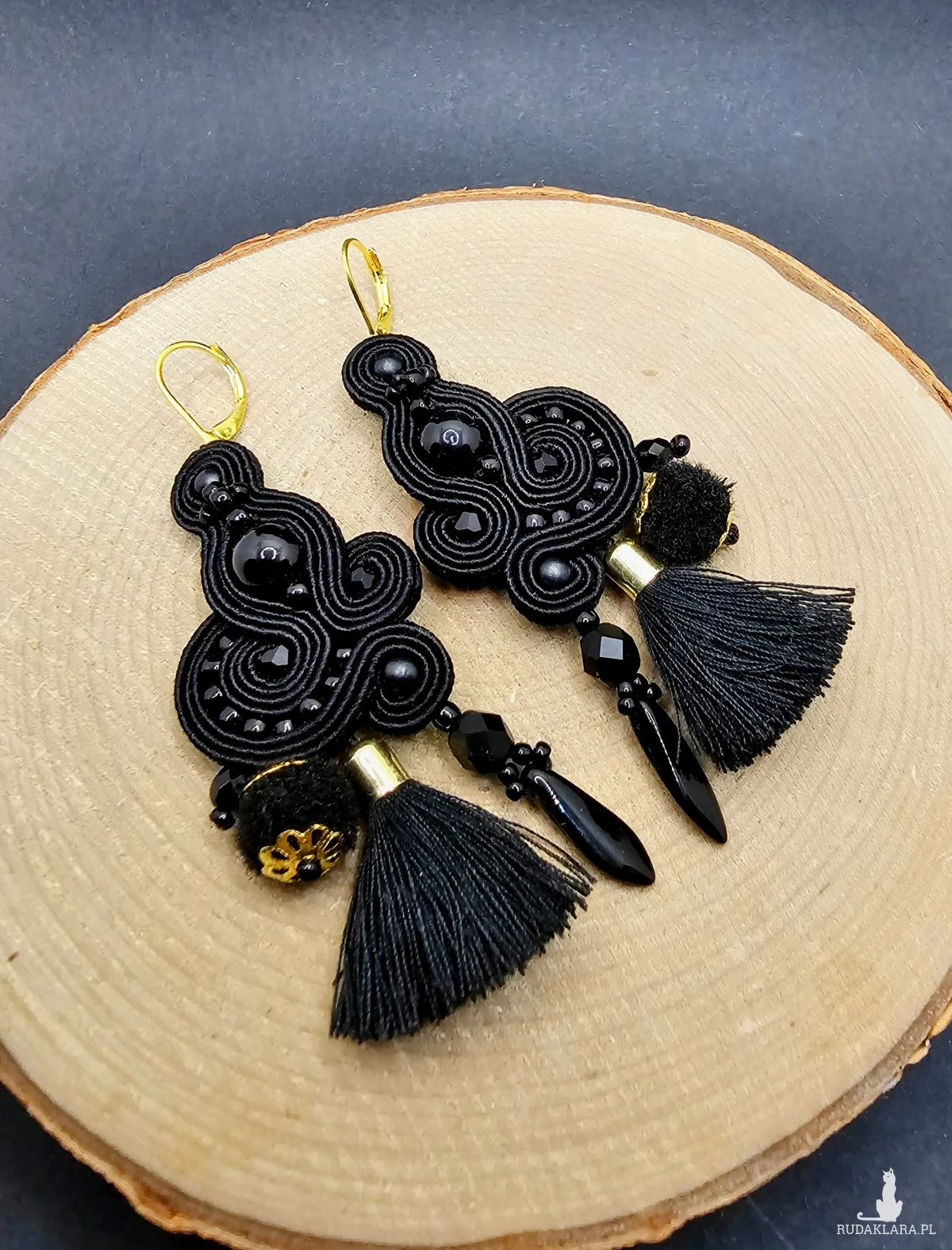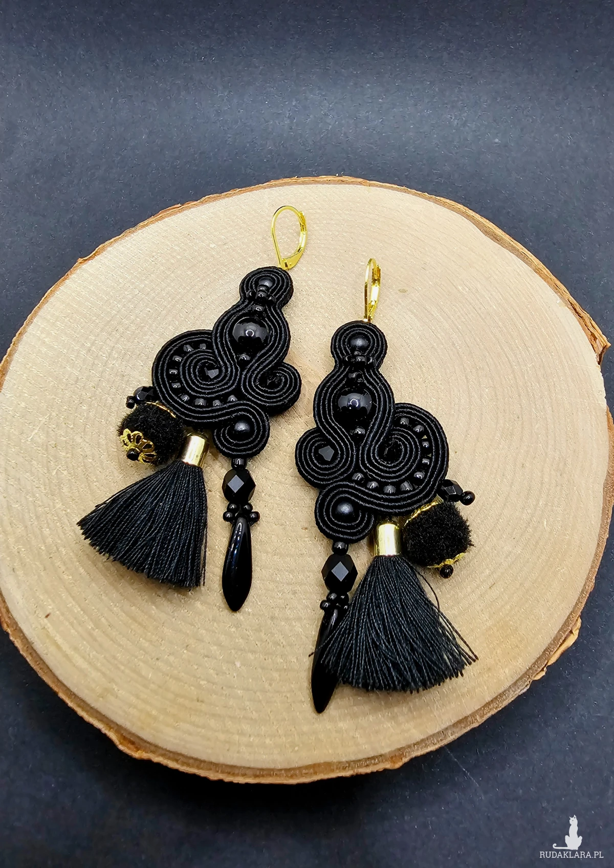 Czarne szklane kulki otoczone sznurkami sutasz oraz japońskimi koralikami TOHO i niewielkimi kryształkami. Dół kolczyków ozdobiony szklanymi koralikami, chwostami w złotej oprawie oraz pomponami. Kolczyki zawieszone na biglach angielskich w kolorze złotym.