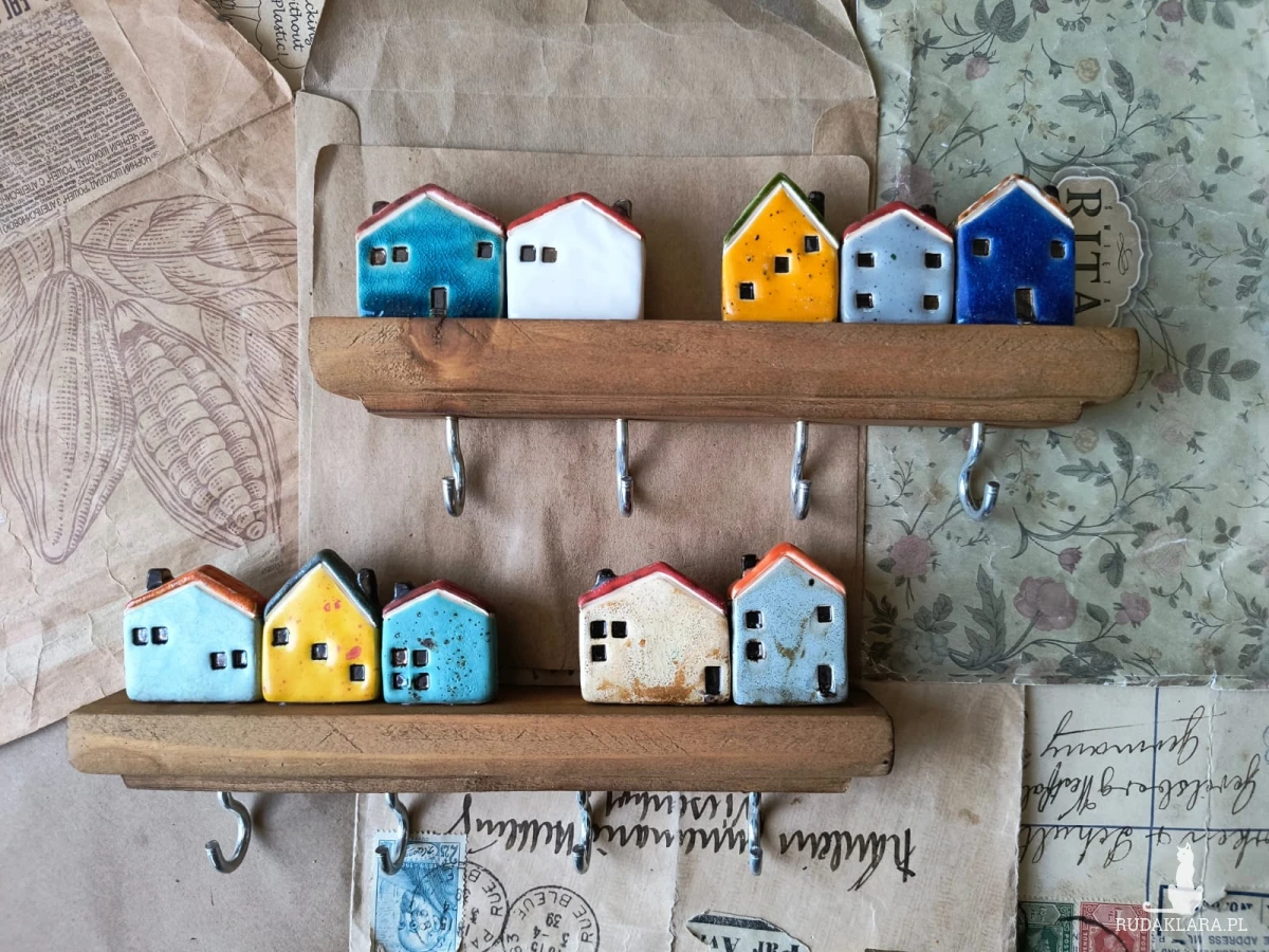 Zestaw wieszaków z kolorowymi domkami, wykonanymi z ceramiki i wypalonymi w temp ok 1260 stopni C. O długości 20 cm każdy. Dostępne również osobno.