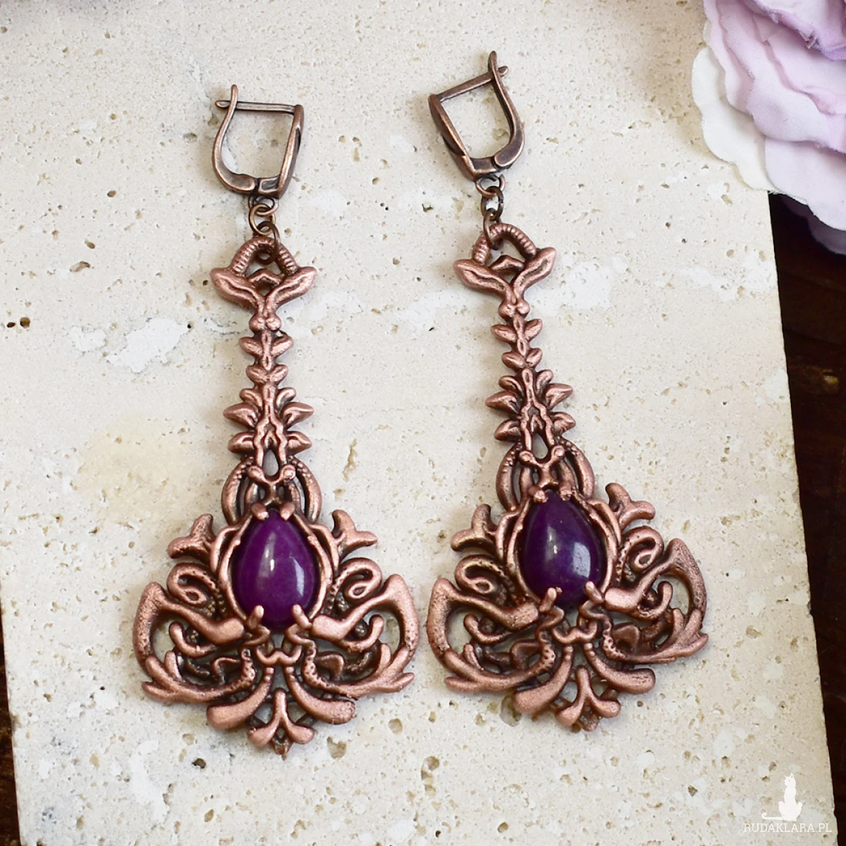 Kolczyki miedziane z fioletowym jadeitem to unikalna biżuteria w stylu wiktoriańskim i gotyckim. Wykonane metodą elektroformowania, charakteryzują się delikatnymi detalami, które nadają im wyjątkowy charakter. Fioletowy jadeit w połączeniu z miedzianą oprawą tworzy elegancki kontrast, idealny na specjalne okazje. To doskonały wybór na prezent dla miłośników biżuterii w vintage i gotyckim stylu. Kolczyki są lekkie, trwałe i stanowią piękny dodatek do każdej stylizacji, zarówno na co dzień, jak i na wyjątkowe wydarzenia.