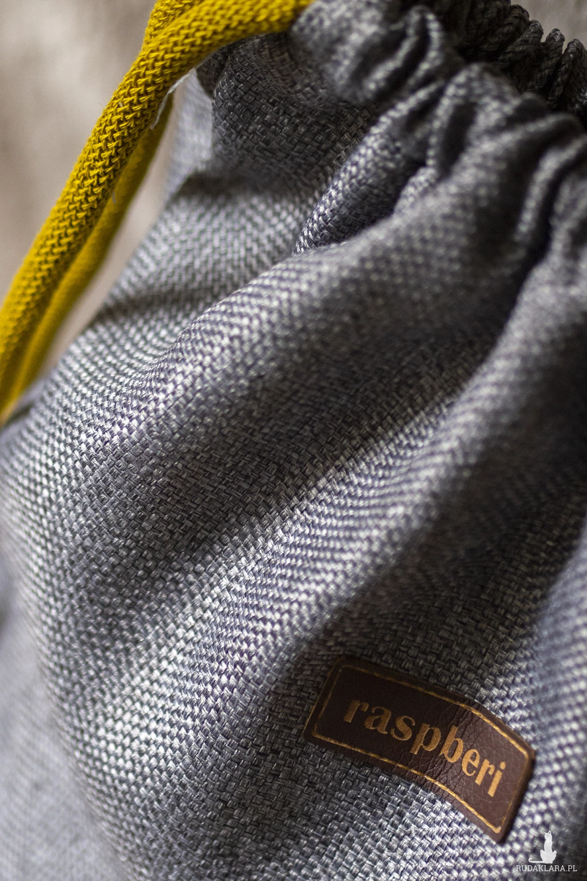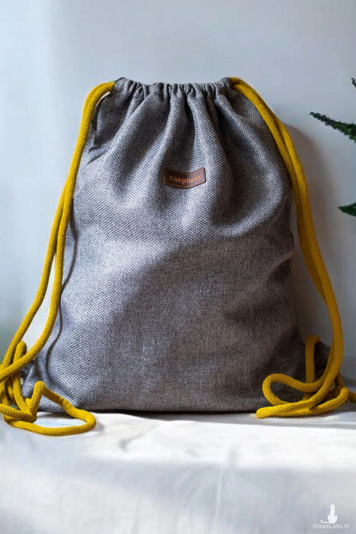 Plecak worek wykonany z szarej plecionej tkaniny. Delikatnie połyskuje.