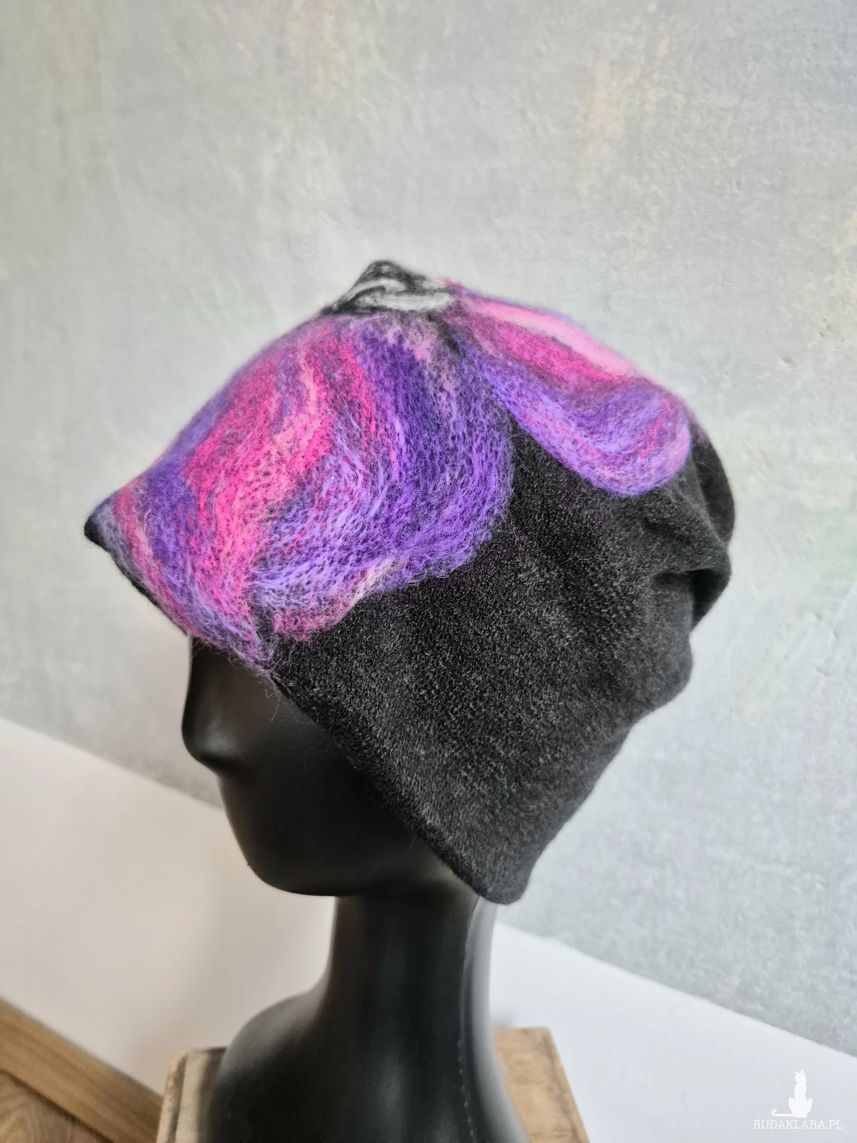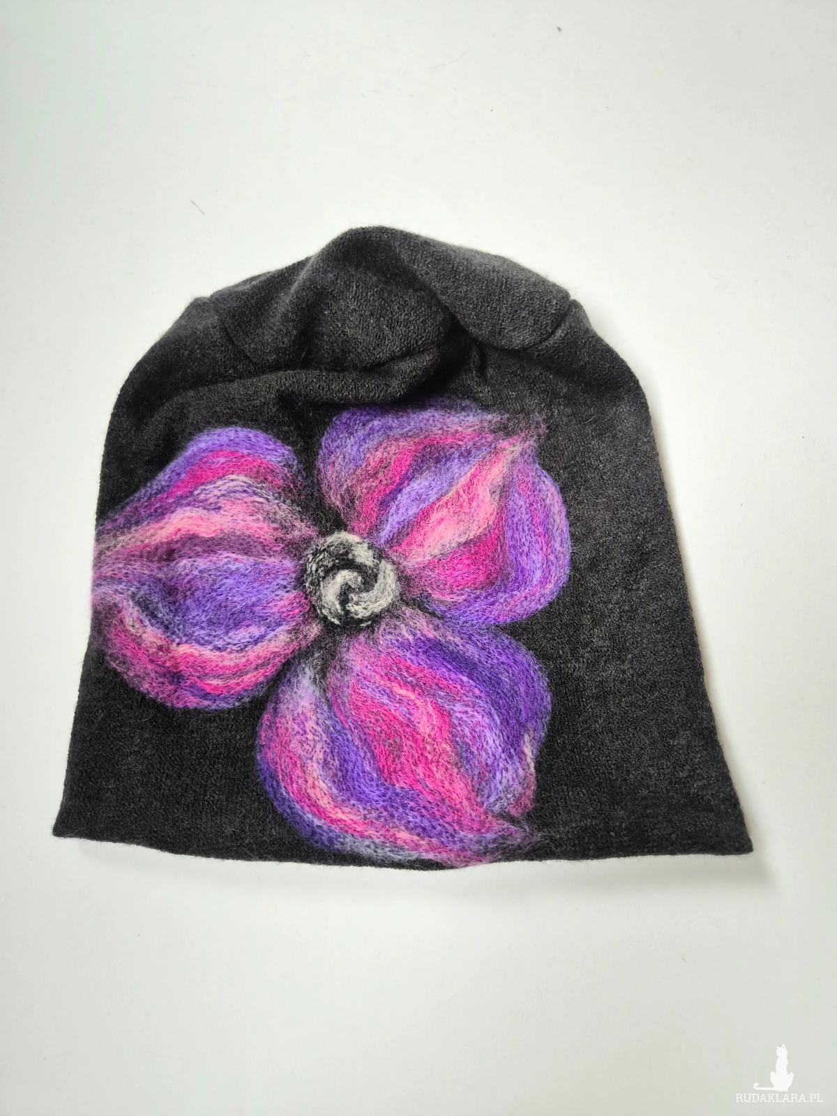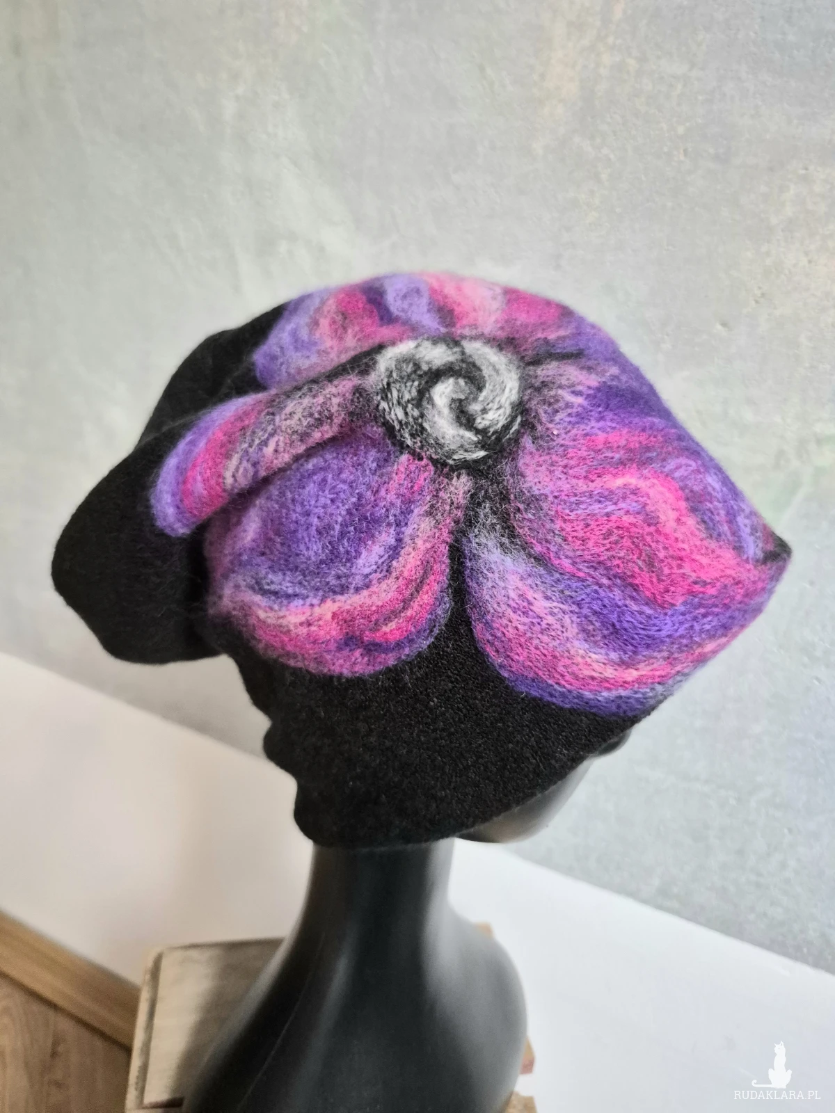 czapka wełniana filcowana zimowa czarna ostatnia, handmade w kwiaty na podszewce-- rozmiar uniwersalny, wełniana, filcowana wełną merynosów, bardzo ciepła, fantastyczna, miła, miękko układa się na głowie, niesamowicie zwraca uwagę, doskonałą na codzienne noszenie jak i na prezent, zawsze możesz ją założyć po basenie i przeżyjesz,box c1