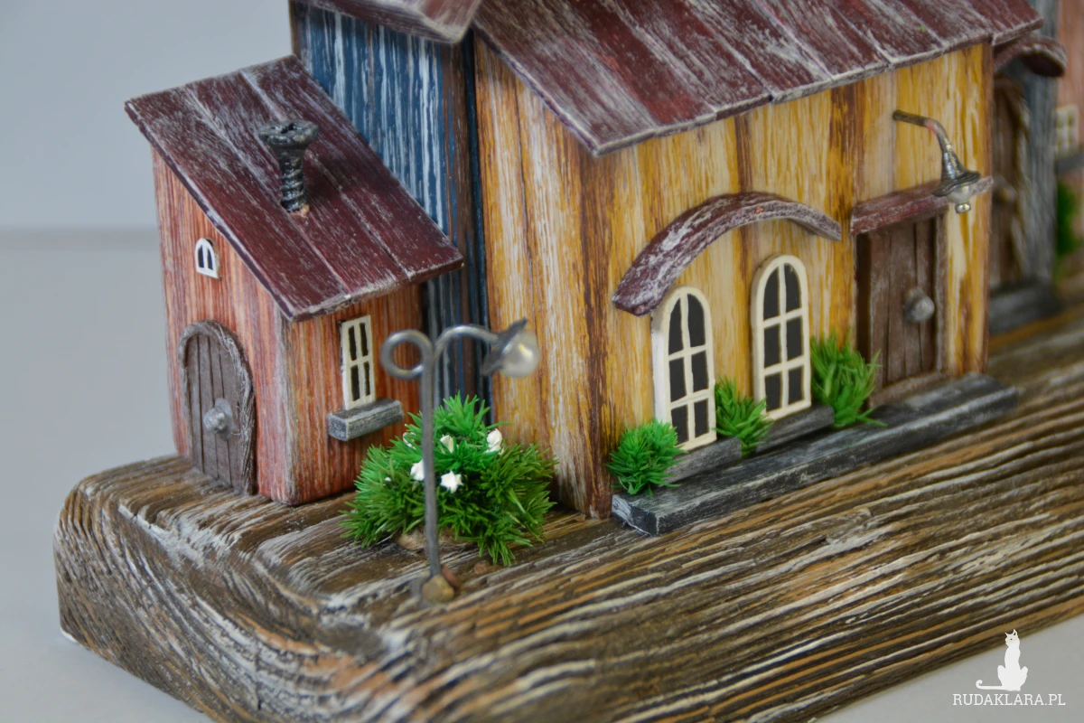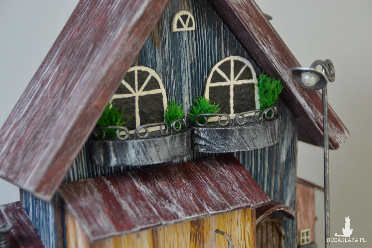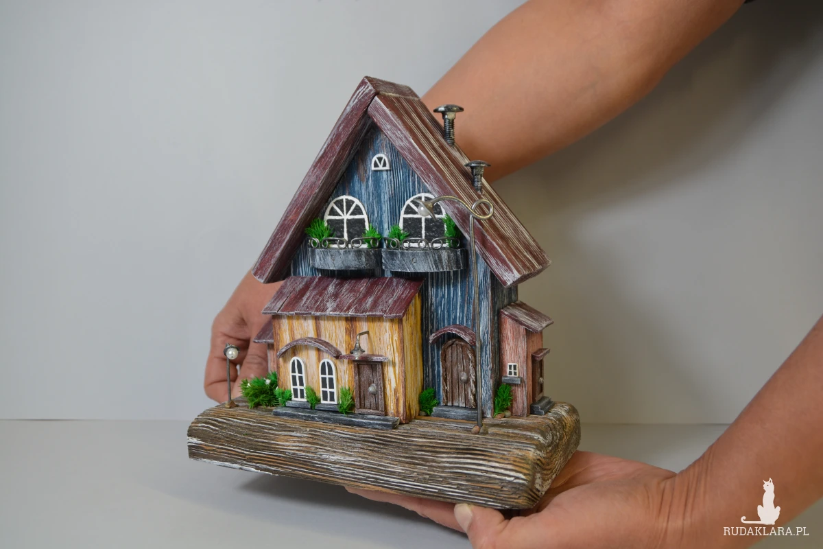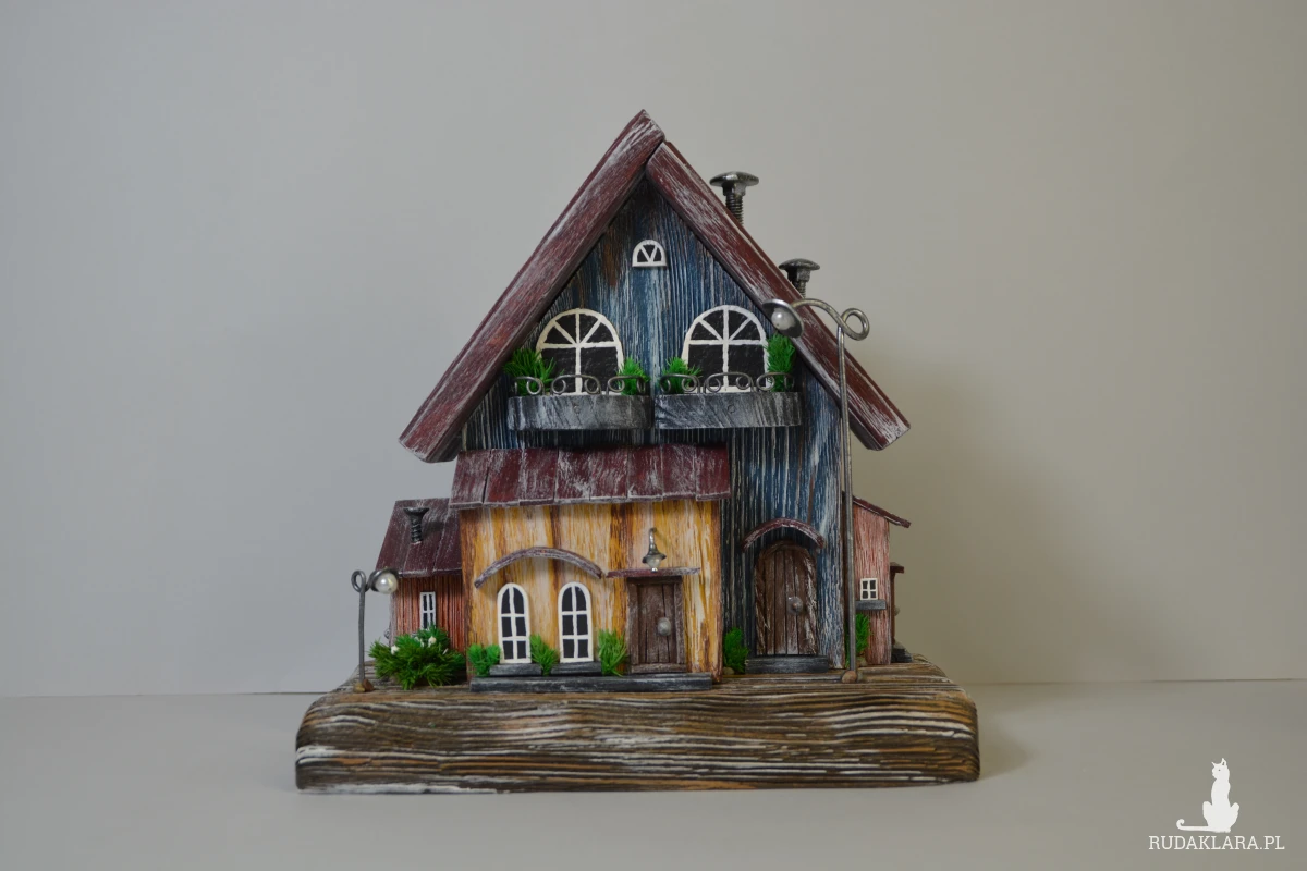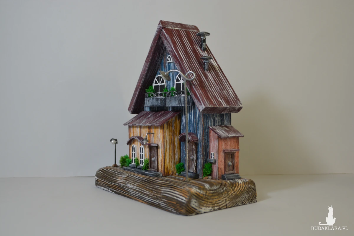 Ten ręcznie wykonany domek z drewna to wyjątkowa dekoracja, która wprowadza ciepły, bajkowy klimat do każdego wnętrza. Starannie wykonany z naturalnych materiałów, ozdobiony drobnymi detalami – okienkami, balkonami i mini roślinkami. Idealny jako ozdoba półki, komody czy parapetu. Świetny pomysł na prezent dla miłośników natury i stylu rustykalnego.