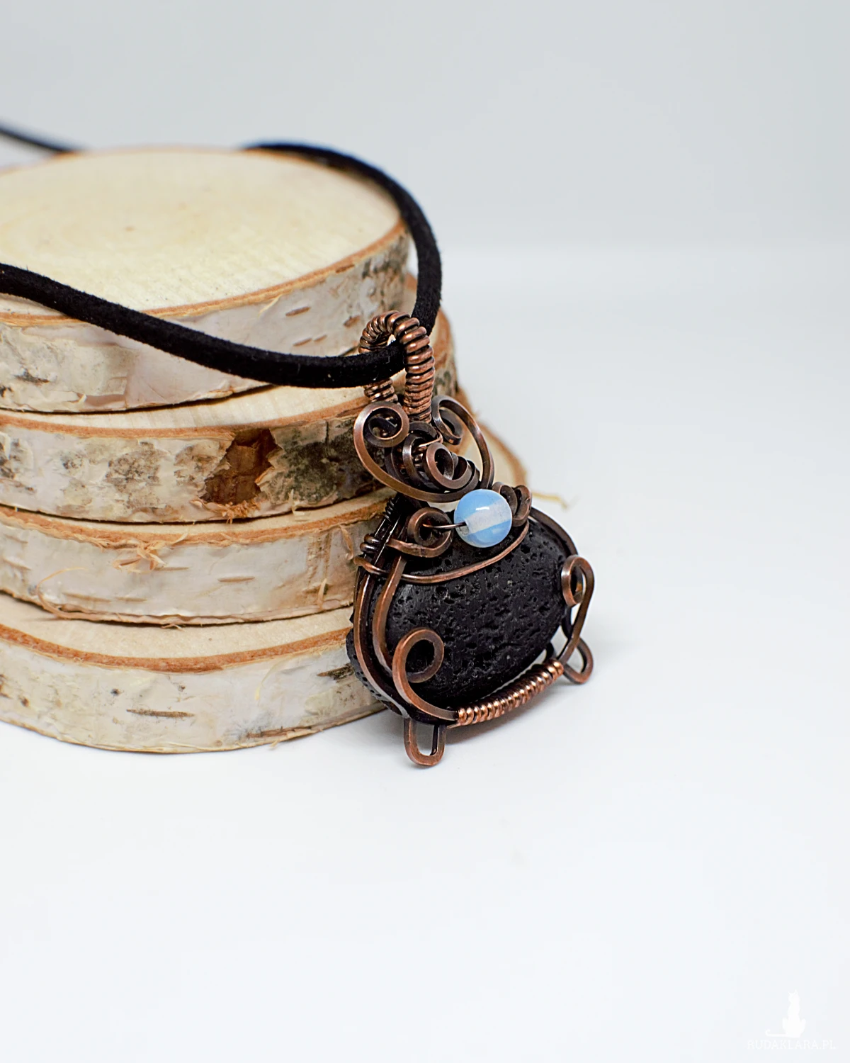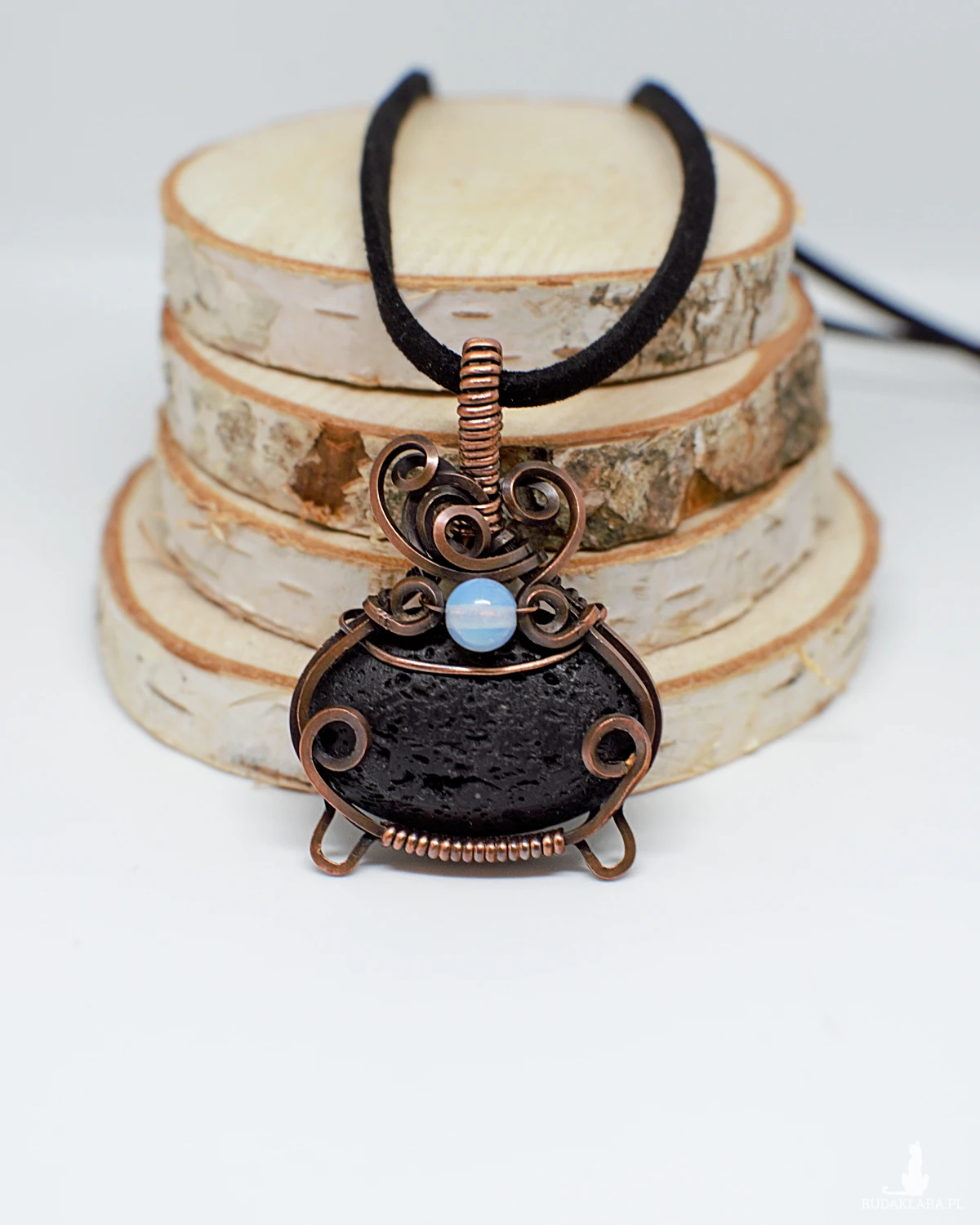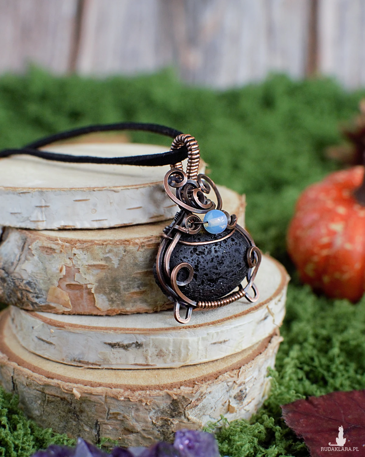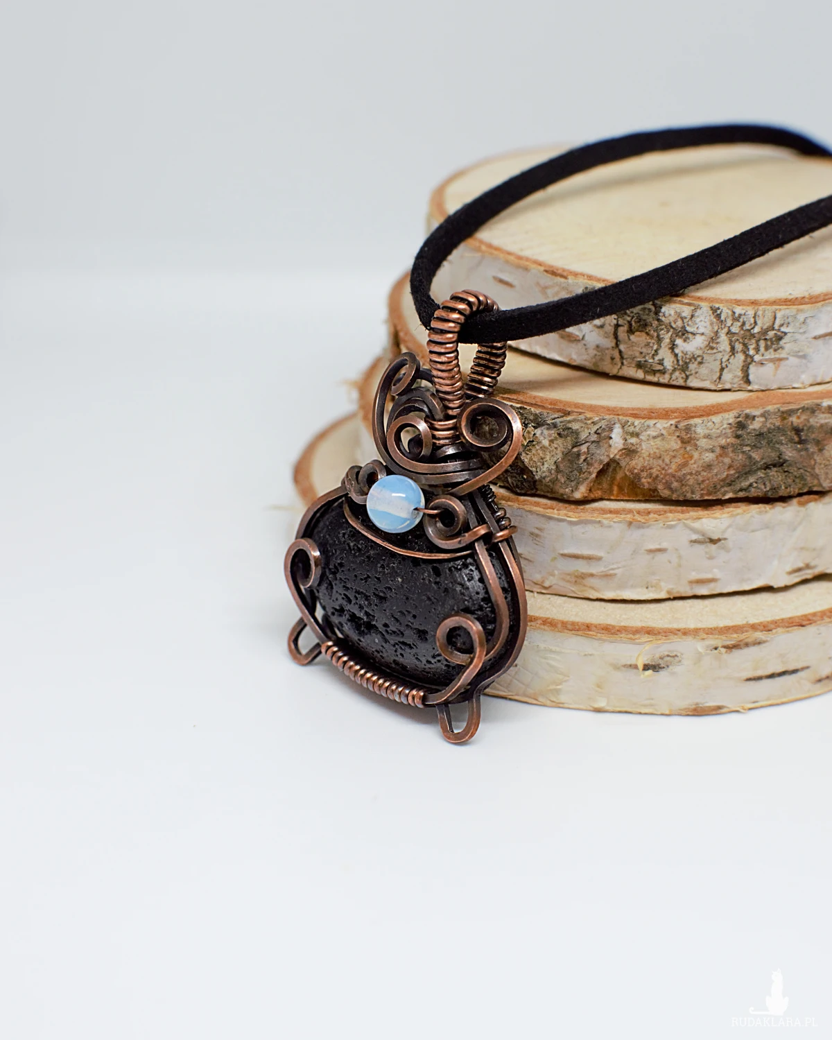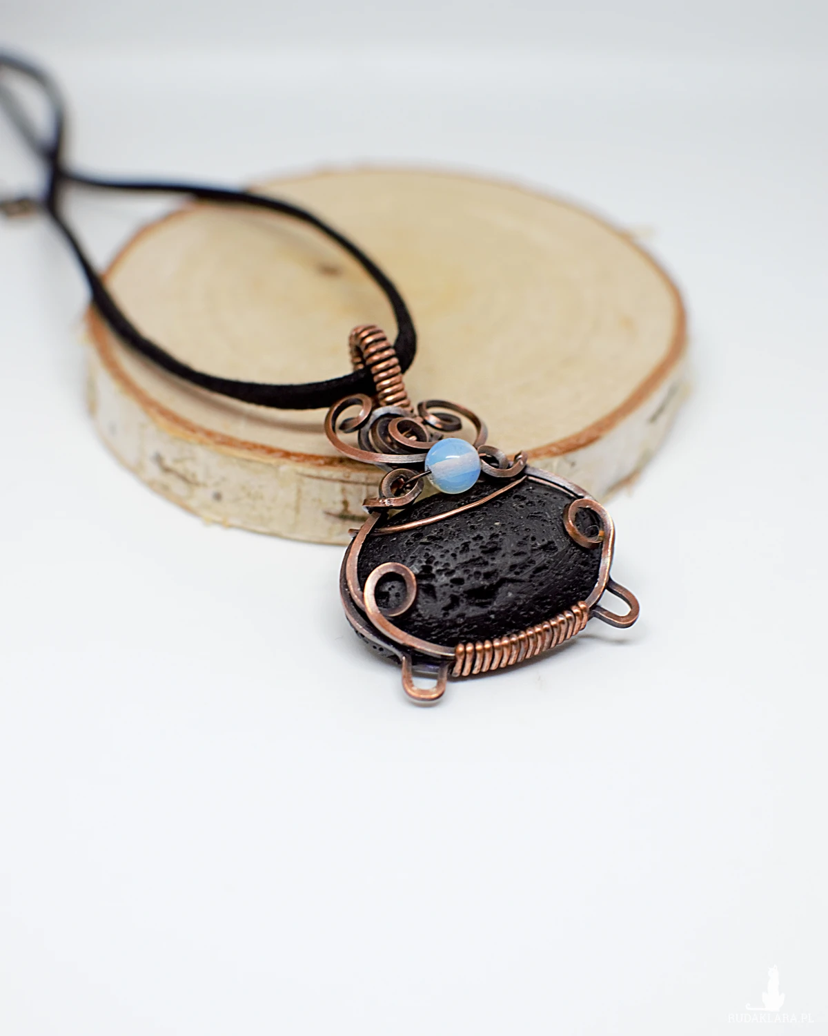 Jedyny w swoim rodzaju wisior ręcznie wykonany z użyciem kamienia wulkanicznego, opalitu i naturalnej miedzi.