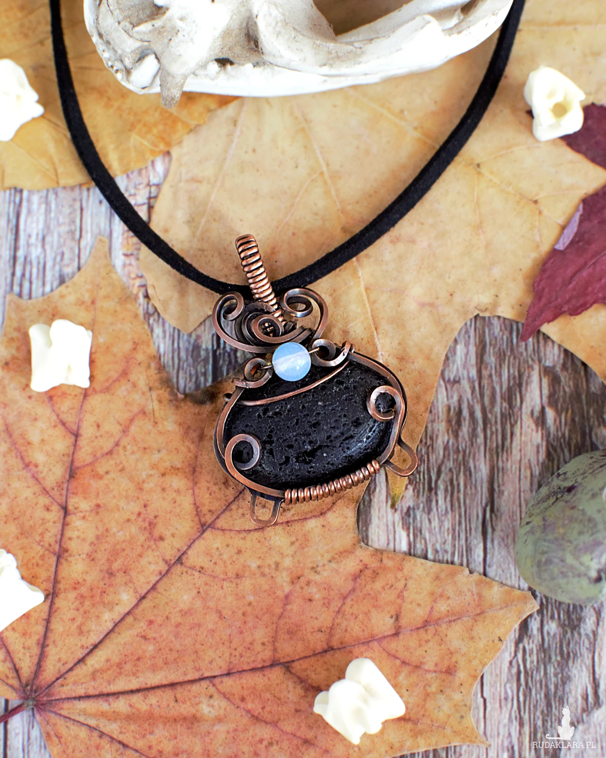Kamień wulkaniczny stanowiący główną część kociołka wiedźmy został wzbogacony o miedziane zawijasy i pętle oraz koralik z opalitu, mające przypominać parę i bąbelki unoszące się nad naczyniem. Bo jak wiadomo, w kociołku prawdziwej wiedźmy zawsze dużo się dzieje :)