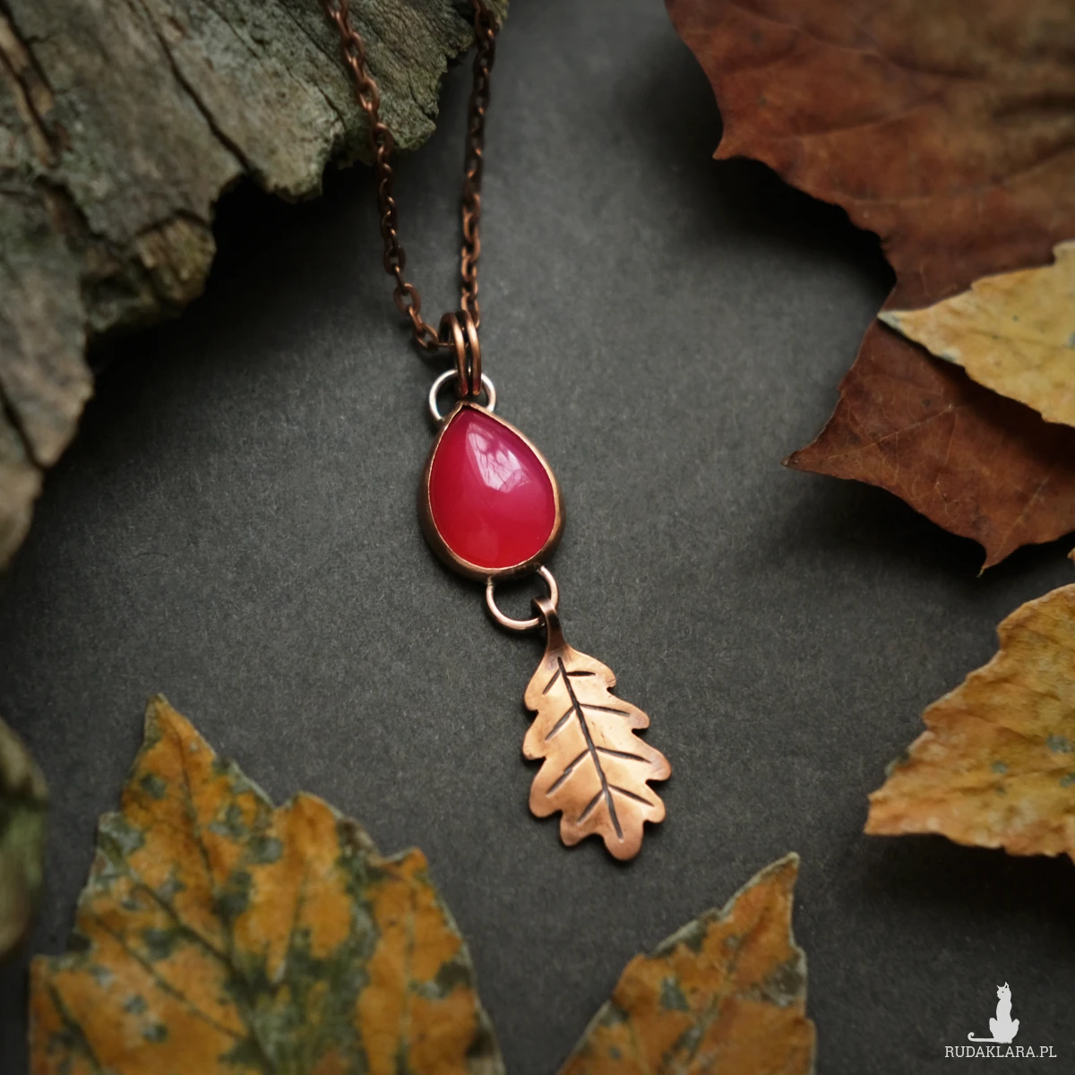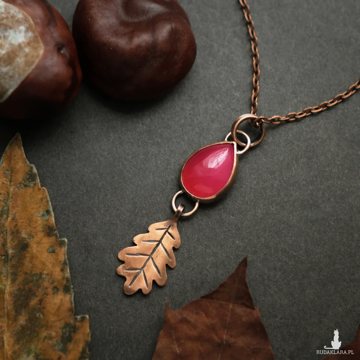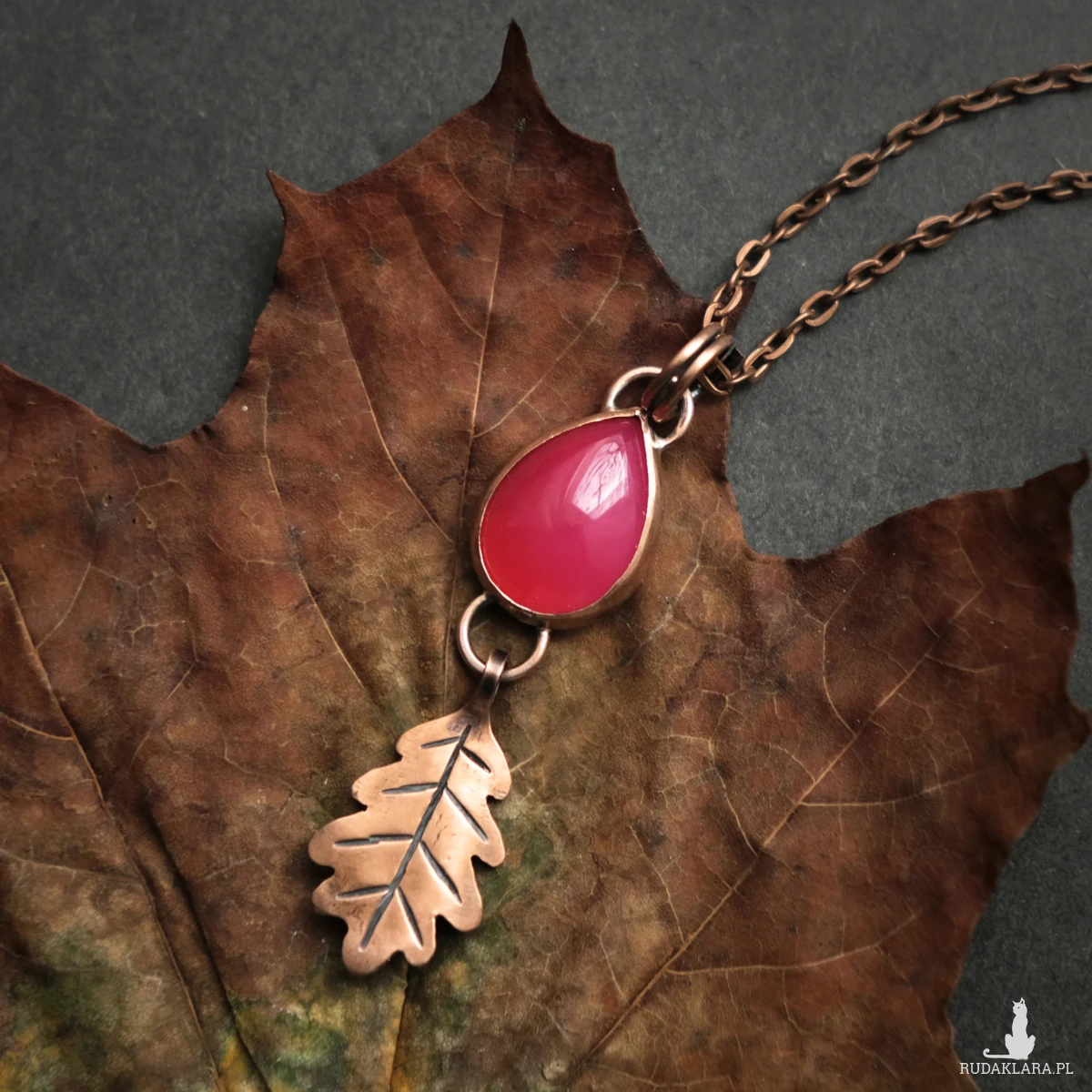 Miedziany wisiorek z listkiem dębu mieści w sobie kamień agatu brazylijskiego o mocnym różowym kolorze (kamień barwiony). Wszystkie elementy zostały stworzone ręcznie, co nadaje mu oryginalnego leśnego charakteru. Wisiorek ma naniesioną patynę. Idealnie sprawdzi się na dekolcie miłośniczki natury, ceniącej wyroby rękodzielnicze oraz delikatną biżuterię.