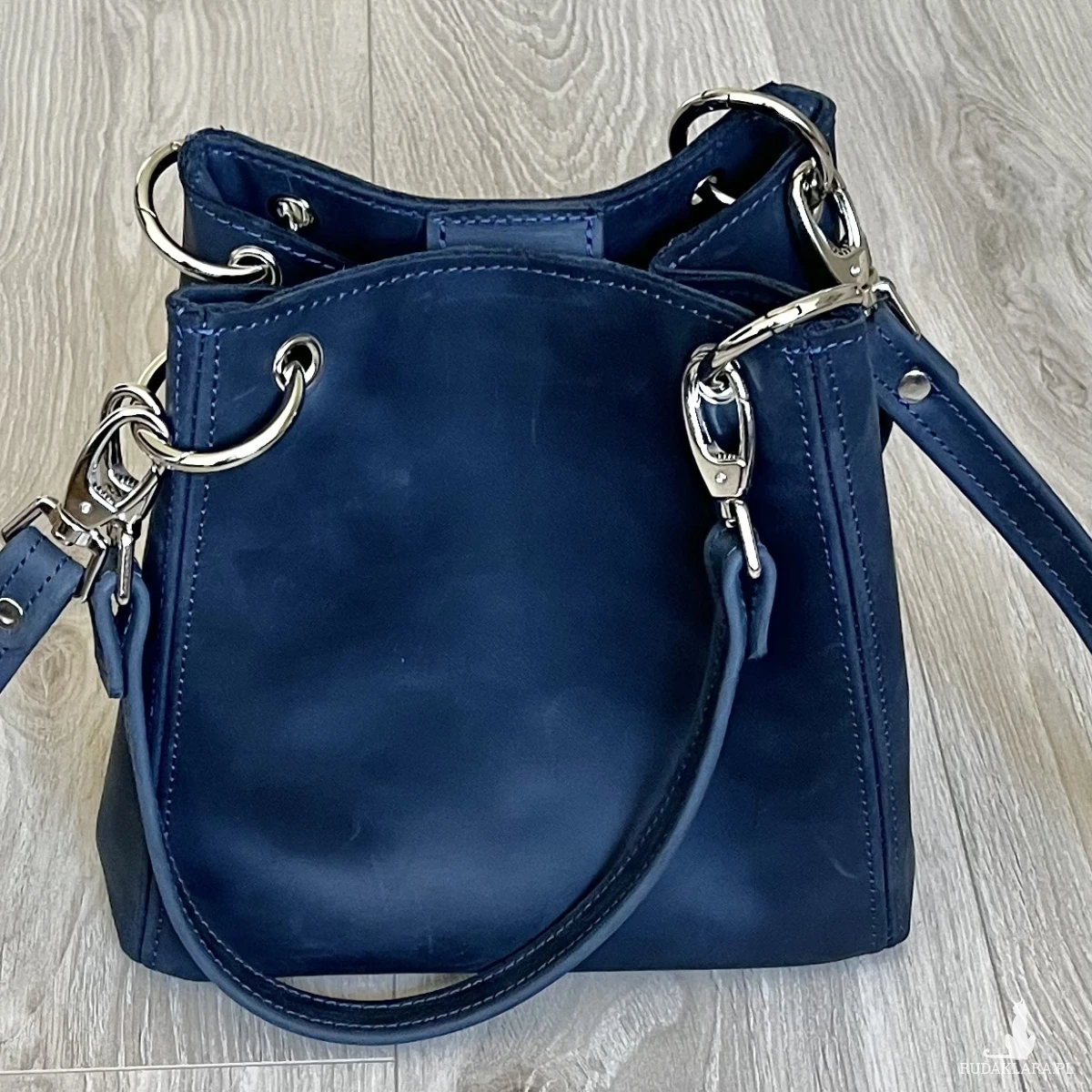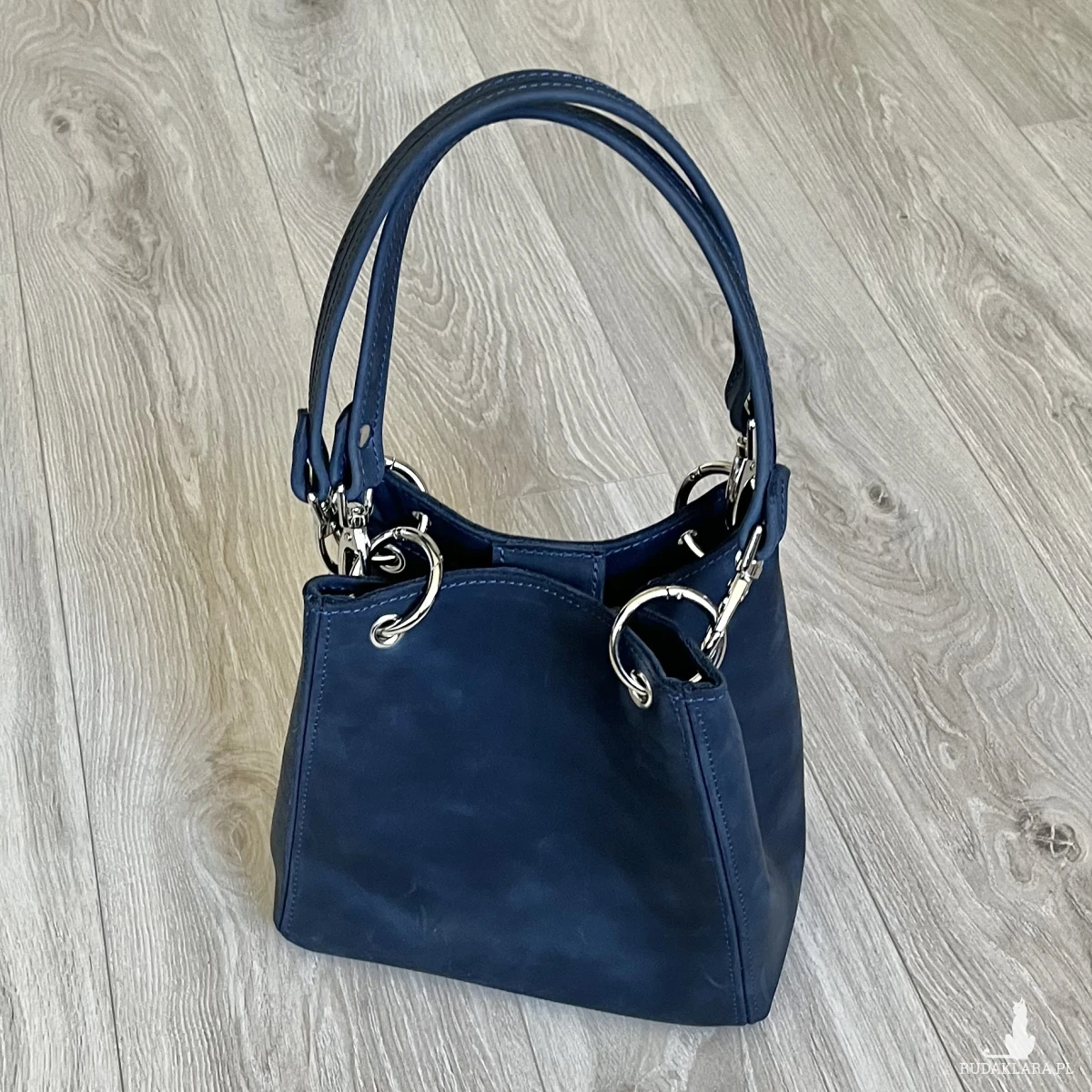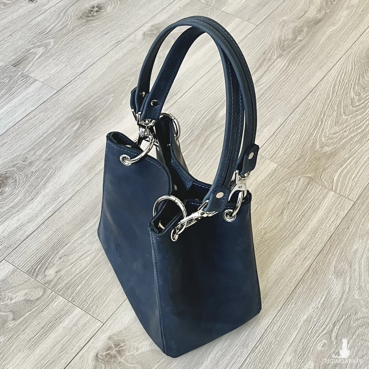 Niebieska torebka damska wyposażona w dwie odpinane skórzane rączki oraz długi regulowany odpinany skórzany pasek.