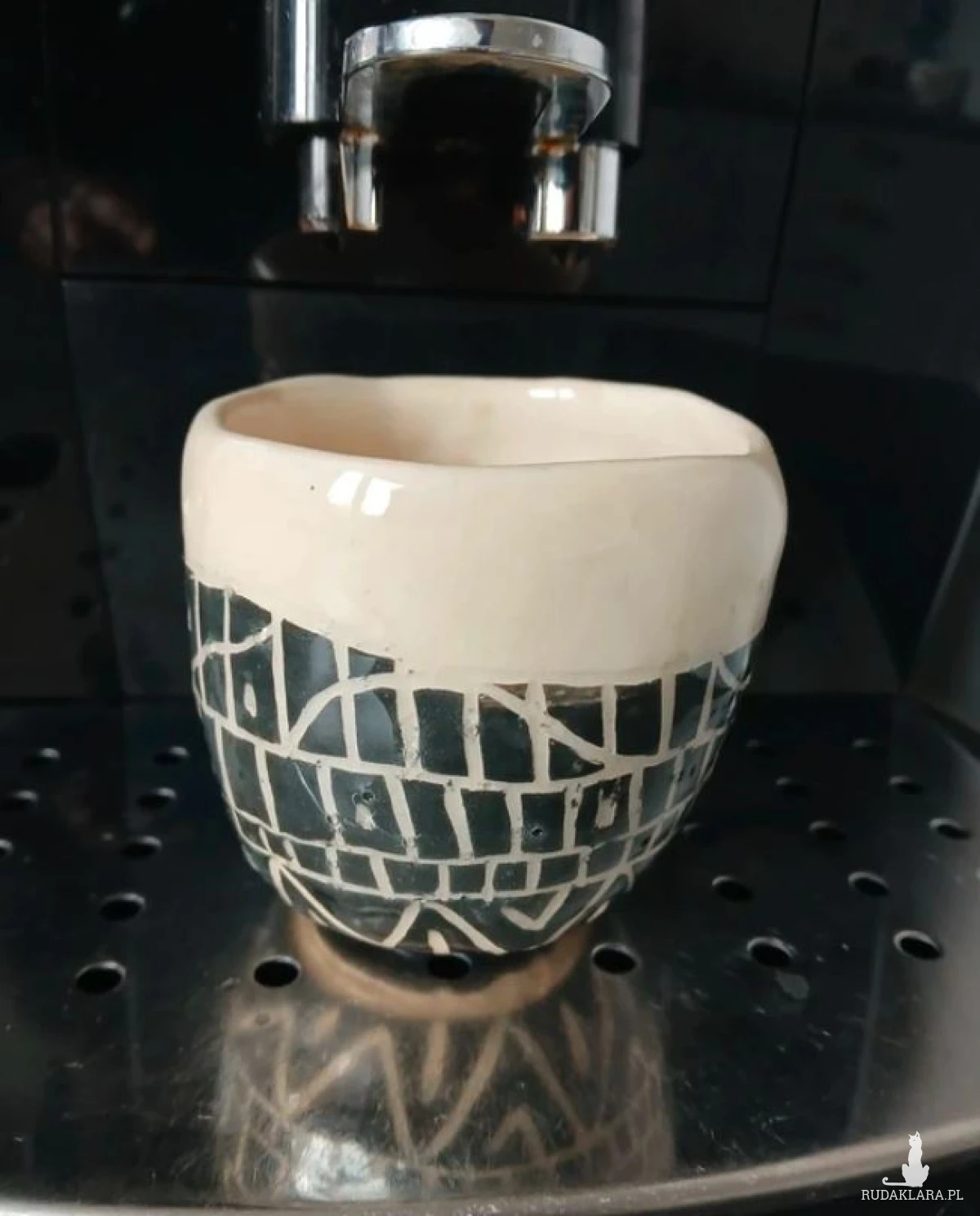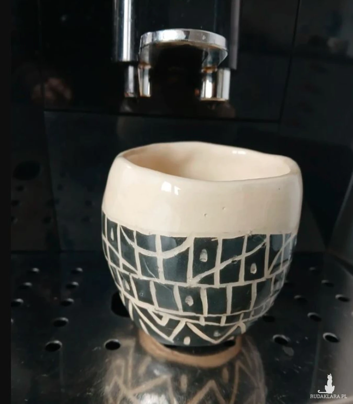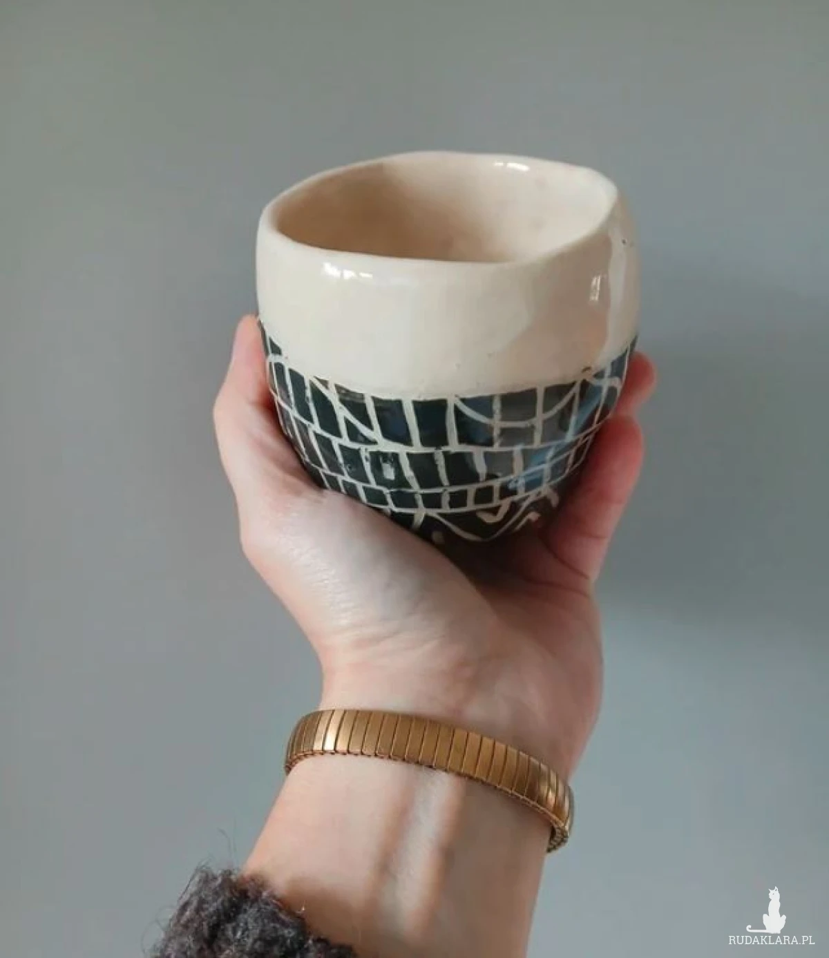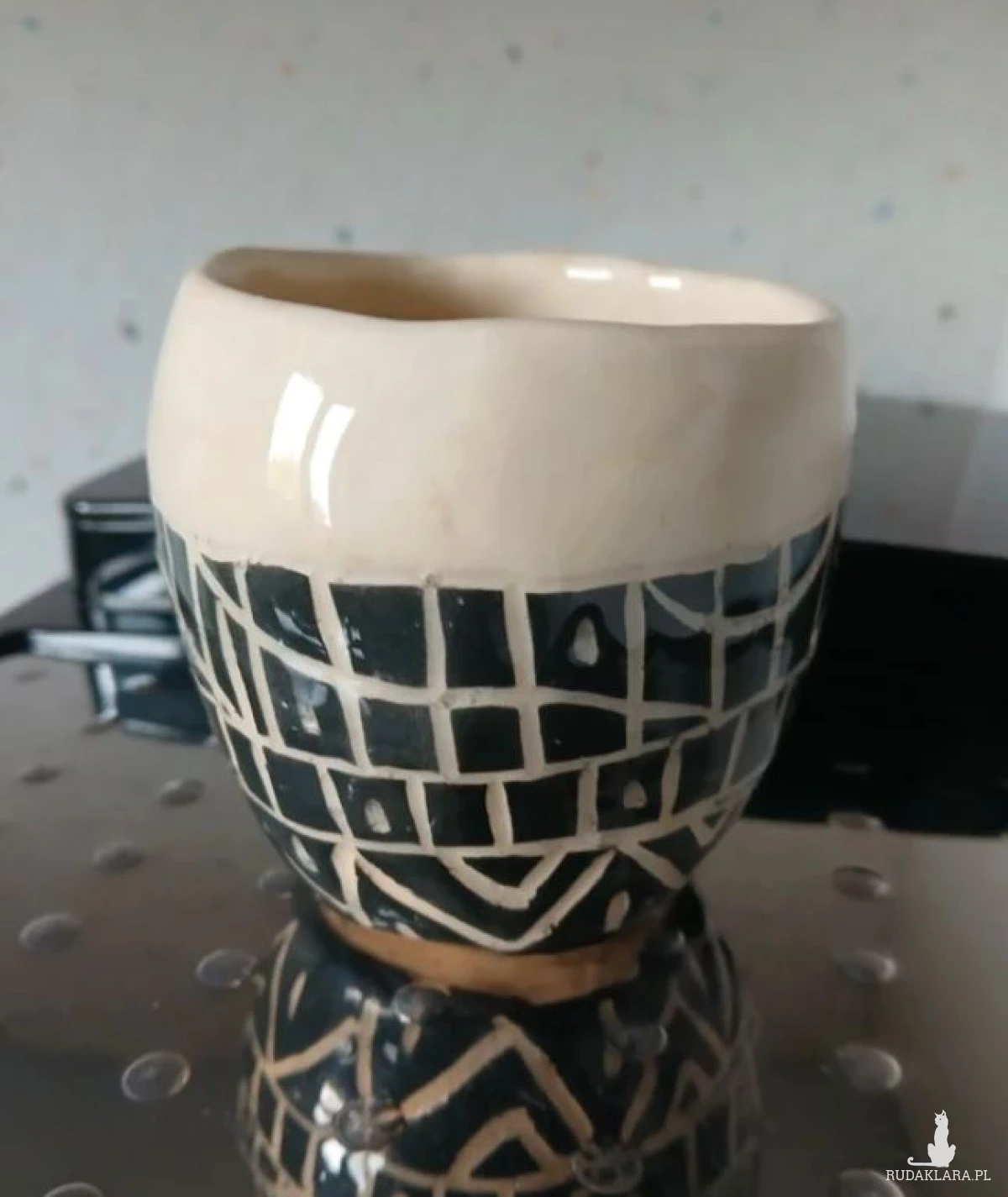 Ceramiczna czarka unikat gliniany kubek bez ucha na kawkę lub do japońskiej ceremonii picia herbaty (chawan, matchawan) lub matchy, dekorowany metodą sgrafitto w geometryczny wzór japandi ceramiczna miseczka do matchy (matcha bowl) Pojemność 125ml Wysokość 8cm Średnica 7cm Primitive aztec peru ceramics graffiti matchawan goblet tea coffee mug no handle chawan japandi japaneese tea ritual matcha