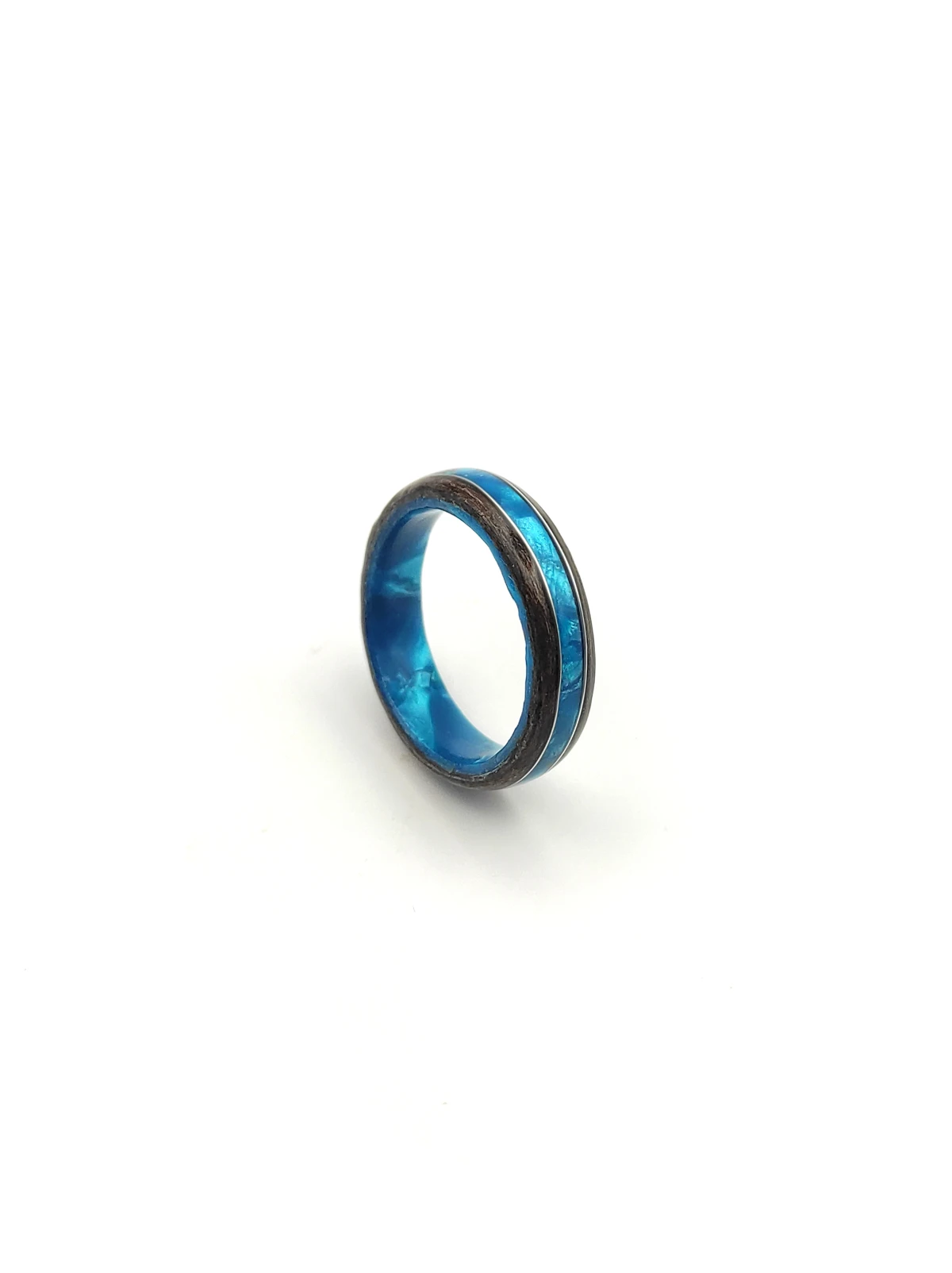 Pierścionek Błękitna Głębia to ręcznie wykonane połączenie forniru orzechowego z jasnoniebieskim celuoidem, przedzielone delikatnym ciemnym drucikiem.