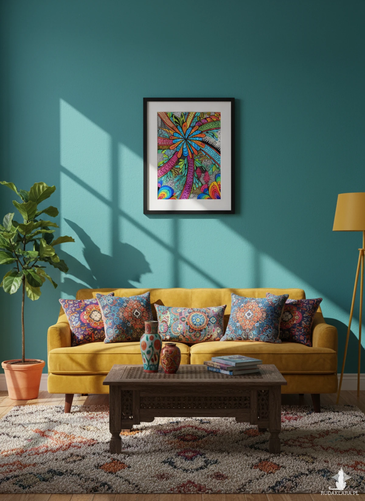 Chaotyczne, czarno-białe tło (jak skomplikowana codzienność) jest tu niemal wchłonięte przez ekspandujące, radosne pasma koloru. To wyraża triumf pozytywności – uczucie, że nawet w najbardziej skomplikowanym otoczeniu zawsze można odnaleźć drogę do barwnej, wewnętrznej radości.