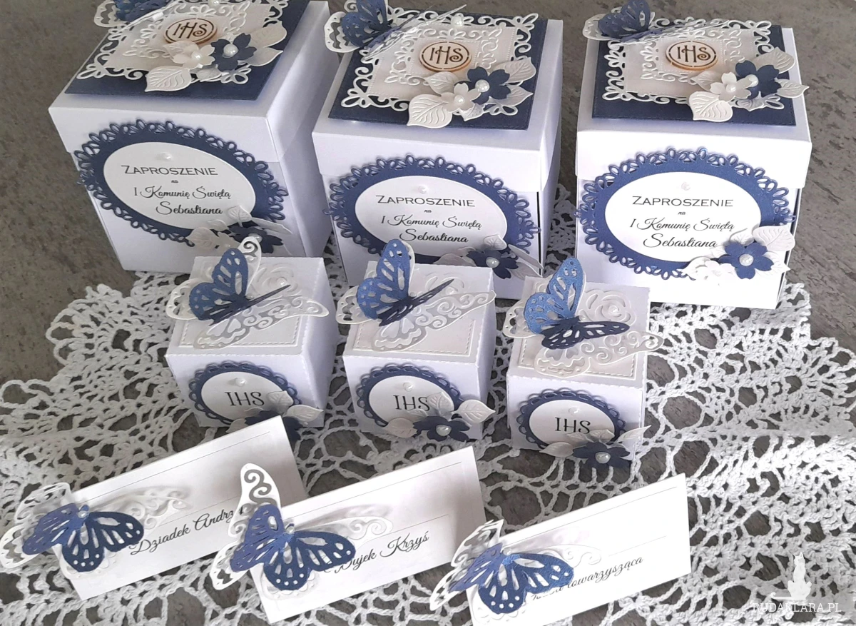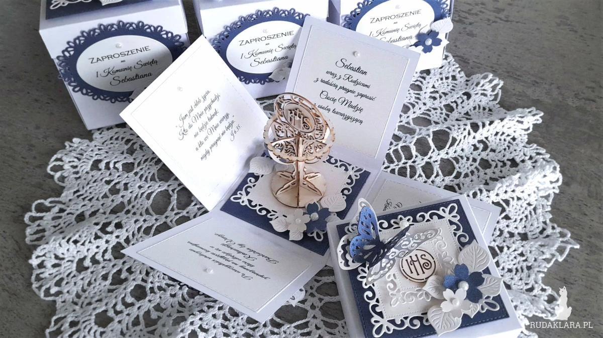 Pracownia Ładne Dekoracje wykona ręcznie robione oryginalne Zaproszenia komunijne w kształcie wybuchowych pudełeczek czyli exploding boxów.