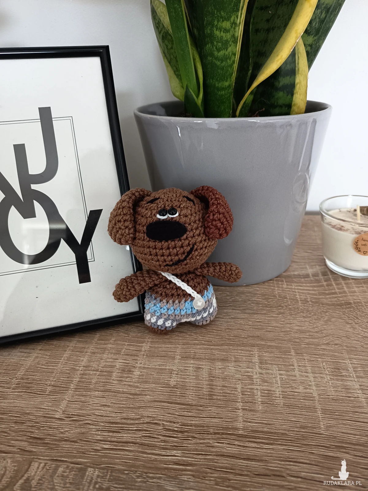 Brelok piesek szydełkowy w niebieskich spodenkach