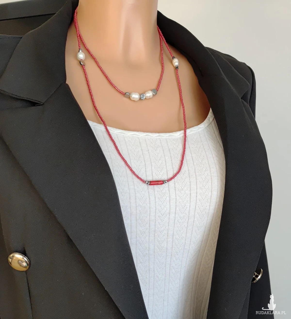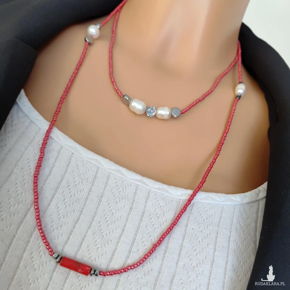Naszyjnik z bardzo drobnych koralików szklanych w czerwonym kolorze. Długi sznur z przekładkami z hematytu w formie różyczki i kulek,plasterków,dysków. Czerwone howlity. Cztery perły hodowlane 10 mm, dlugość sznura 2x52 cm
