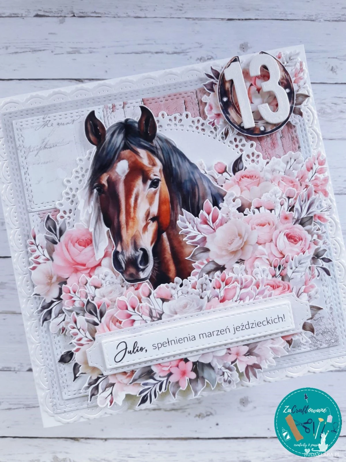 Warstwowa kartka urodzinowa dla pasjonatki koni z efektem 3D, wykonana metodą scrapbookingu.