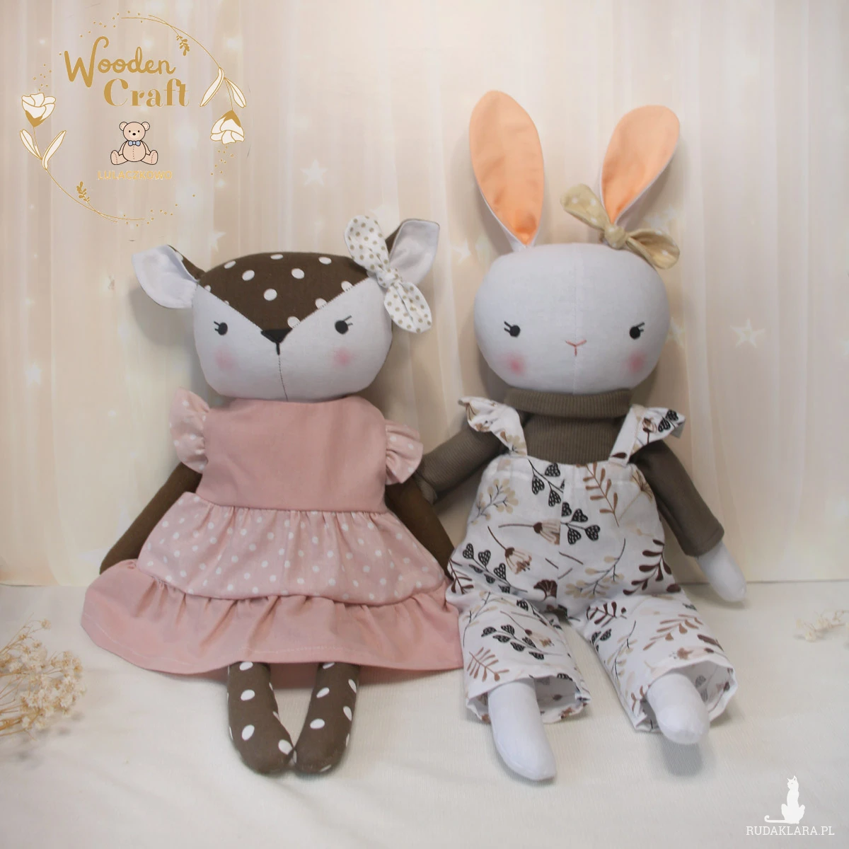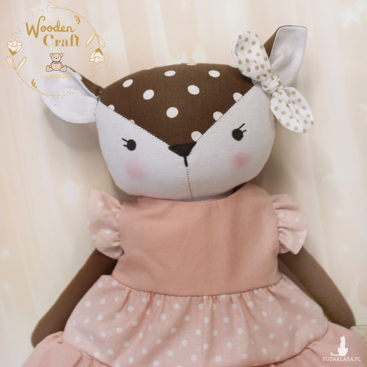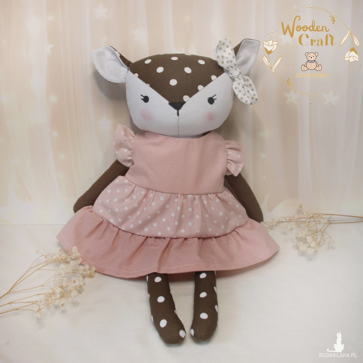 Przeurocza przytulanka, sarenka w wersji dziewczęcej, uszyta ręcznie z najwyższą starannością, ubrana w różową sukieneczkę w kropeczki, z falbankami. Wykonana ze 100% bawełny, wypełniona antyalergiczną kulką silikonową. Oczka i nosek malowane wodoodpornym markerem. Sukieneczkę można swobodnie zdejmować - jest zapinana na rzep. Górne i dolne łapki układają się luźno, sarenka siedzi z podparciem.