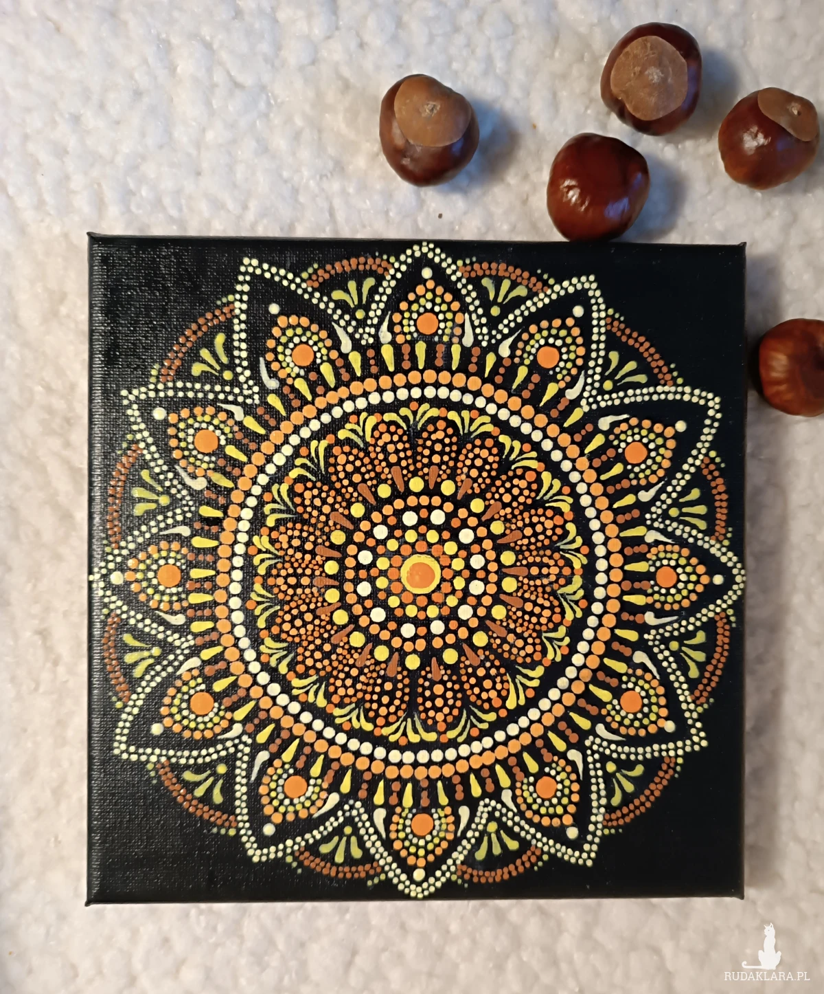 Obraz malowany ręcznie na płótnie farbami metodą kropkowania. Przedstawia motyw mandali w ciepłych kolorach z dominacją żółtych barw. Mandala ma pozytywny wpływ na nasz układ nerwowy. Kontemplacja mandali rozwija naszą koncentrację, uspokaja i pobudza do pracy obie półkule mózgowe.Obraz ociepli swoimi barwami wnętrze i będzie niebanalnym elementem dekoracyjnym. Wymiary 20 x 20.