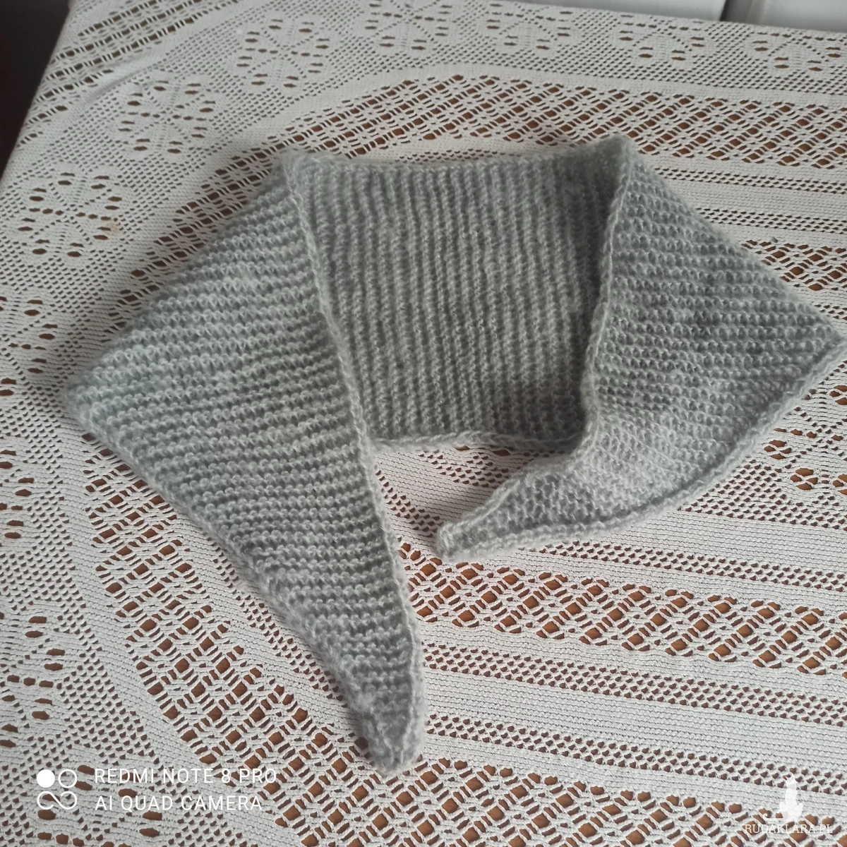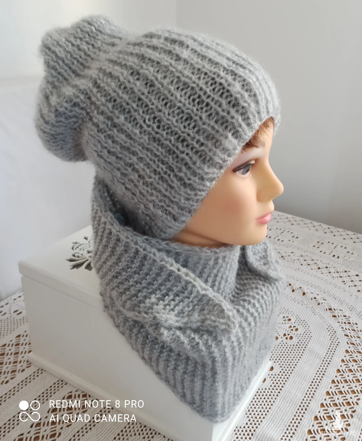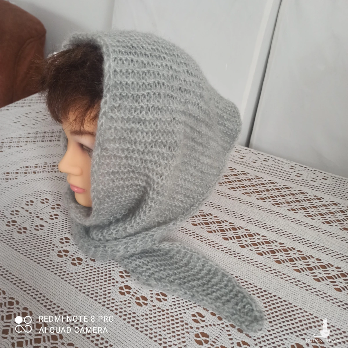 W komplecie czapka i szalik lub chusta /wedle uznania/w jasnoszarym kolorze wykonany na drutach z wełny Carlotta o składzie moher i polyacryl. Wyrób bardzo delikatny, lekki, mięciutki i bardzo przyjemny w dotyku. Czapka wykonana wzorem ściągaczowym jedno oczko lewe jedno prawe, obwód bez rozciągania 42 cm, wysokość czapki 30 cm. Czapka jest wysoka, umożliwiająca wywijanie , marszczenie, noszenie a la Smerfetka itp. Szalik lub chusta wykonany w takim kształcie by można go dwojako używać. Najszerszy pośrodku 25 cm, zwęża się w obu kierunkach. Całkowita długość 116 cm. Nie rozciąga się ale jest podatny na wydłużenie. Przy różnej pogodzie można wykorzystać wyrób jako tradycyjny szalik, chusta na bluzkę lub chusta bezpośrednio na głowę lub na czapkę z daszkiem. Doskonały dodatek na chłodniejszą lub nawet zimną pogodę. Kolor bardzo modny. Wykonany na drutach prawymi oczkami ściegiem francuskim. Doradzam pranie wyłącznie ręczne, w temperaturze do 30 stopni. Gorąco polecam, niska cena.
