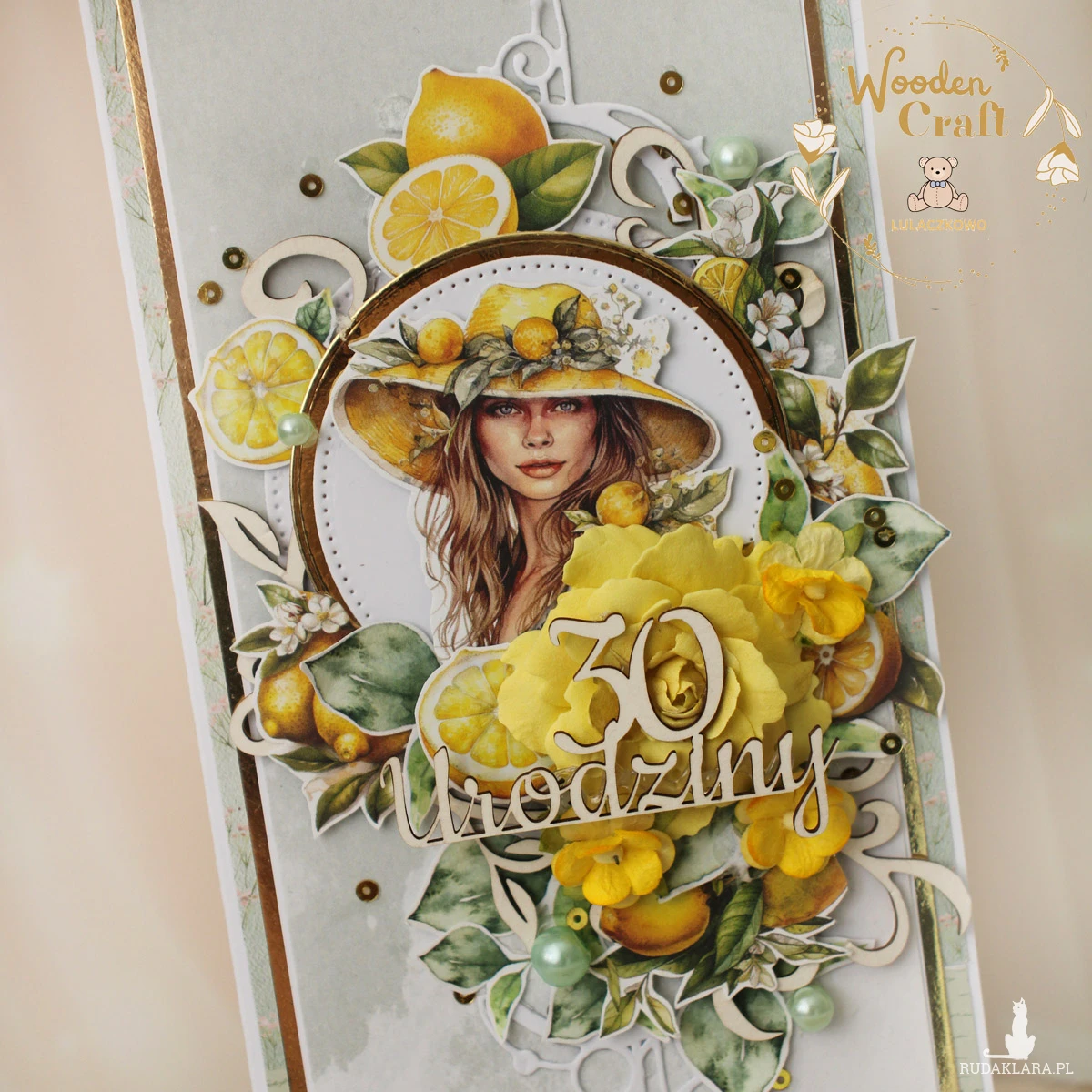 Piękna i nietuzinkowa kartka urodzinowa dla kobiety, utrzymana w odcieniach jasnej zieleni, cytryny i bieli, z dodatkiem złotych błyszczących akcentów, bogato zdobiona licznymi grafikami cytryn oraz kobiety w kapeluszu, udekorowana ręcznie robioną foamiranową różą, a także połyskującymi, złotymi cekinami oraz tekturkowym napisem "30 Urodziny".