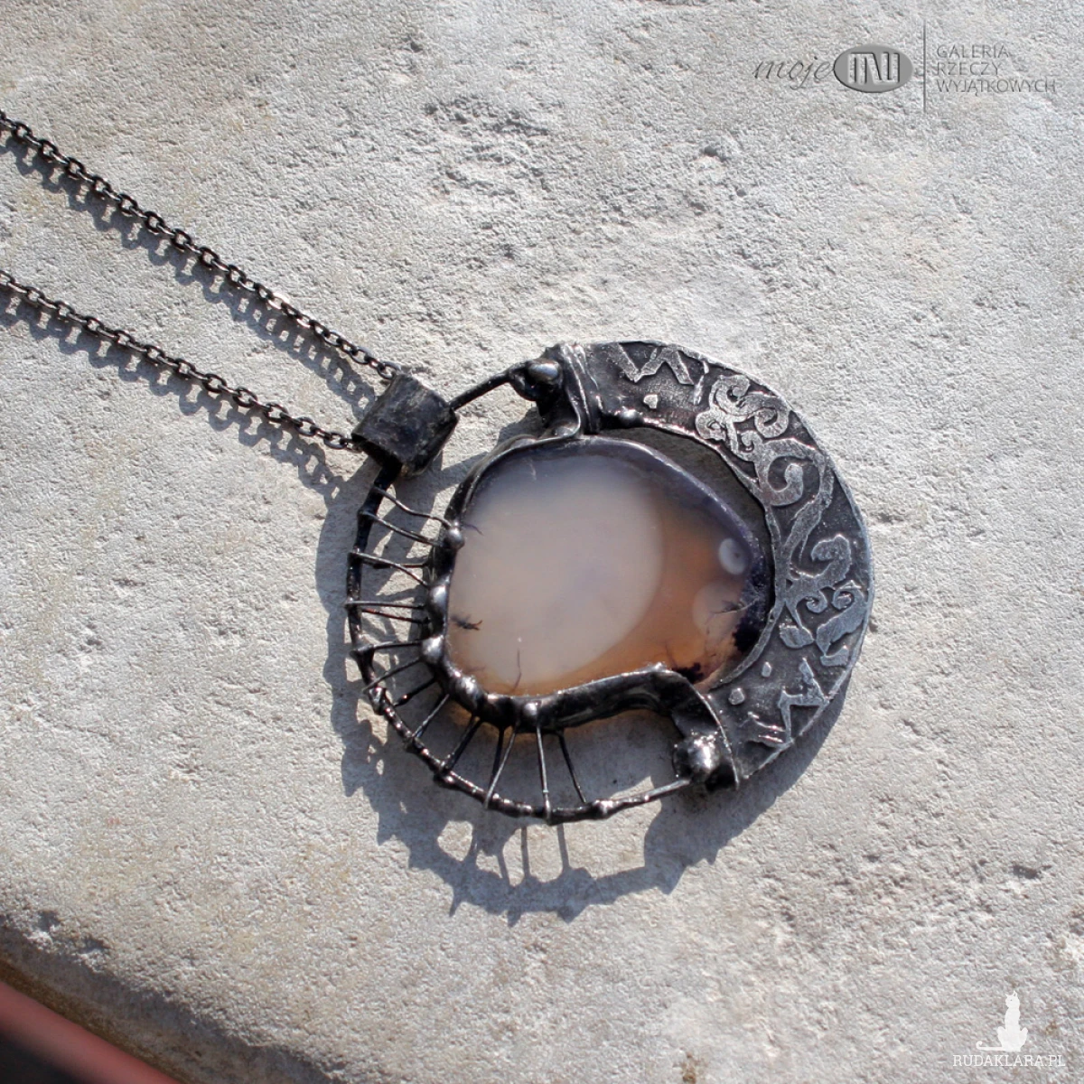 Dwustronny wisior z plastra agatu i miedzi. Agat jest w stonowanym brązowo-beżowym kolorze. Oprawiony i wykończony jest miedzią - cynowaną, patynowaną i przecieraną. Jest zawieszony jest na łańcuszku w kolorze grafitowym. Zazwyczaj dodaję łańcuszek o długości ok. 60-70 cm, ale klient może podać długość, która go interesuje.