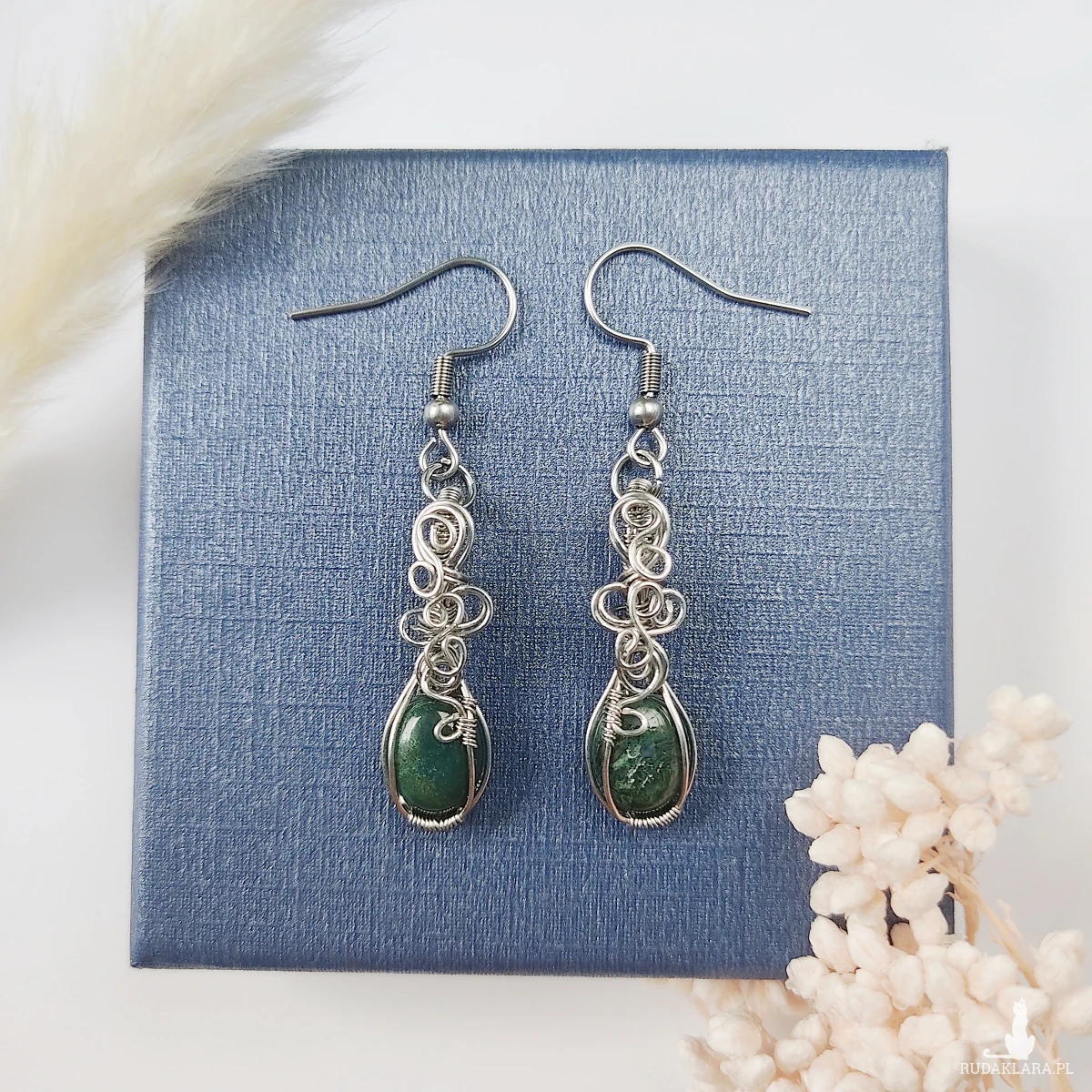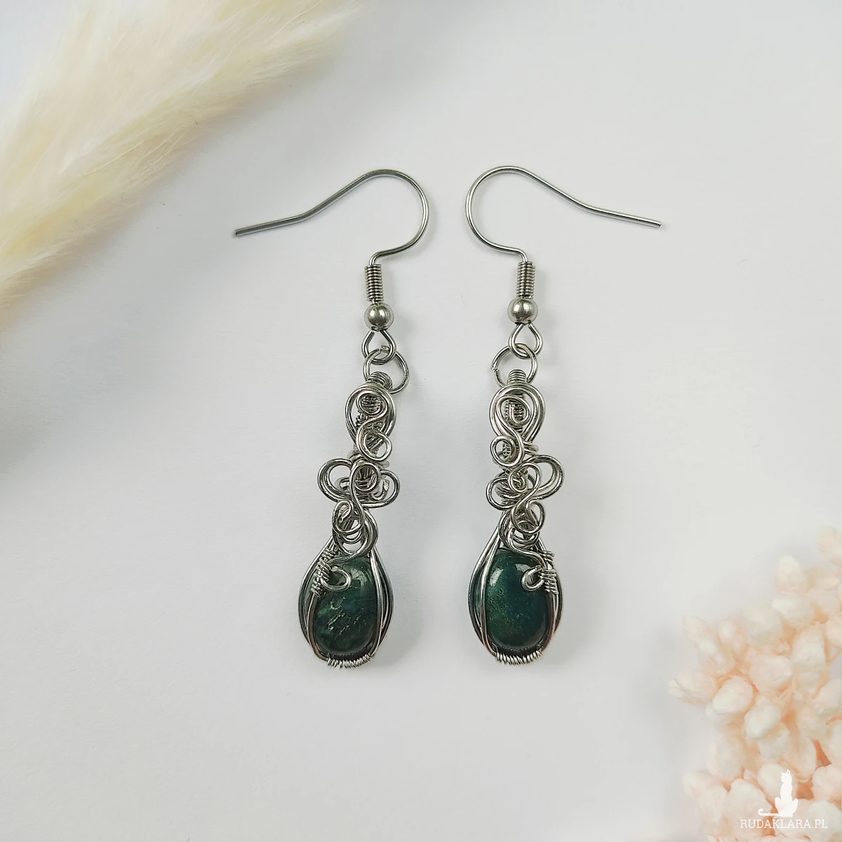 Kolczyki Agat Mszysty ręcznie robione. Wykonane techniką wirewrapping z drutów ze stali chirurgicznej.