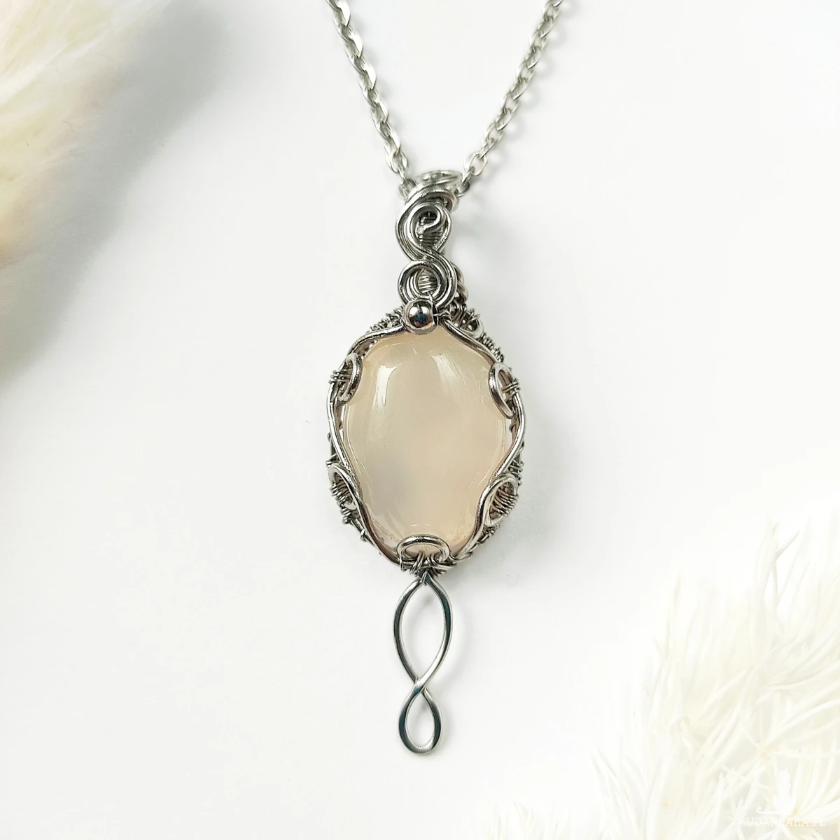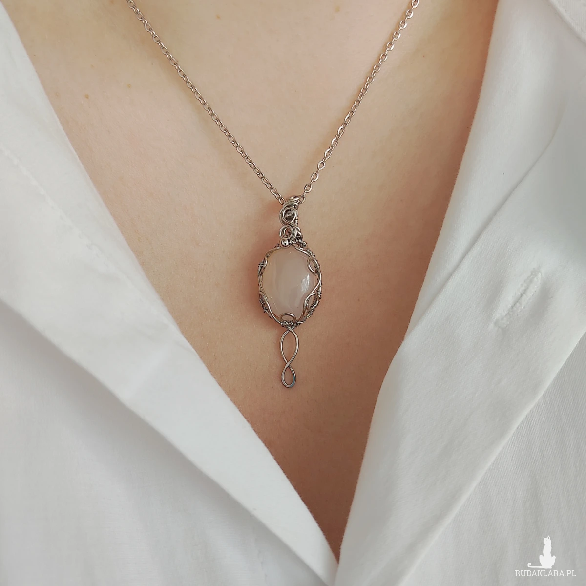Naszyjnik Vilya to połączenie elegancji, magii i rękodzielniczej precyzji. Wykonany metodą wire wrapping z najwyższej jakości stali chirurgicznej, został ozdobiony subtelnym kamieniem półszlachetnym – chalcedonem, znanym ze swojego mlecznego blasku i harmonizującej energii. Ten wyjątkowy naszyjnik inspirowany elficką biżuterią zachwyca lekkością, finezją i symbolicznym znaczeniem.