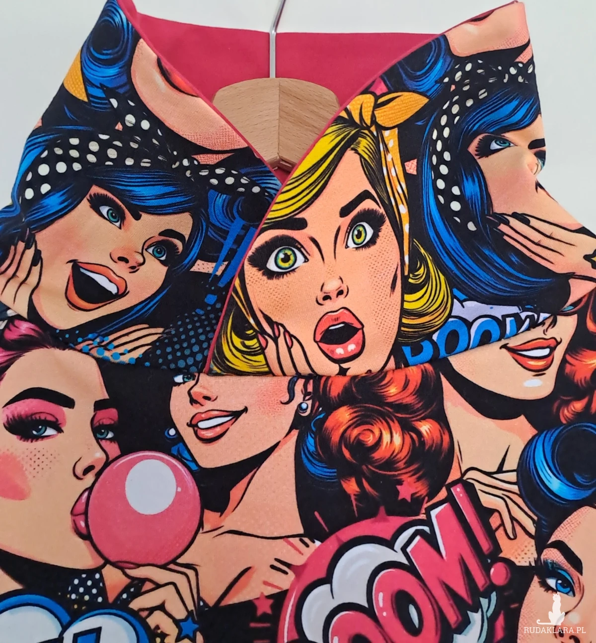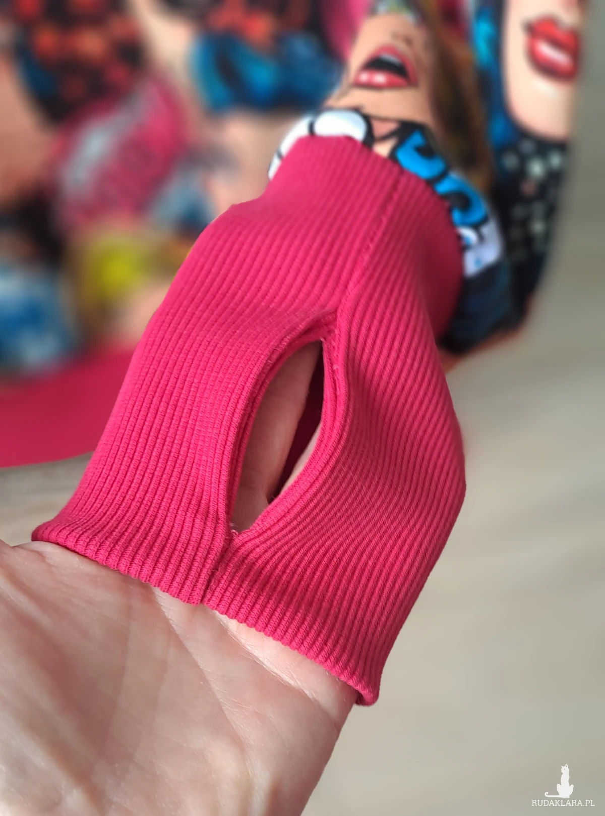 Bluza jest uszyta z dresówki pętelki. Świetny wzór, żywe kolory. Bluza ma komin, opuszczona linia ramion, ściągacz na rękawie ma otwór na kciuk.