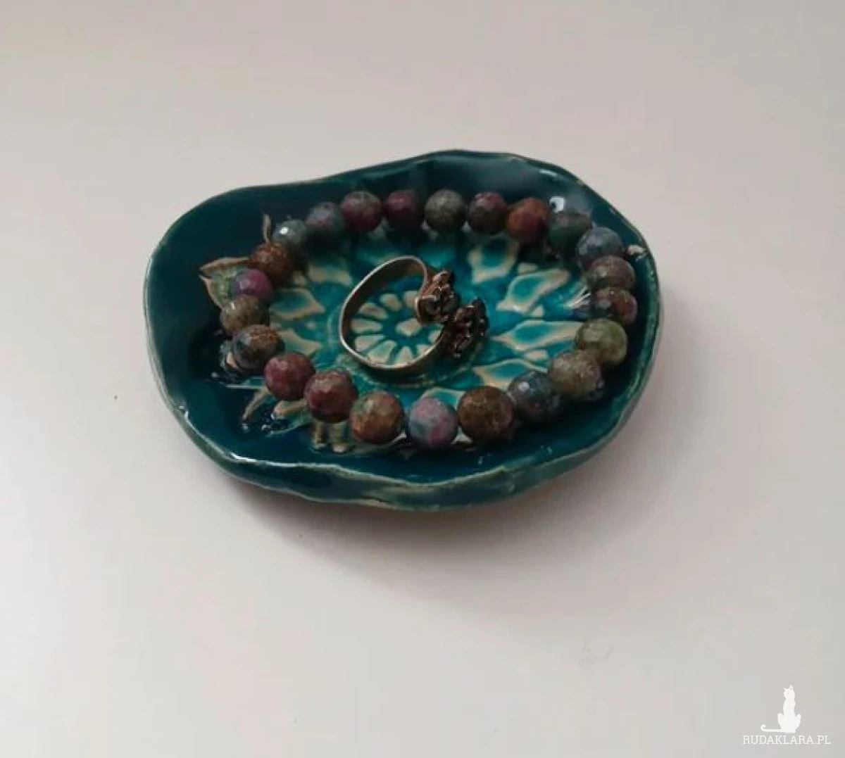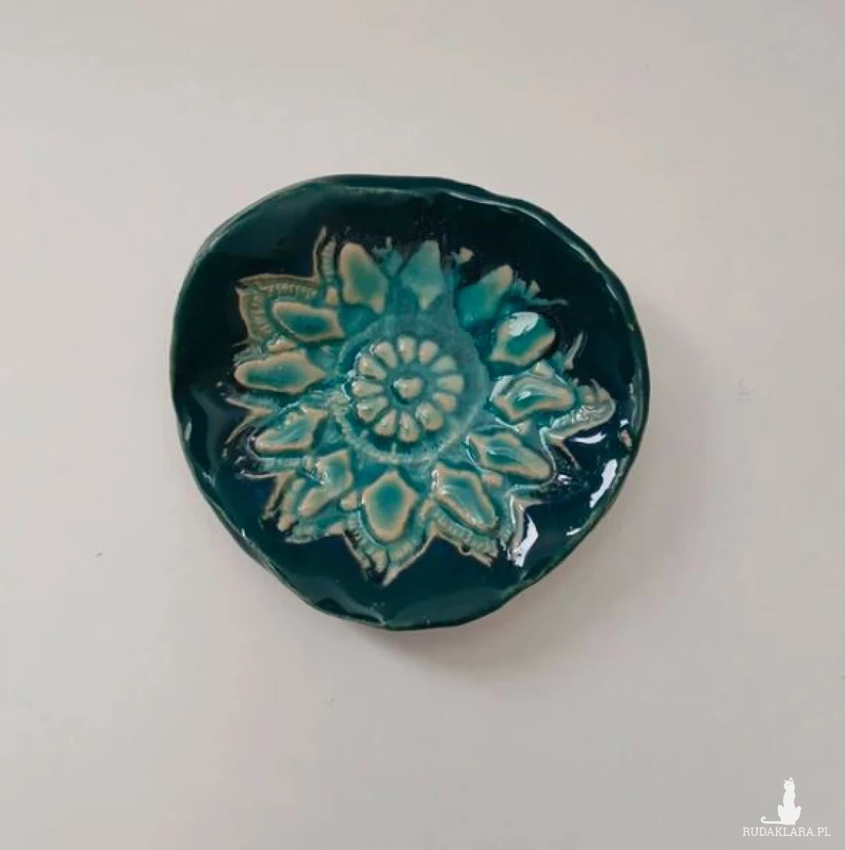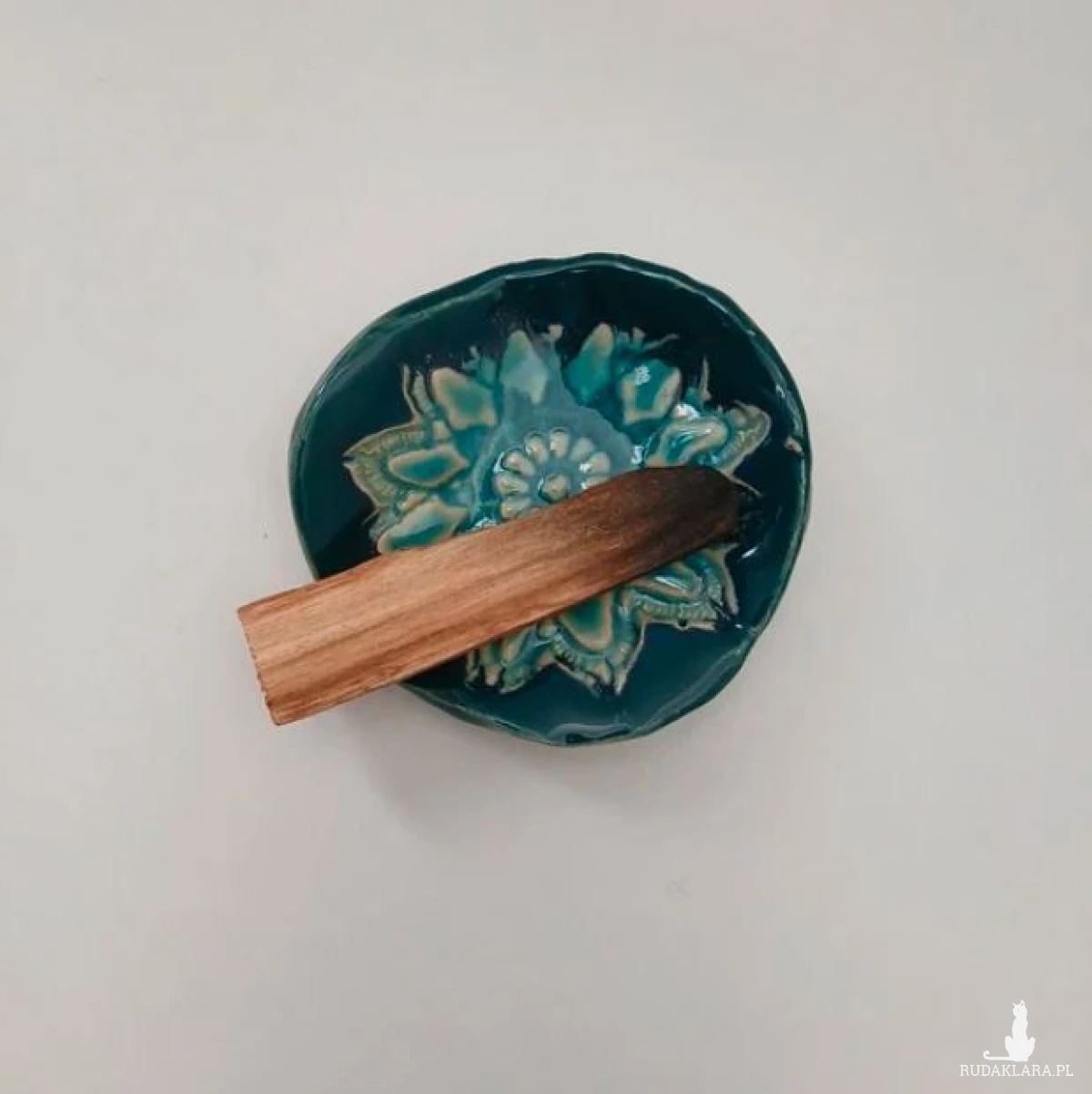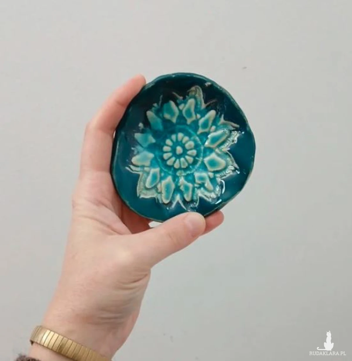 Ceramiczna podstawka na kadzidełko, palo santo, miseczka na biżuterię, tłoczona boho mandala, koronka, świecznik stojak na tealight, mały talerzyk z koronką, podkładka na obrączki w stylu rustykalnym Wymiary: średnica ok 8-9cm Ręcznie robiona gliniana ceramika artystyczna galeria sztuki.