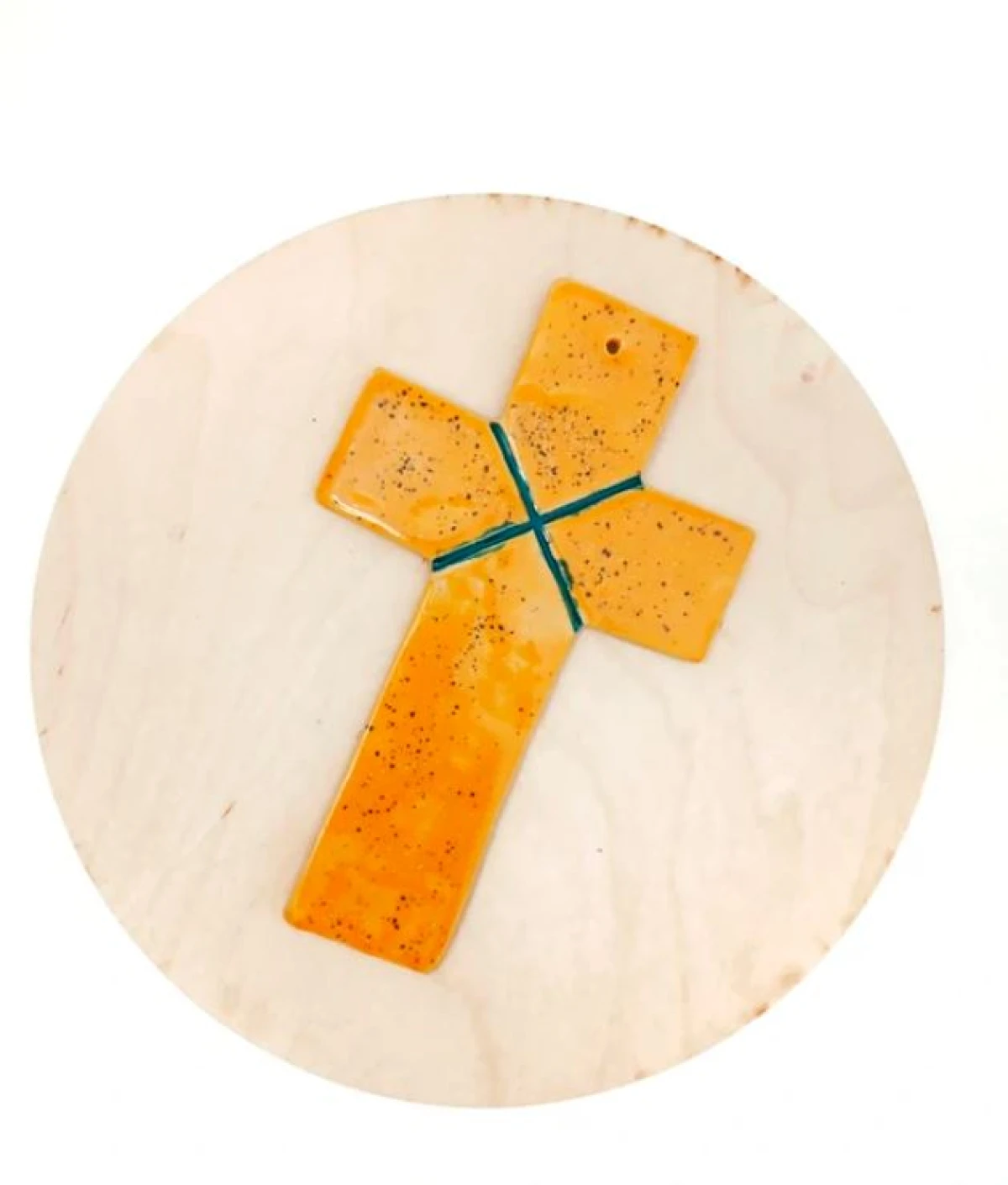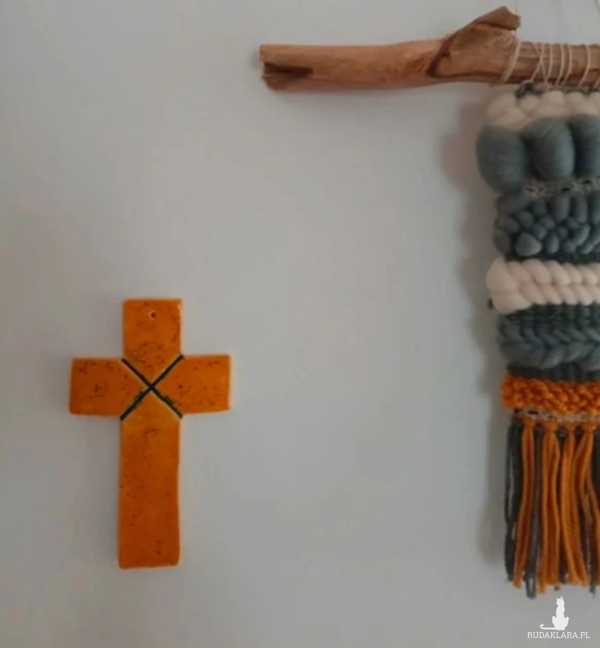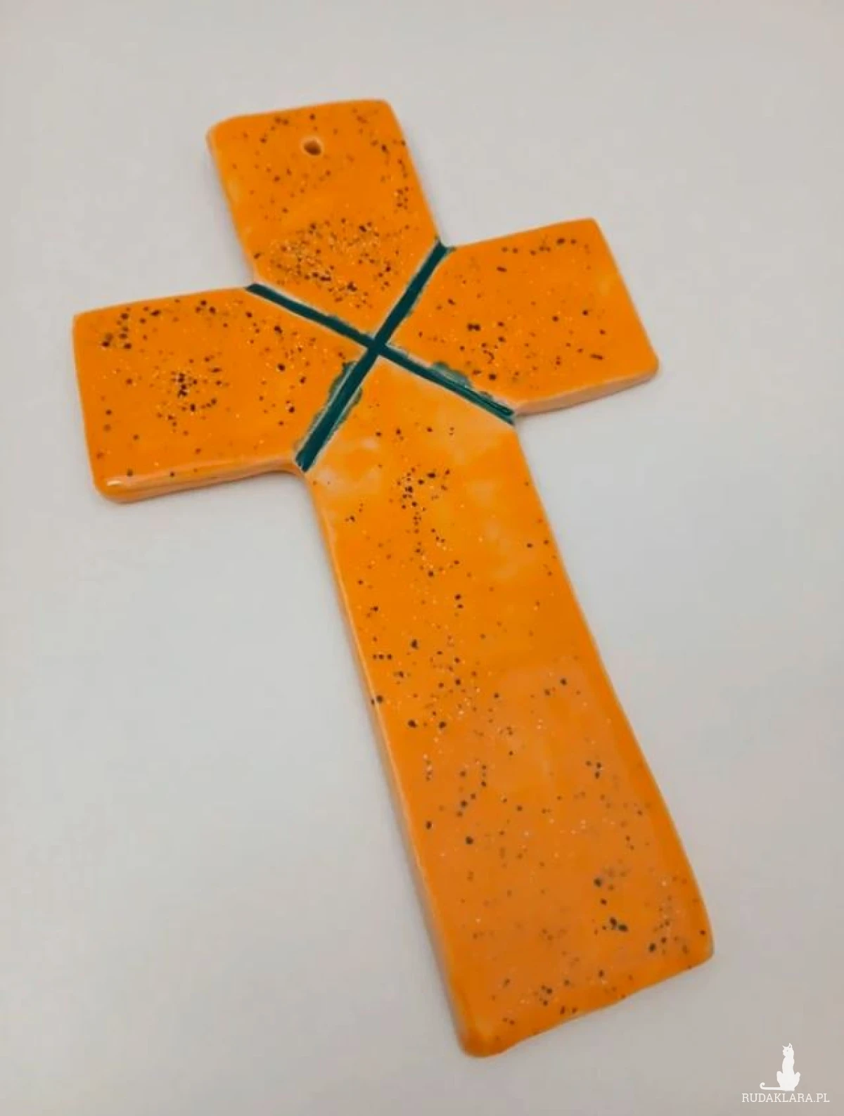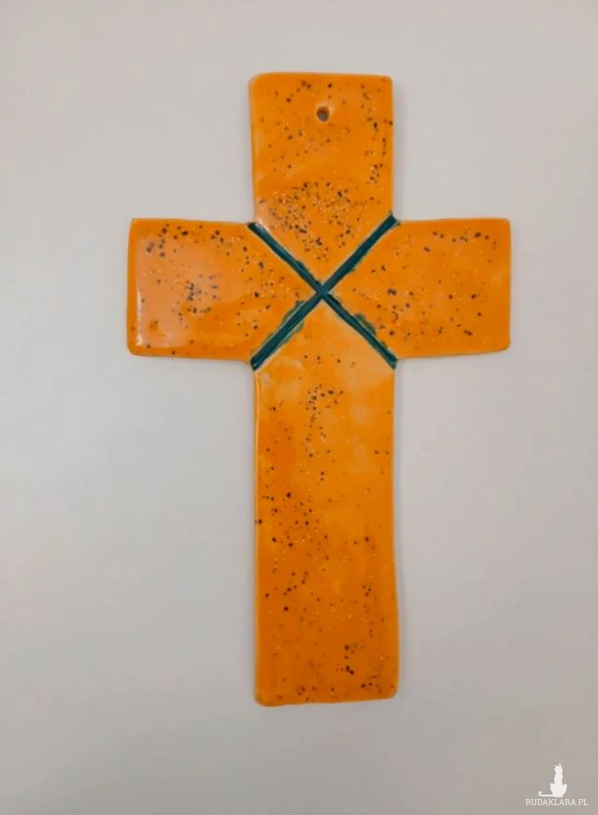 Kolorowy ceramiczny krzyż, gliniany krzyżyk do powieszenia na ścianie 19x11.5cm.