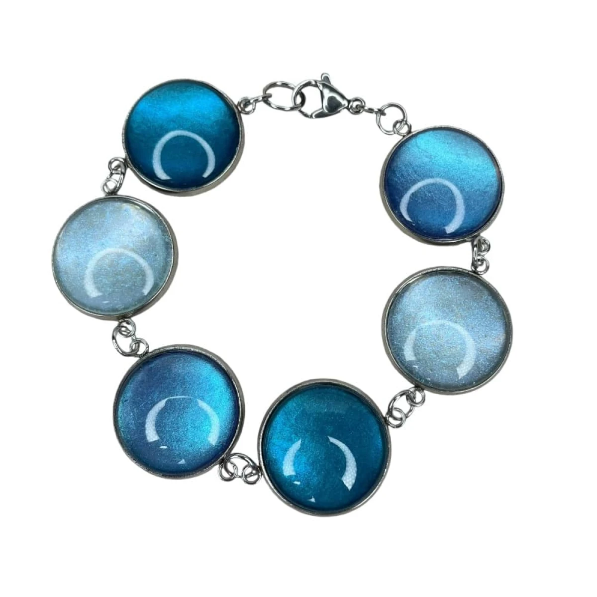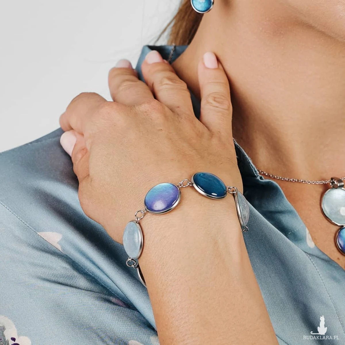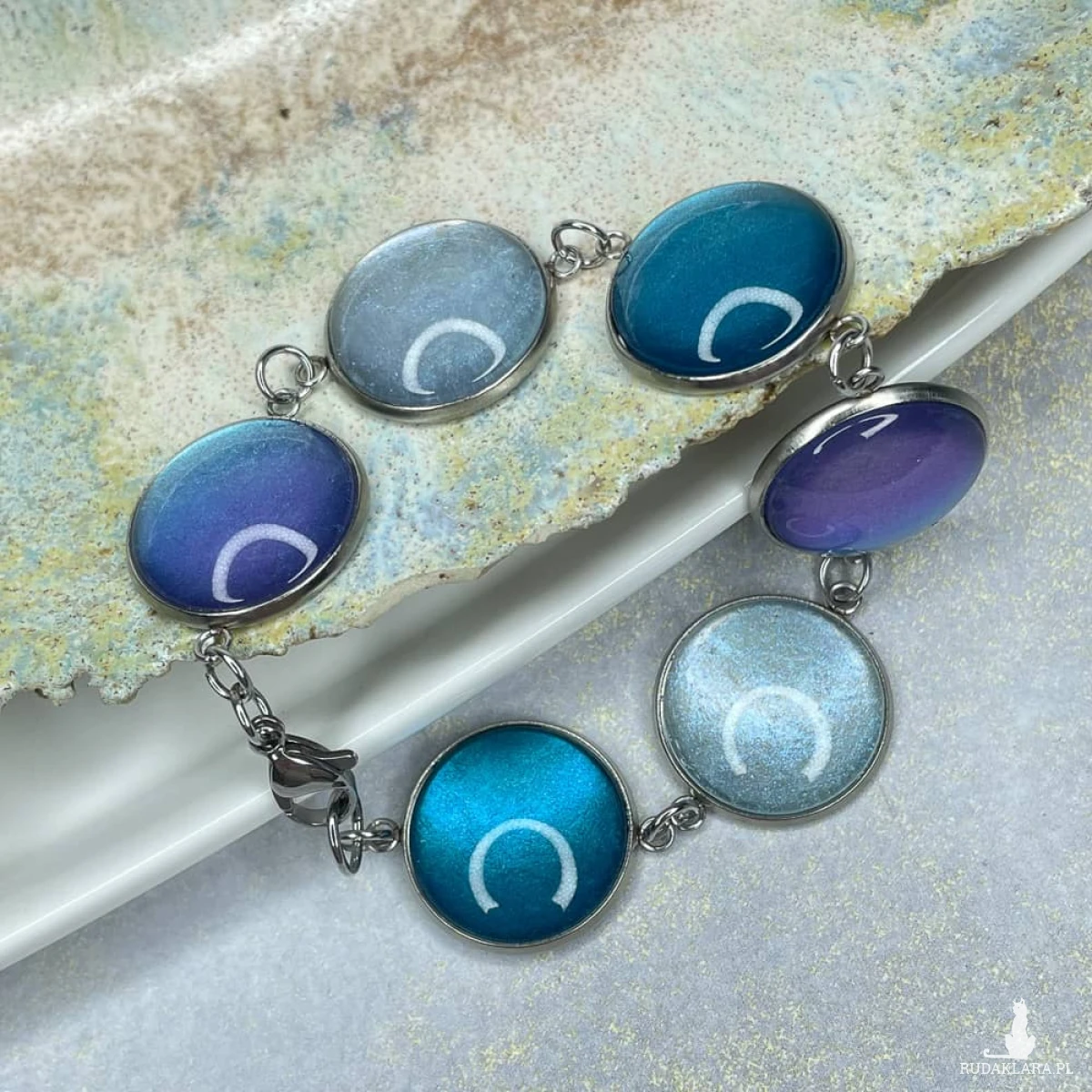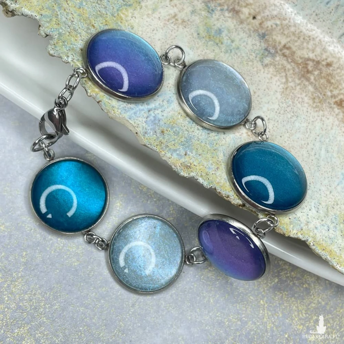 Ta pełna blasku bransoletka jest częścią kolekcji “W blasku perłowego księżyca”. Bransoletka wykonana jest z ręcznie malowanych kaboszonów umieszczonych w bazach ze stali szlachetnej. Szklane elementy zachwycają subtelnym, opalizującym blaskiem, który jest niczym odbicie księżyca na tafli wody. Bransoletka mieni się w świetle, przyciągając wzrok i dodając elegancji każdej stylizacji. Ten dodatek jest idealny dla osób ceniących sobie wyrafinowaną i ponadczasową biżuterię. Materiał: stal szlachetna, malowane ręcznie szkło Wykończenie: połysk Długość bransoletki: ok 20 cm Średnica kaboszonu: 18 mm Waga bransoletki: ok 14,5 g SKU: e32/m31 Jak dobierać komplety? Kolory na zdjęciach mogą się różnić ze względów technicznych. Aby dobrać identyczny odcień, zwróć uwagę na numer SKU produktu. Pierwsza część to numer modelu, a numery po “/” to kolor, np. /17 oznacza morski perłowy. Produkty z tym samym SKU po "/" mają identyczny kolor. Dzięki temu możesz łatwo tworzyć komplety, mając pewność, że biżuteria jest w tym samym odcieniu. Stwórz własny komplet! Jeśli nie ma biżuterii w wybranym modelu lub kolorze którego szukasz, możesz ją zamówić indywidualnie. Wyślij do nas maila z nazwą, numerem modelu i kolorem, a my w miarę możliwości wykonamy biżuterię na zamówienie. Termin realizacji ustalamy indywidualnie. Biżuteria zostanie elegancko zapakowana. W przypadku zakupu kompletu, biżuteria zostanie zapakowana razem. Kolory na zdjęciach mogą delikatnie różnić się od rzeczywistych.