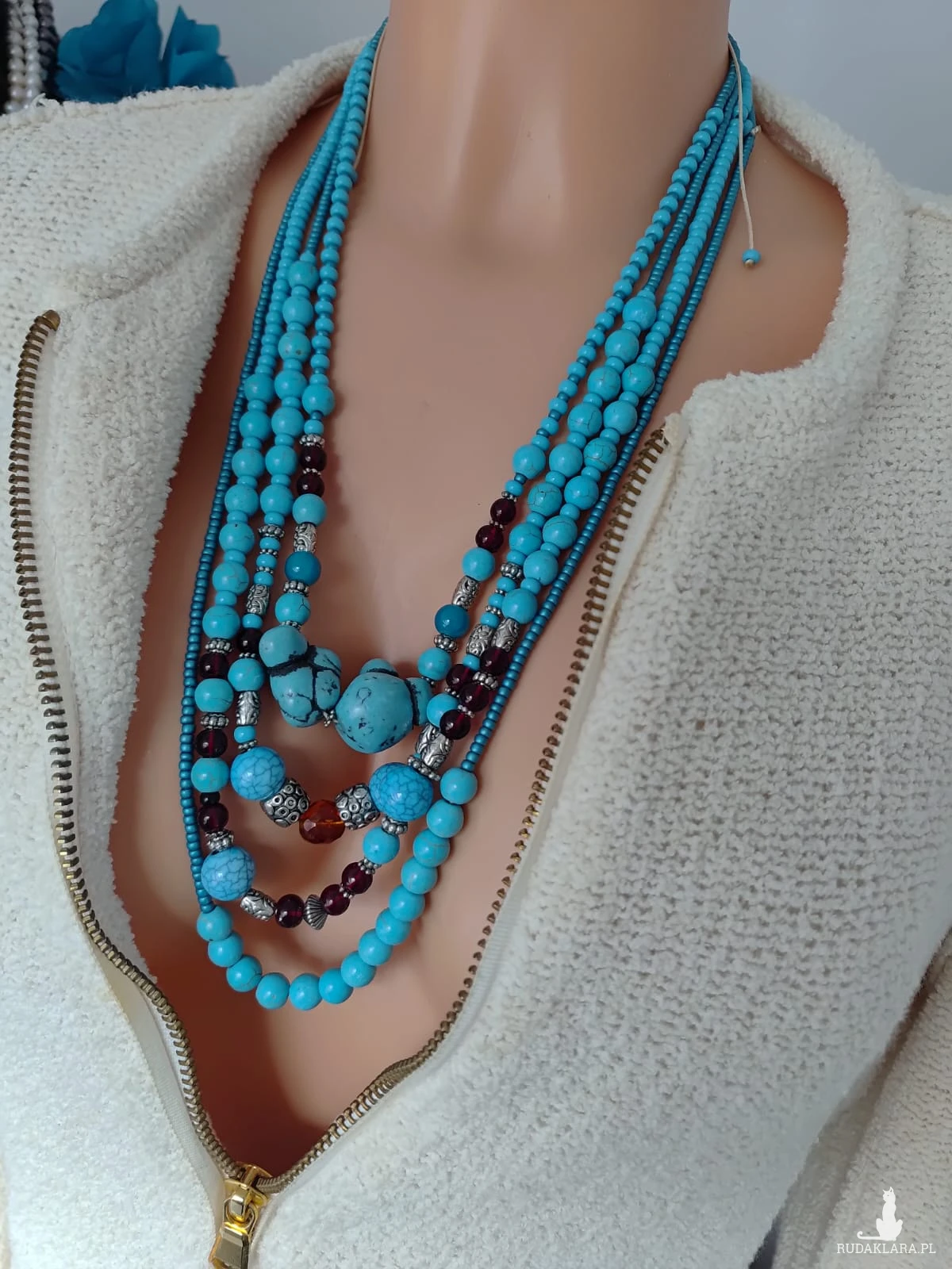 Naszyjnik długie korale. Na sznurku syntetycznym korale różne w kolorze turkusowym. Przekładki bali ozdobne metalowe nadają mu charakter orientalny. Koraliki brązowe, bordowe szklane. Można nosić oddzielnie kazdy sznur korali. Zapięcie wyplecione ściegiem makramy, mozna regulować długość każdego sznurka.