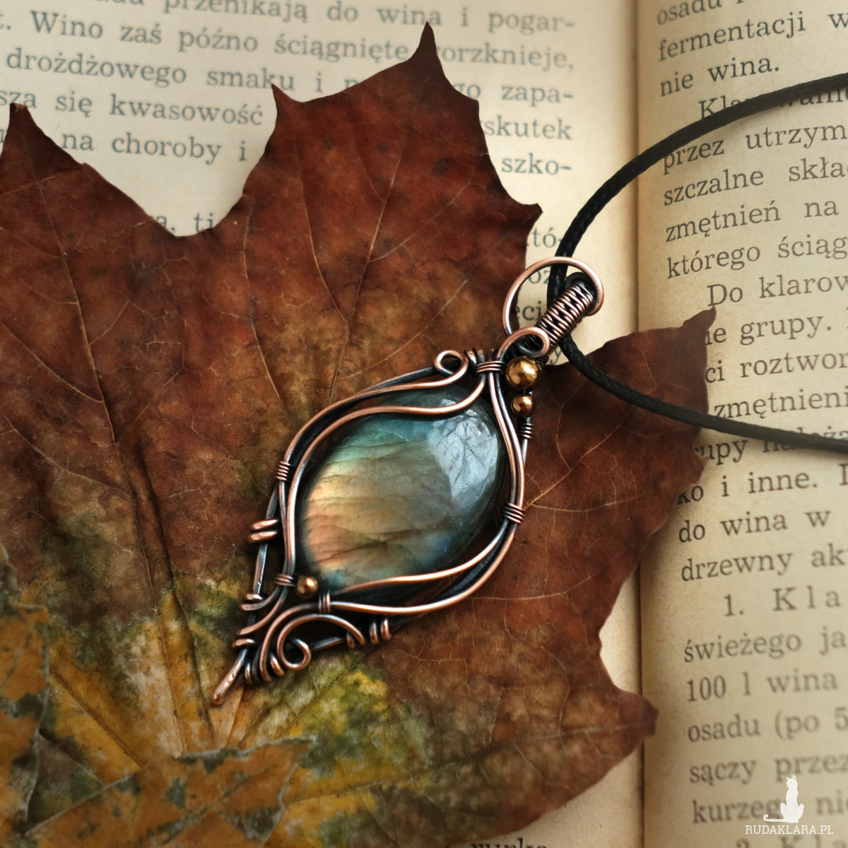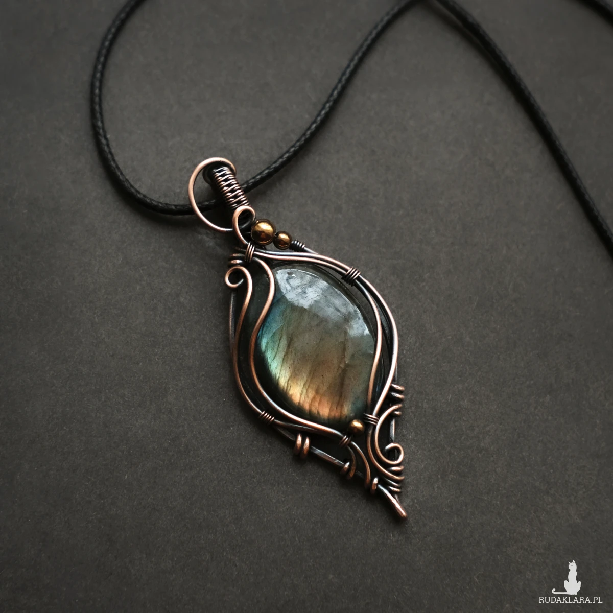 Piękny miedziany wisior w elfickim stylu z kamieniem labradorytu oraz koralikami hematytu. Labradoryt to wyjątkowy kamień, który kochają kobiety. Użyty w oprawie kamień iryzuje w kolorach brzoskwini, błękitu i zieleni.