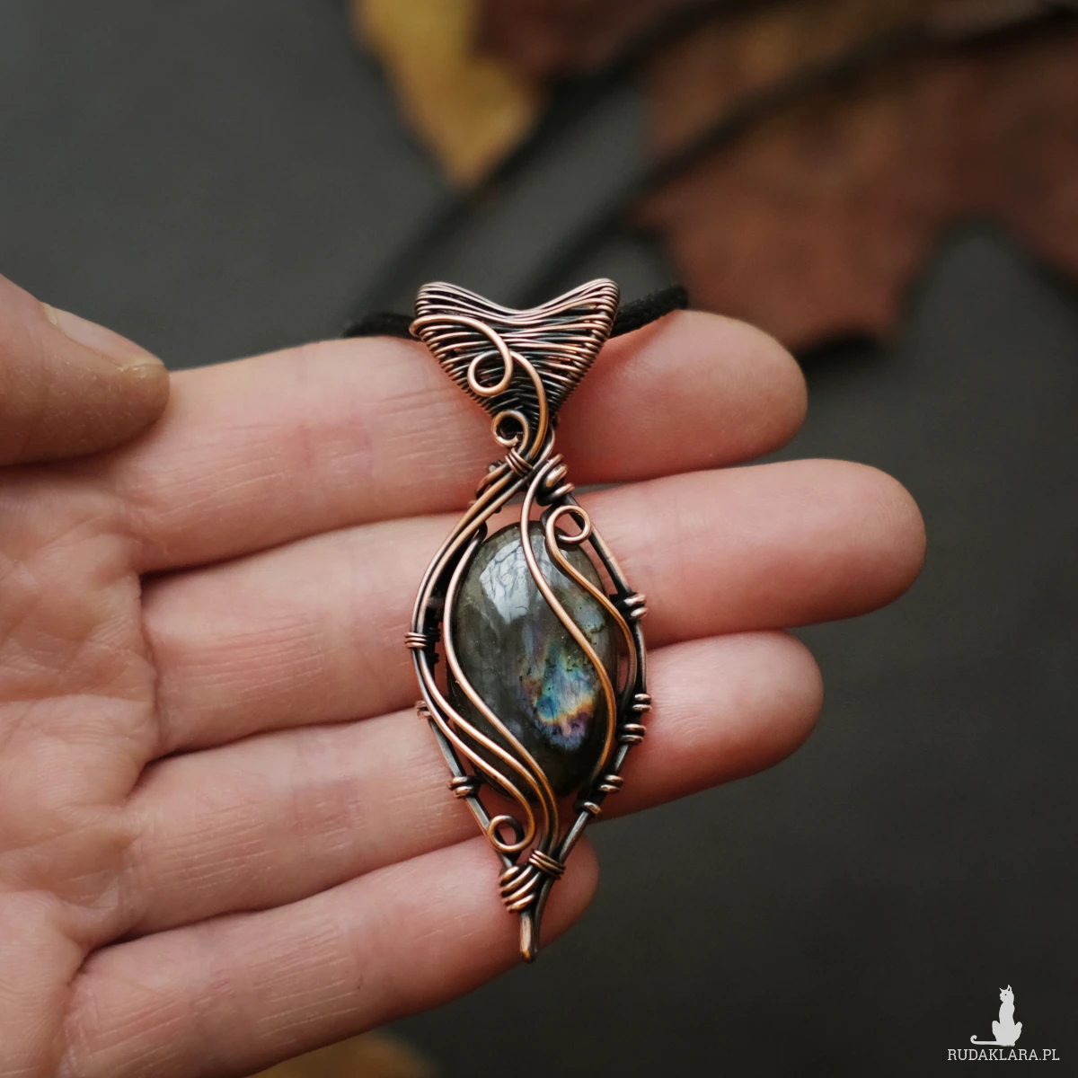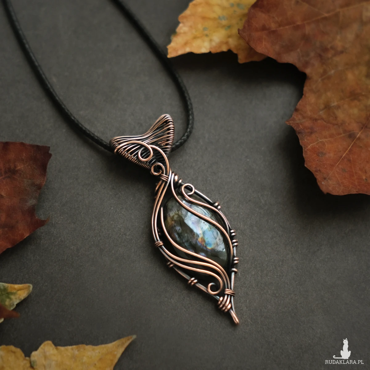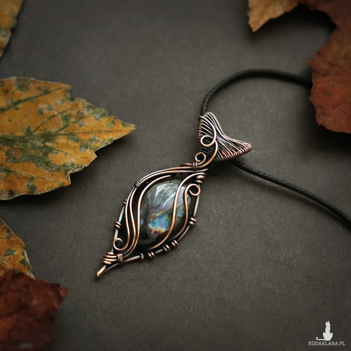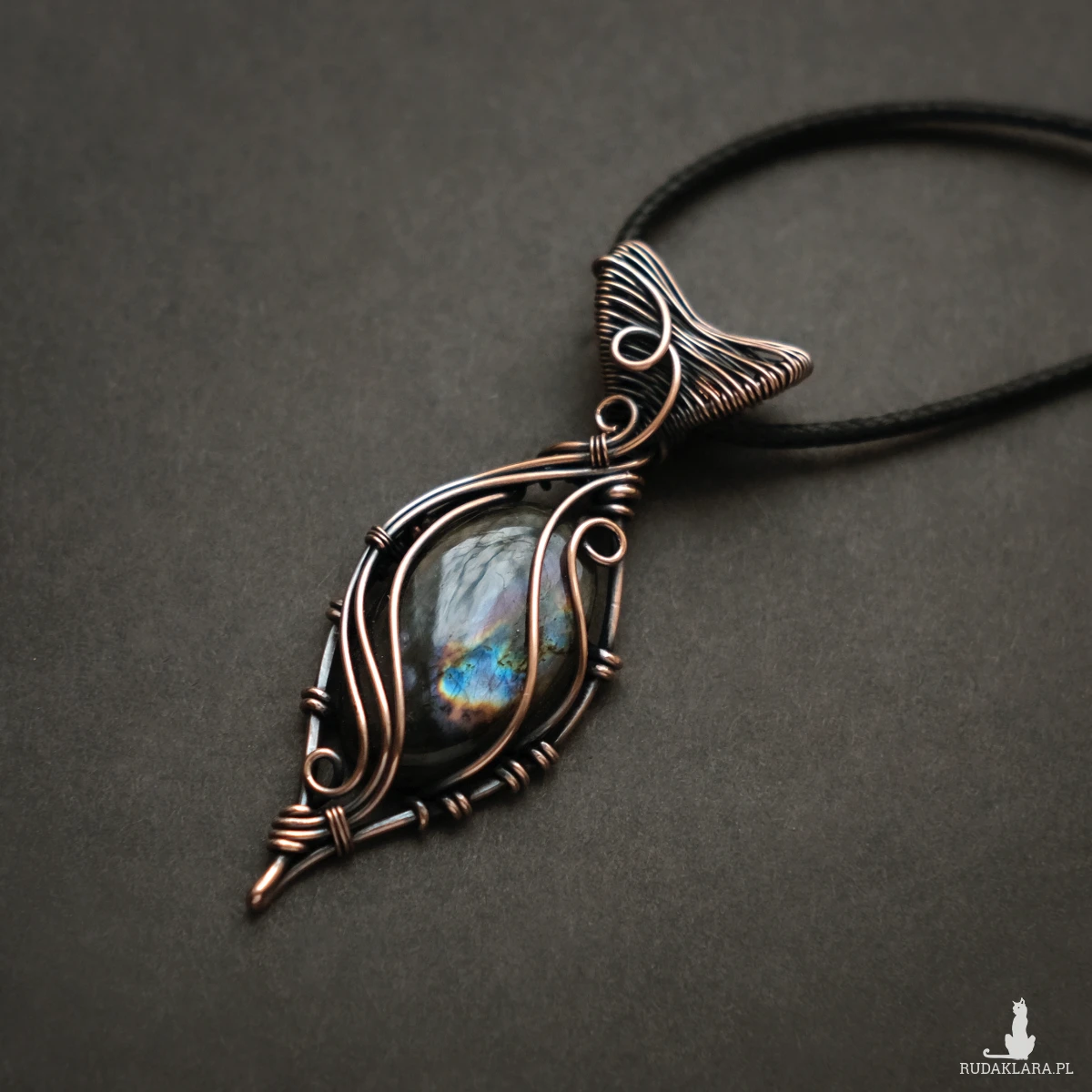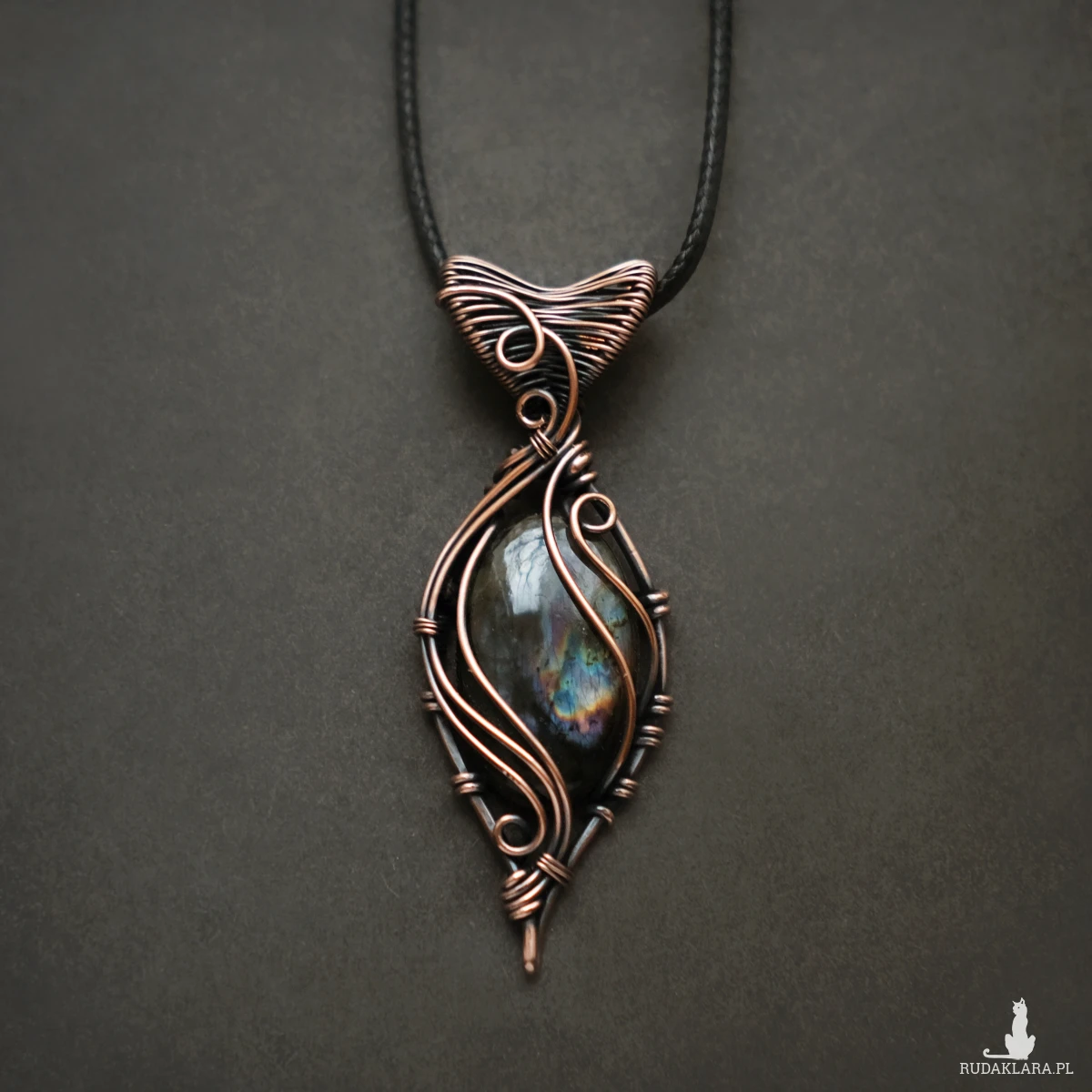 Piękny miedziany wisiorek w elfickim stylu z kamieniem labradorytu. Labradoryt to wyjątkowy kamień, który kochają kobiety. Użyty w oprawie kamień iryzuje w kolorach fioletu, błękitu oraz pomarańczu. Iryzacja jest delikatna, za to ma bardzo ciekawą grę wzorów.