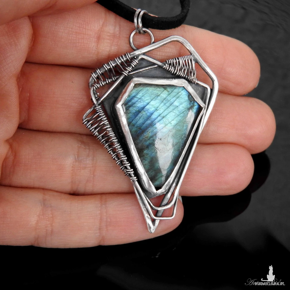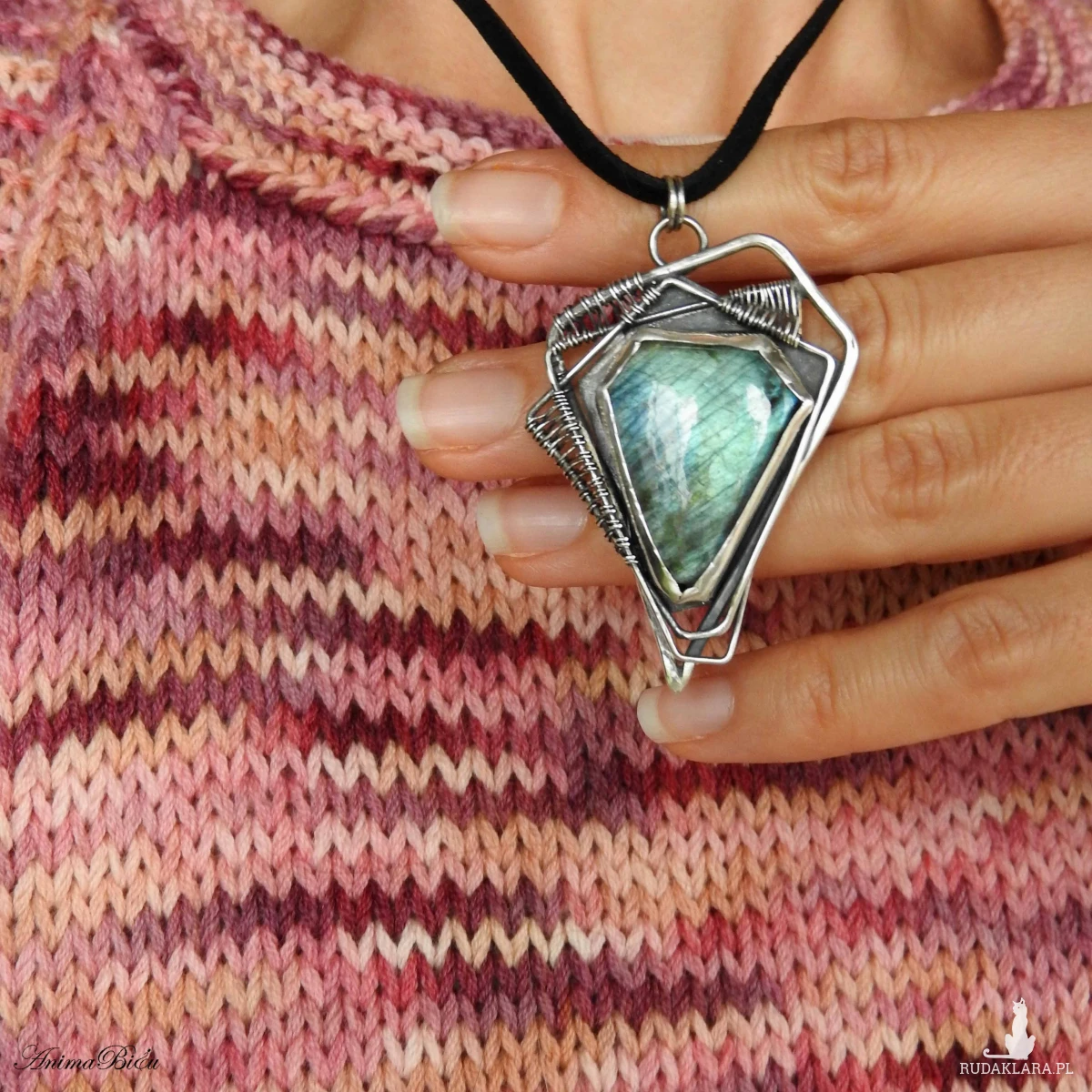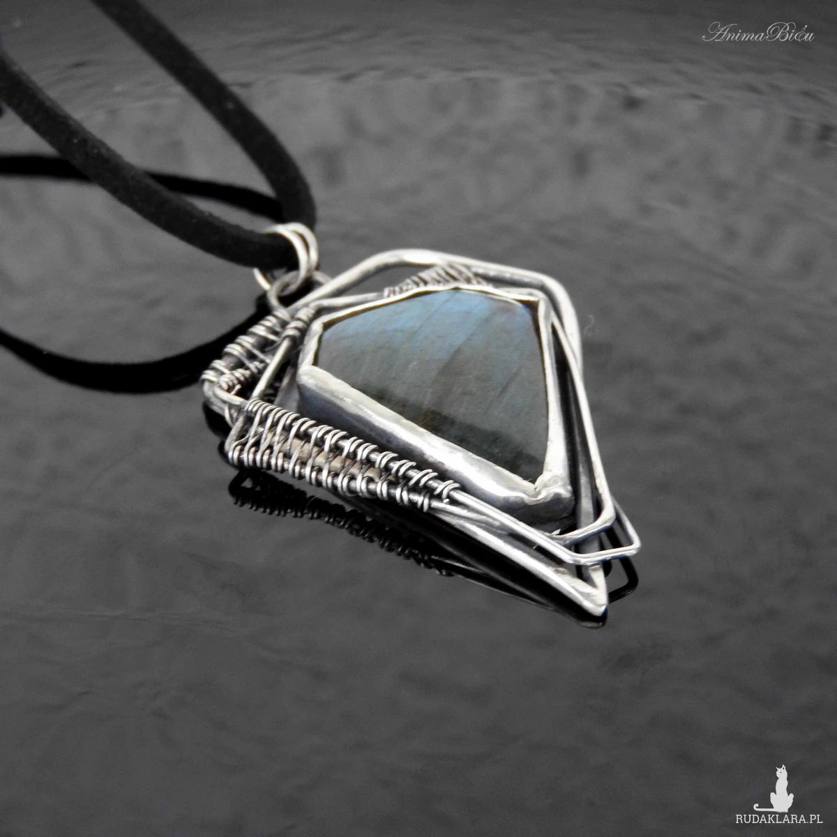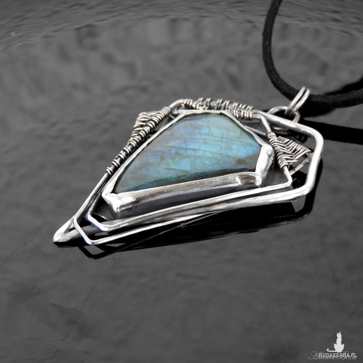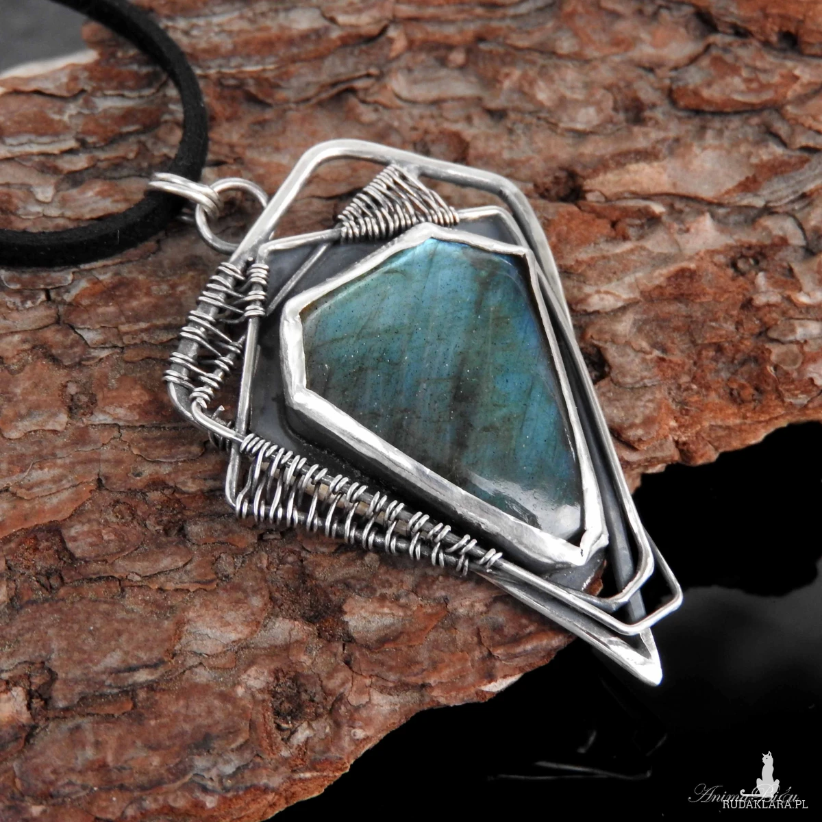 ręcznie ze srebra próby 925 i 999. Jego sercem jest madagaskarski labradoryt o