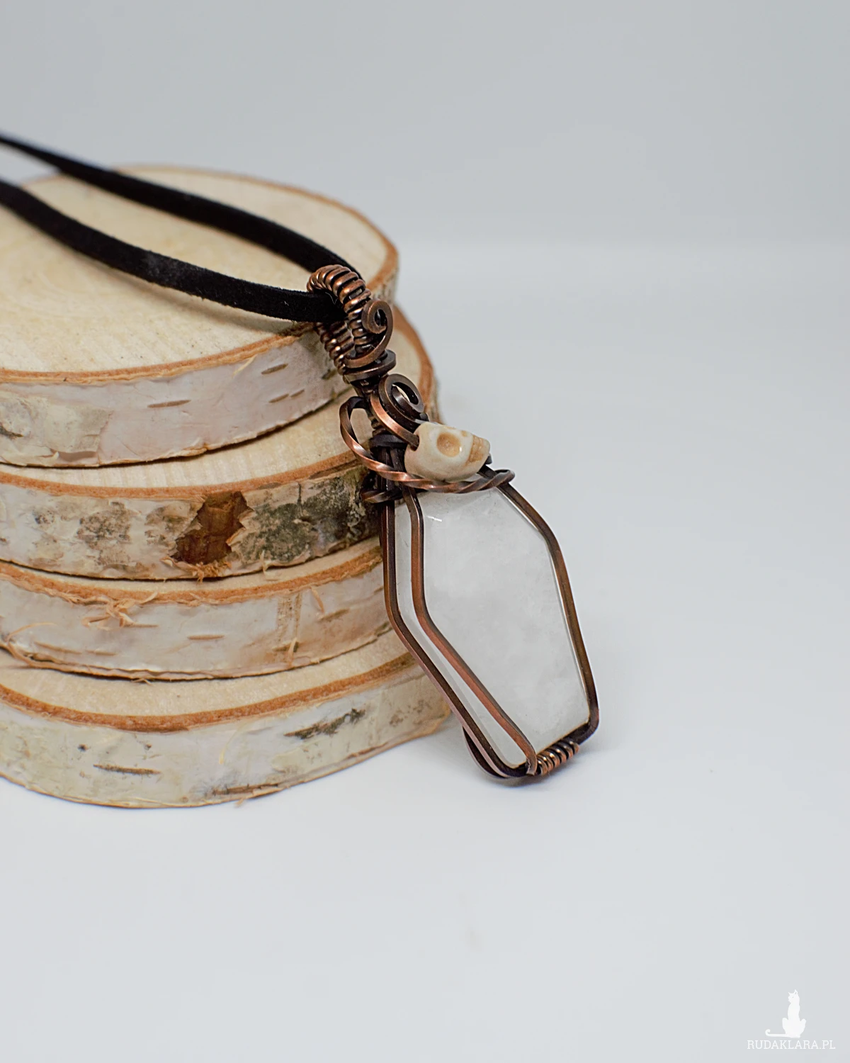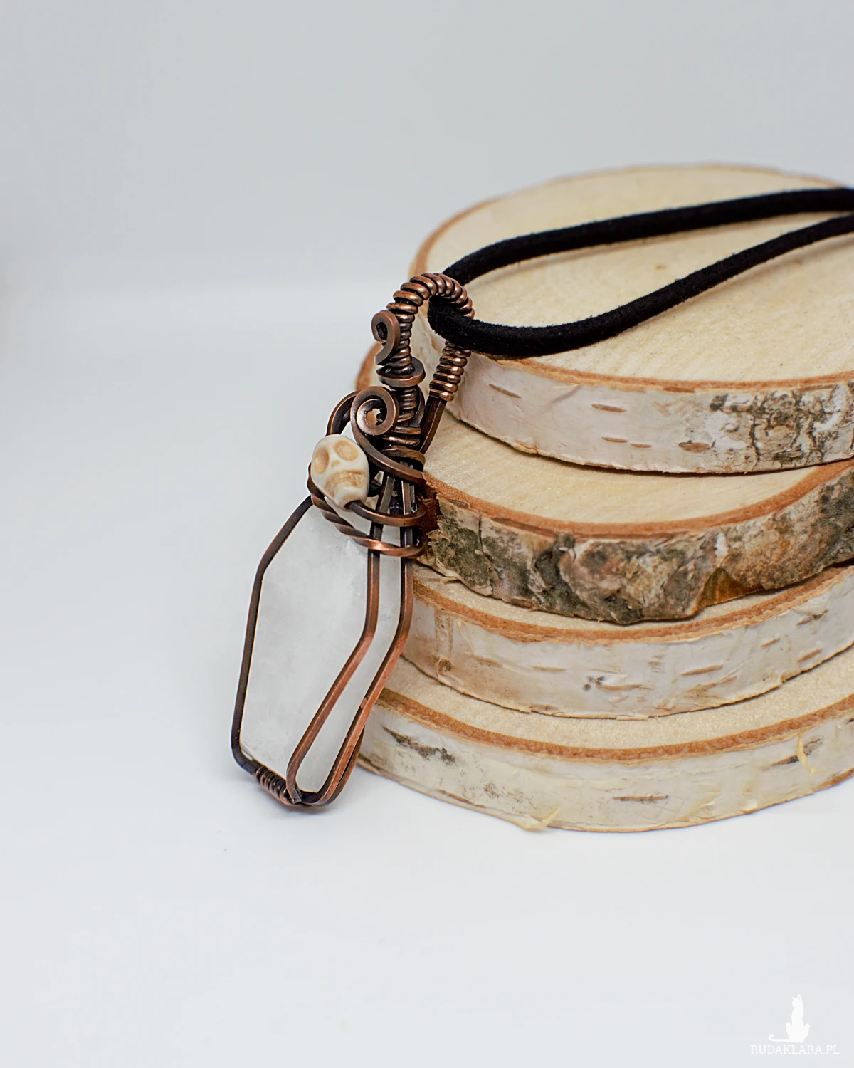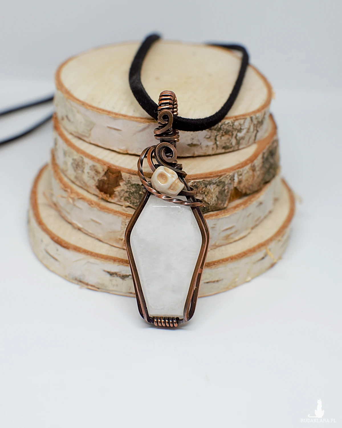 Piękny okaz kwarcu mlecznego, szlifowany na kształt trumny został oprawiony w naturalną miedź a mrocznego charakteru całości dodaje malutki howlit rzeźbiony na kształt czaszki :)