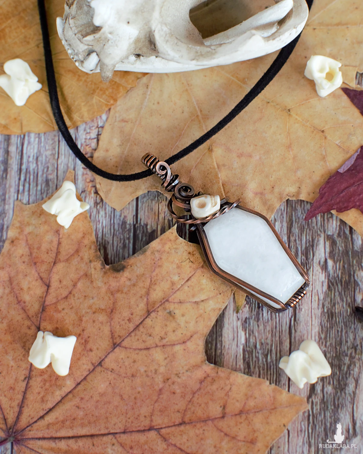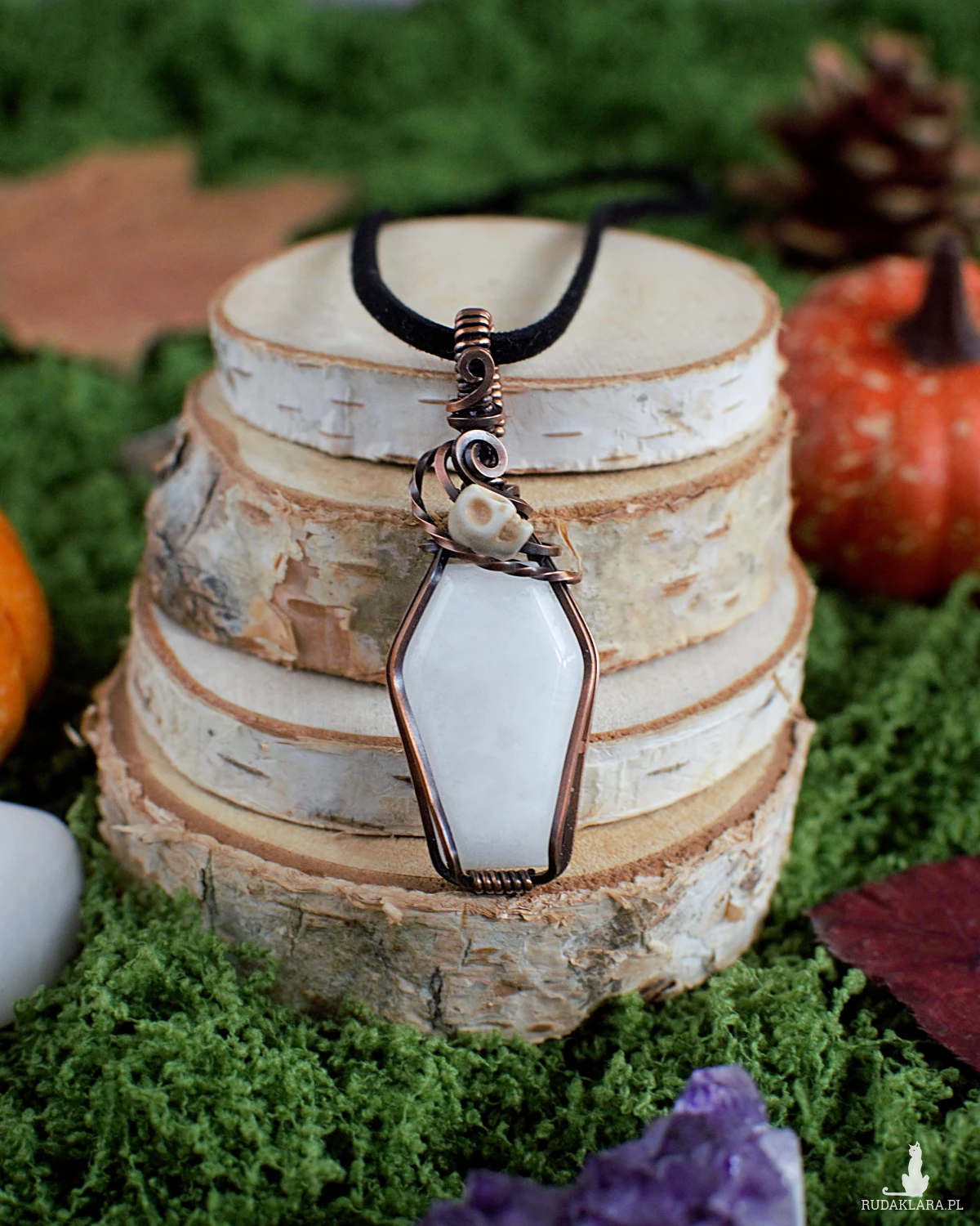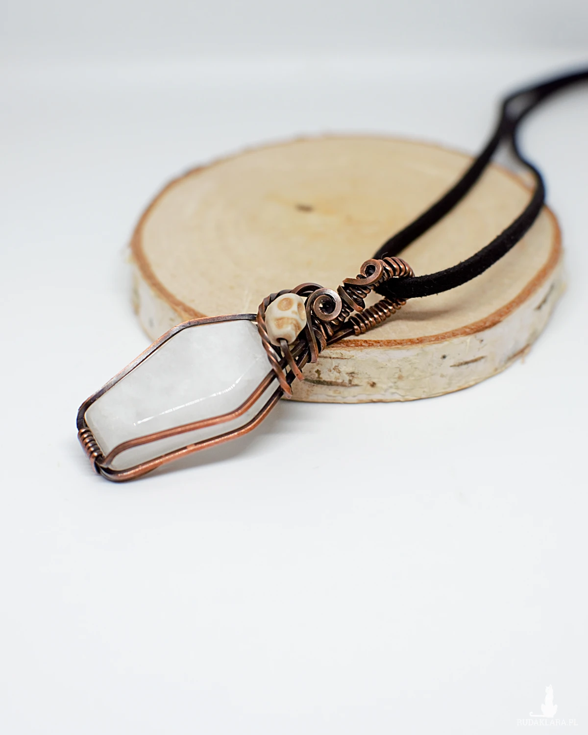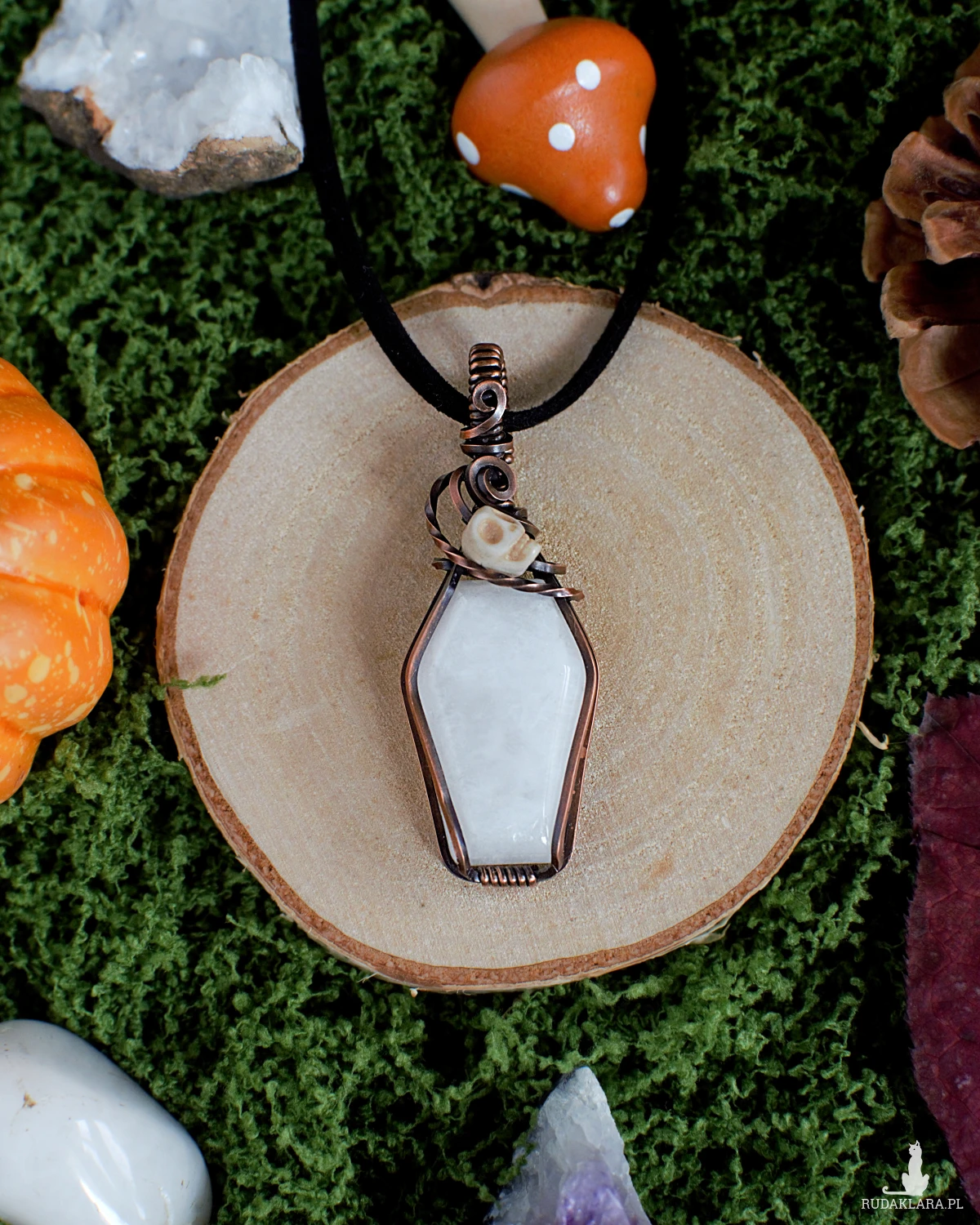 Piękny okaz kwarcu mlecznego, szlifowany na kształt trumny został oprawiony w naturalną miedź a mrocznego charakteru całości dodaje malutki howlit rzeźbiony na kształt czaszki :)