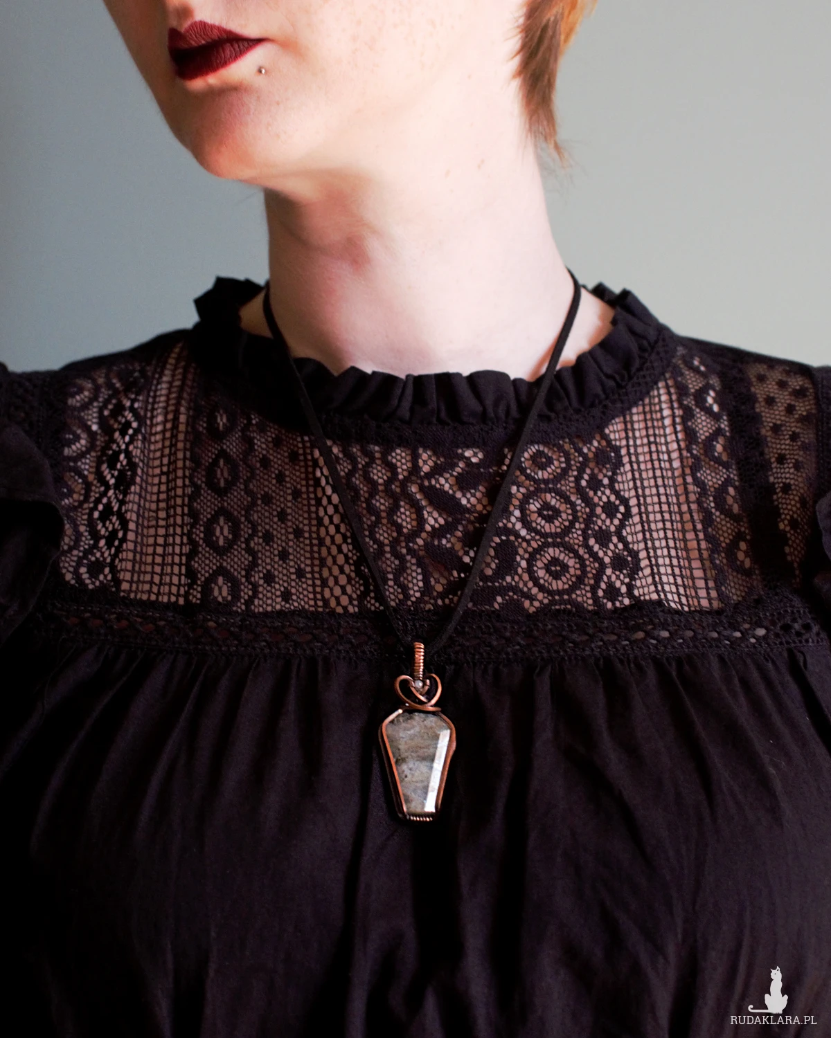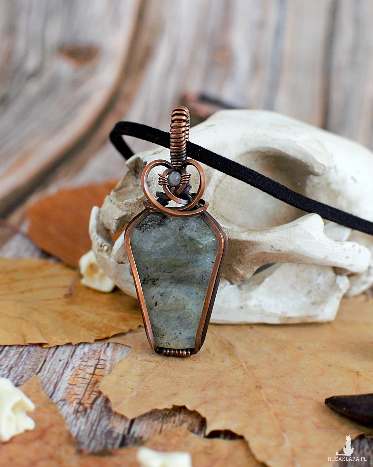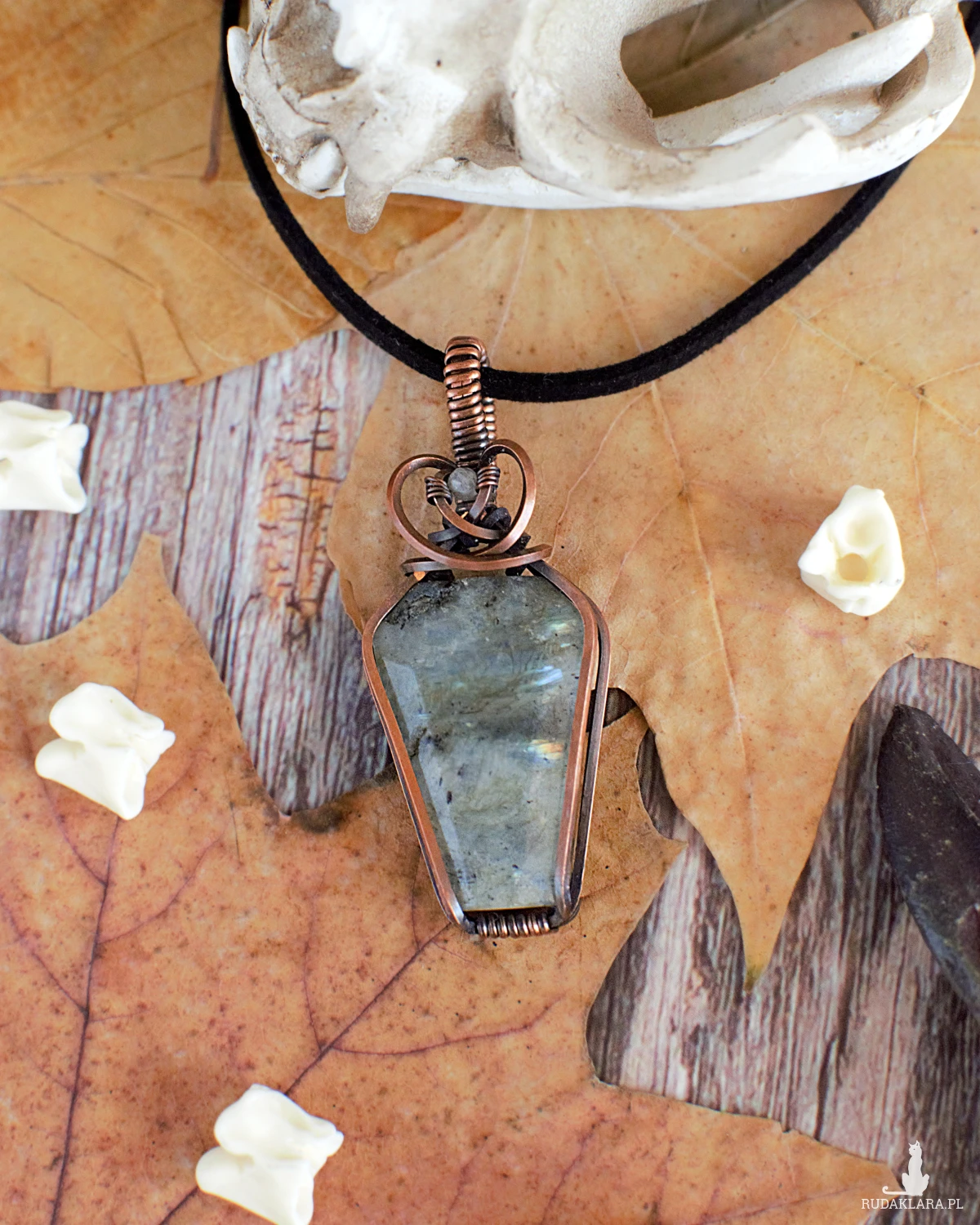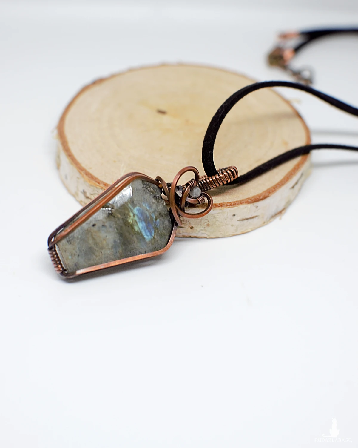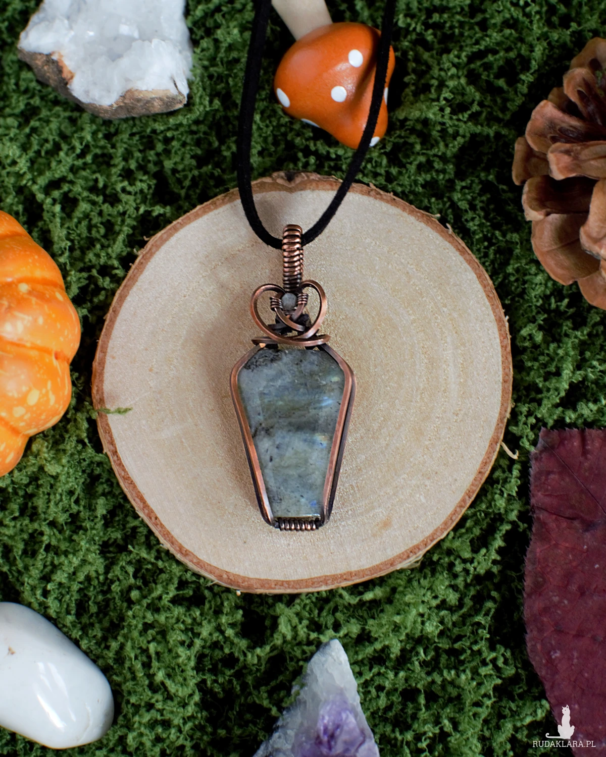 Wyjątkowy okaz labradorytu z subtelnym przebłyskiem, szlifowany na kształt trumny został oprawiony w naturalną miedź i wzbogacony dodatkiem malutkiego fasetowanego labradorytu, przepięknie łapiącego światło.