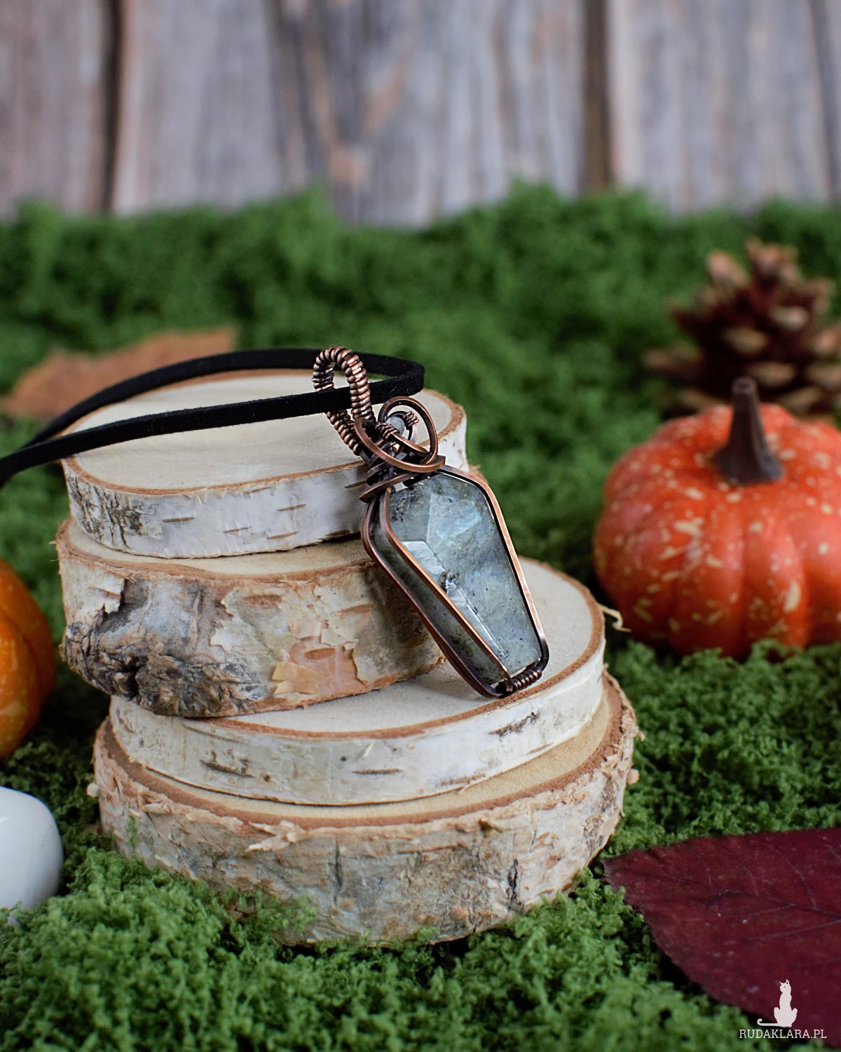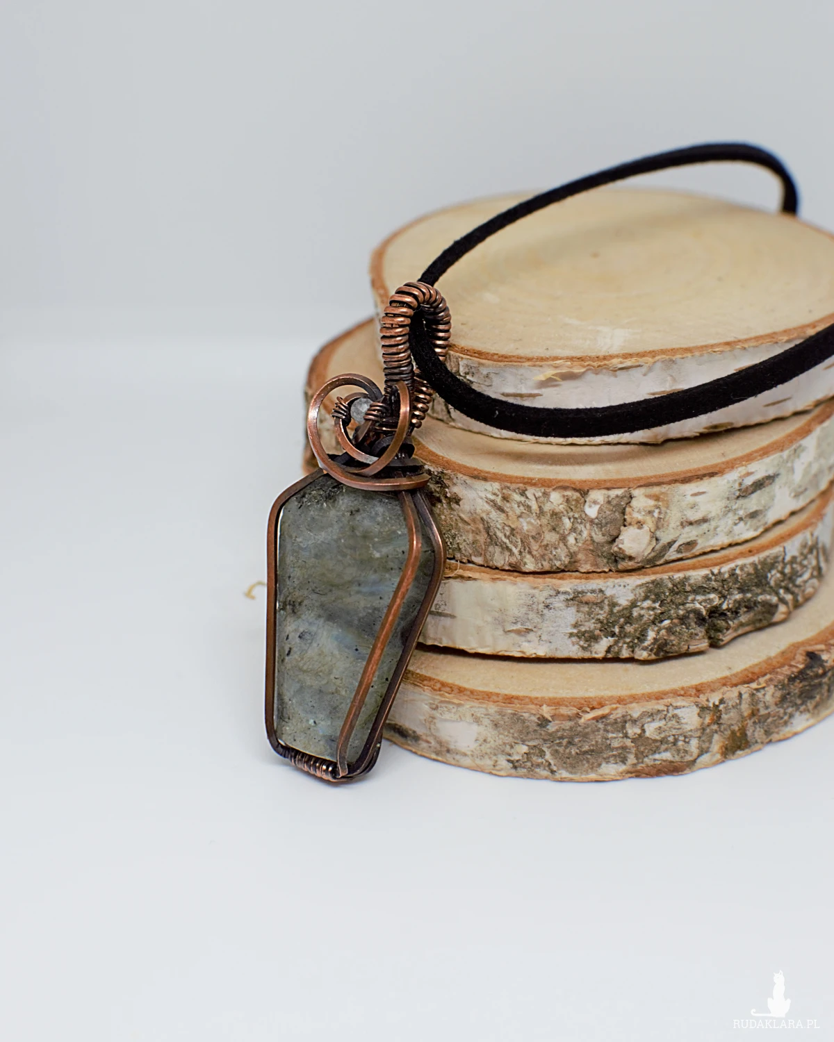 Wyjątkowy rodzaju wisior ręcznie wykonany z użyciem labradoryt i naturalnej miedzi.