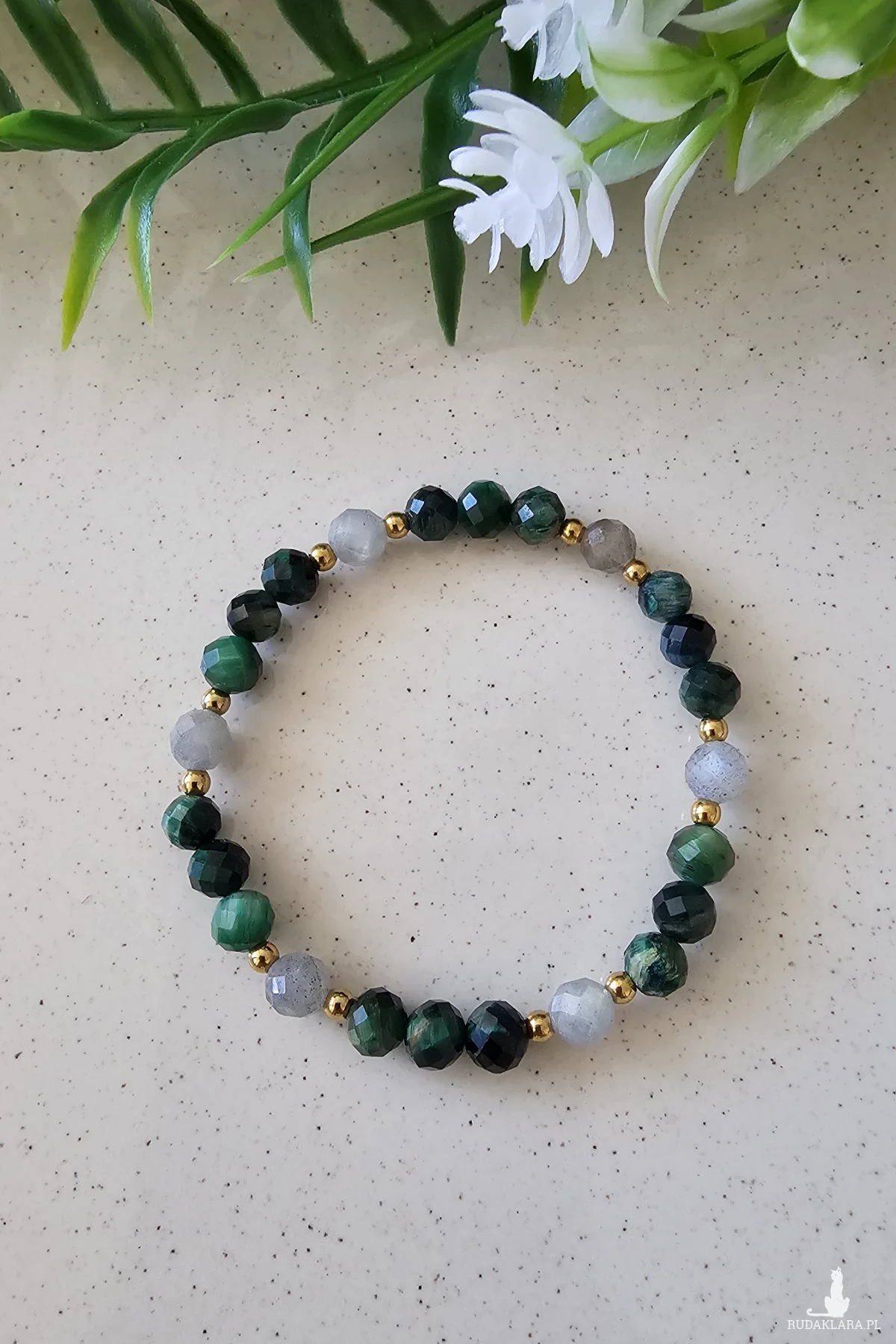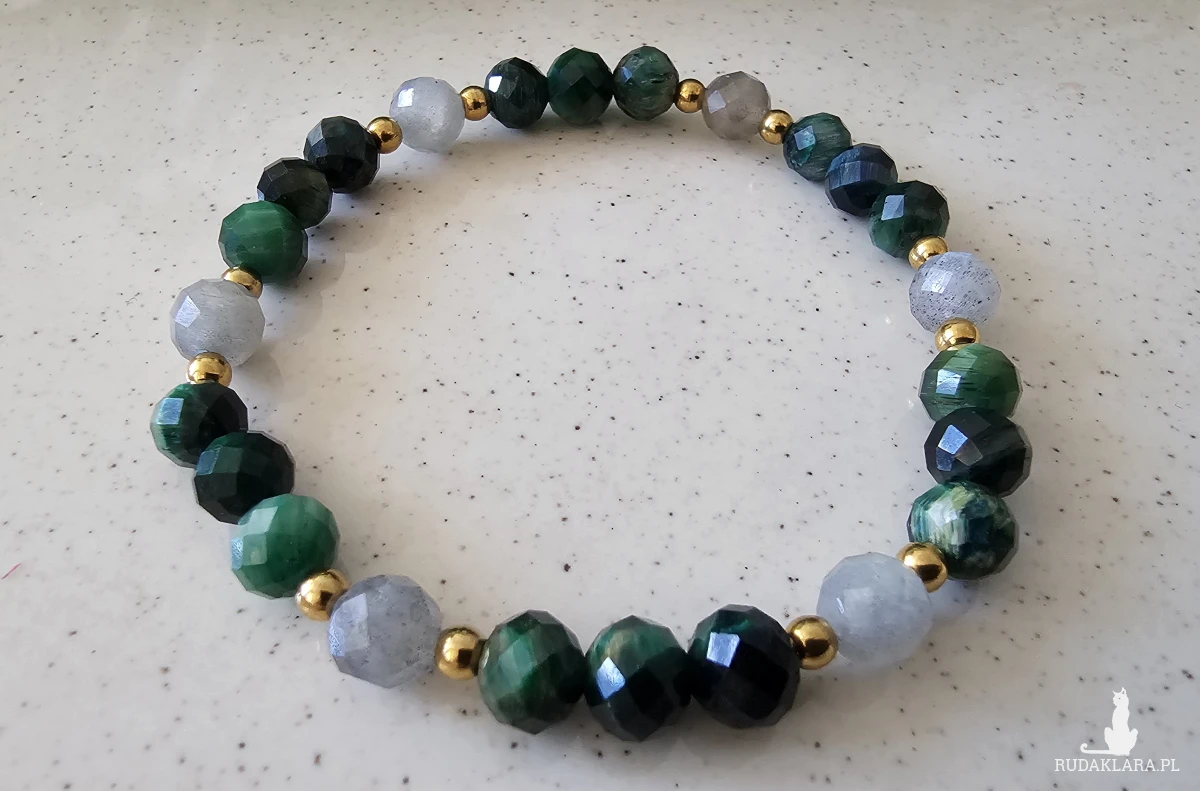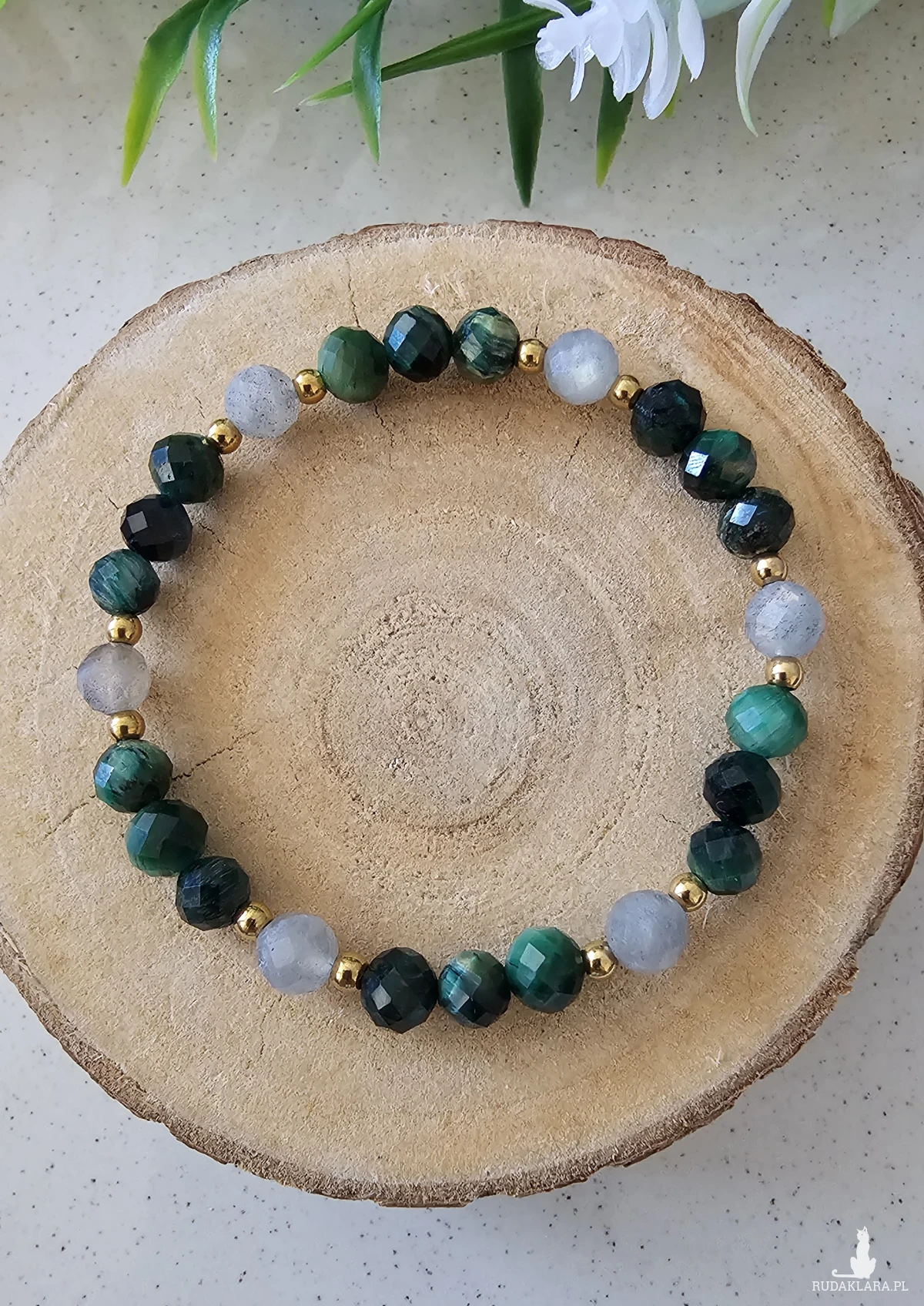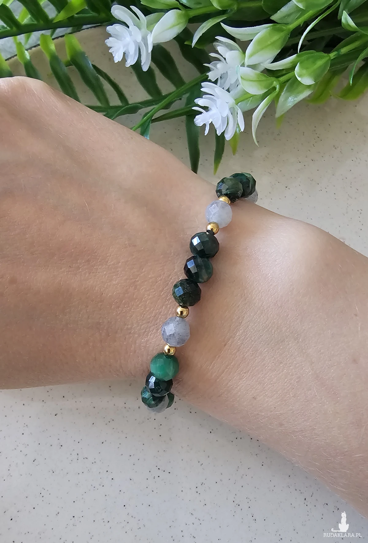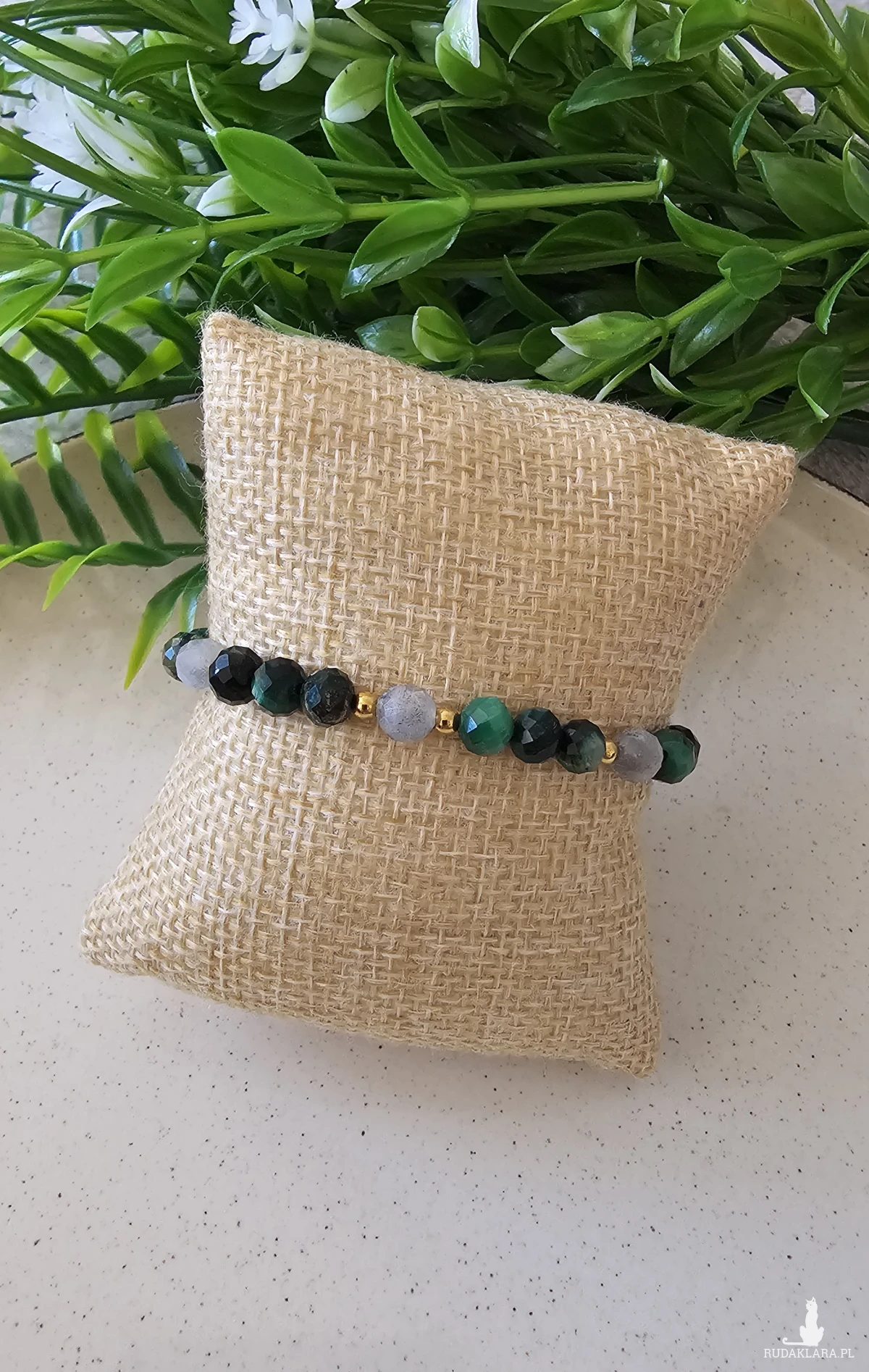 Bransoletka handmade na elastycznej gumce z kamieni zielonego kociego oka i labradorytu