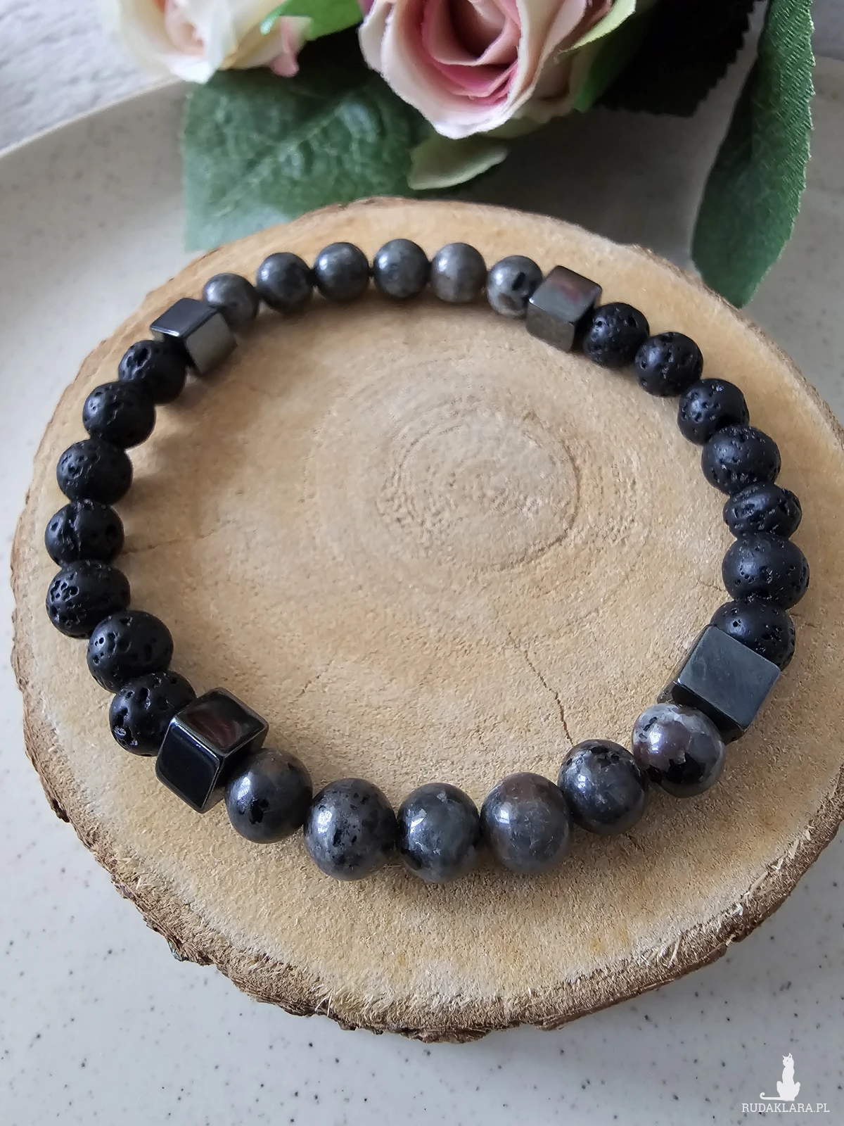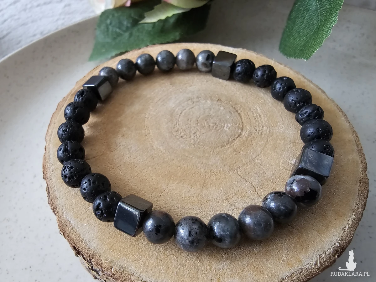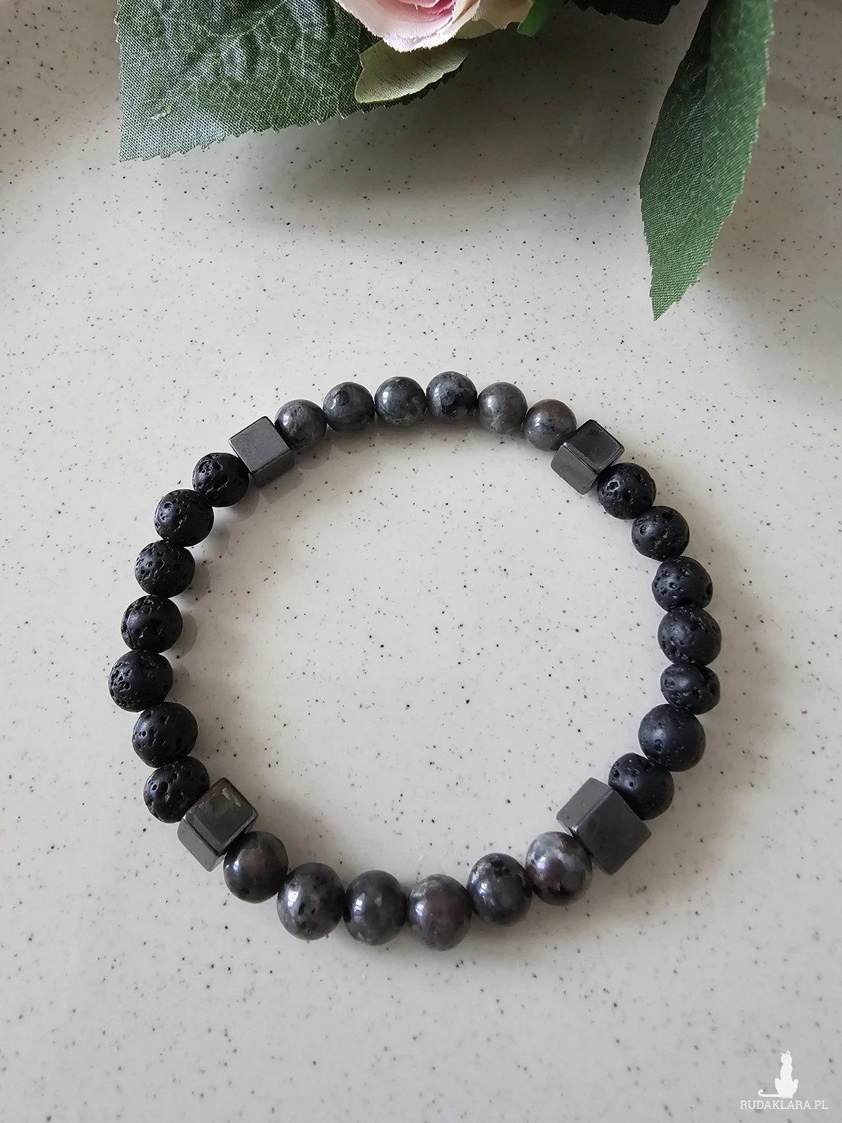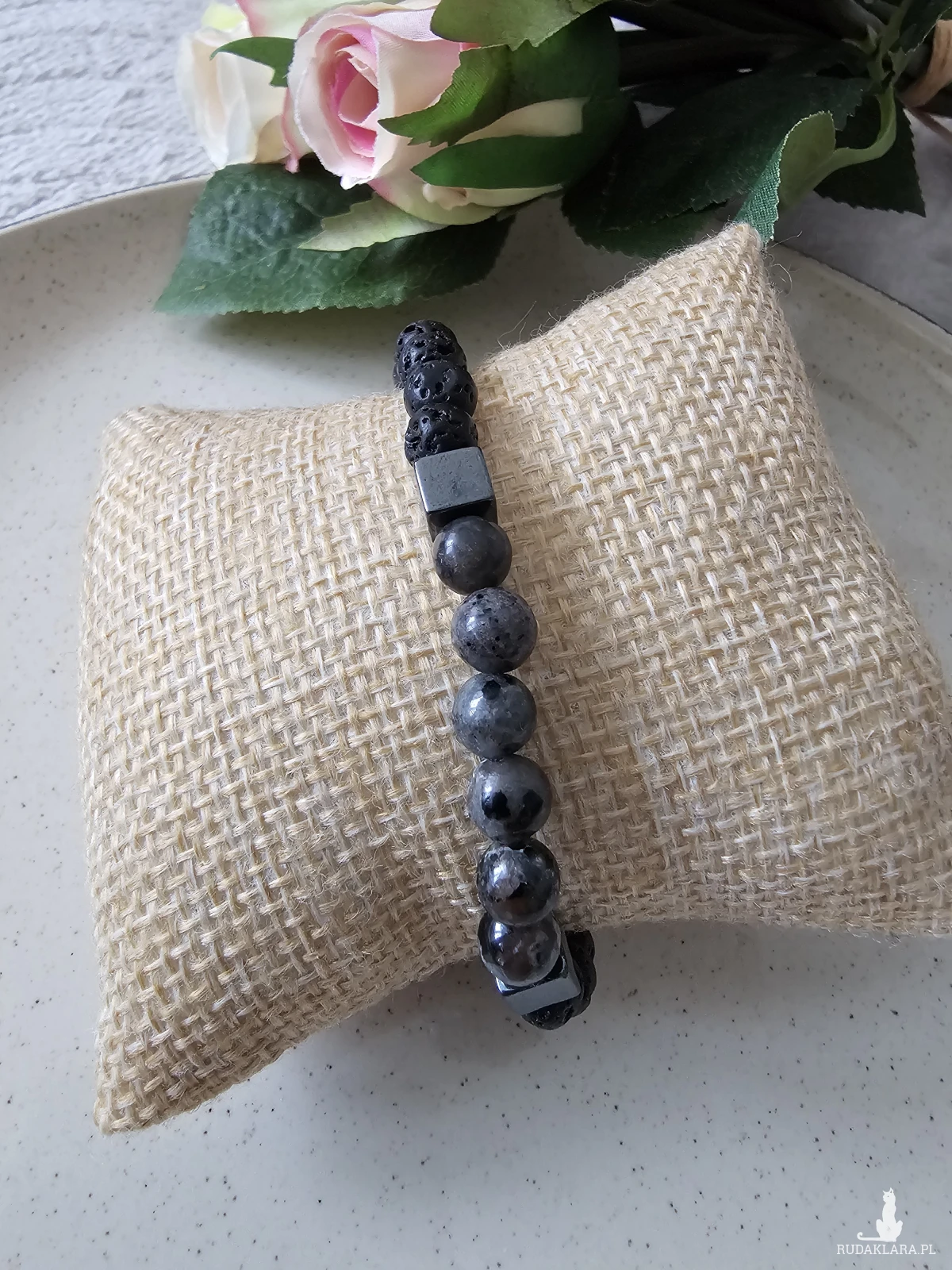 🫶Bransoletka na elastycznej gumce z kamieni yoperlitu, hematytu i lawy wulkanicznej.