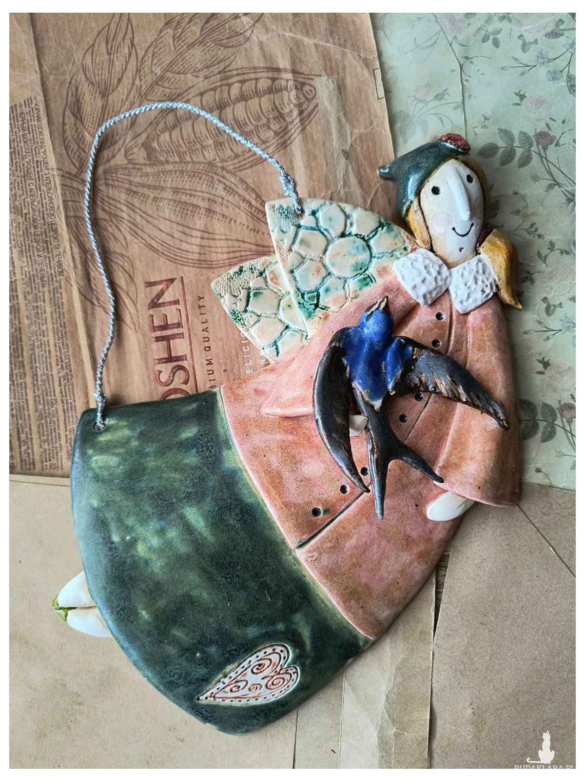 Uroczy aniołek ceramiczny wykonany z gliny szamotowej, wypalony na biskwit, a następnie szkliwiony w temperaturze 1260 stopni C. Wymiary ok 17 cm x 22 cm. Do powieszenia na ścianie na ozdobnym sznureczku. Idealny jako prezent okolicznościowy lub do ozdoby domu.