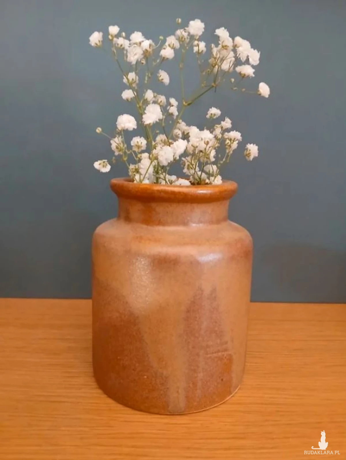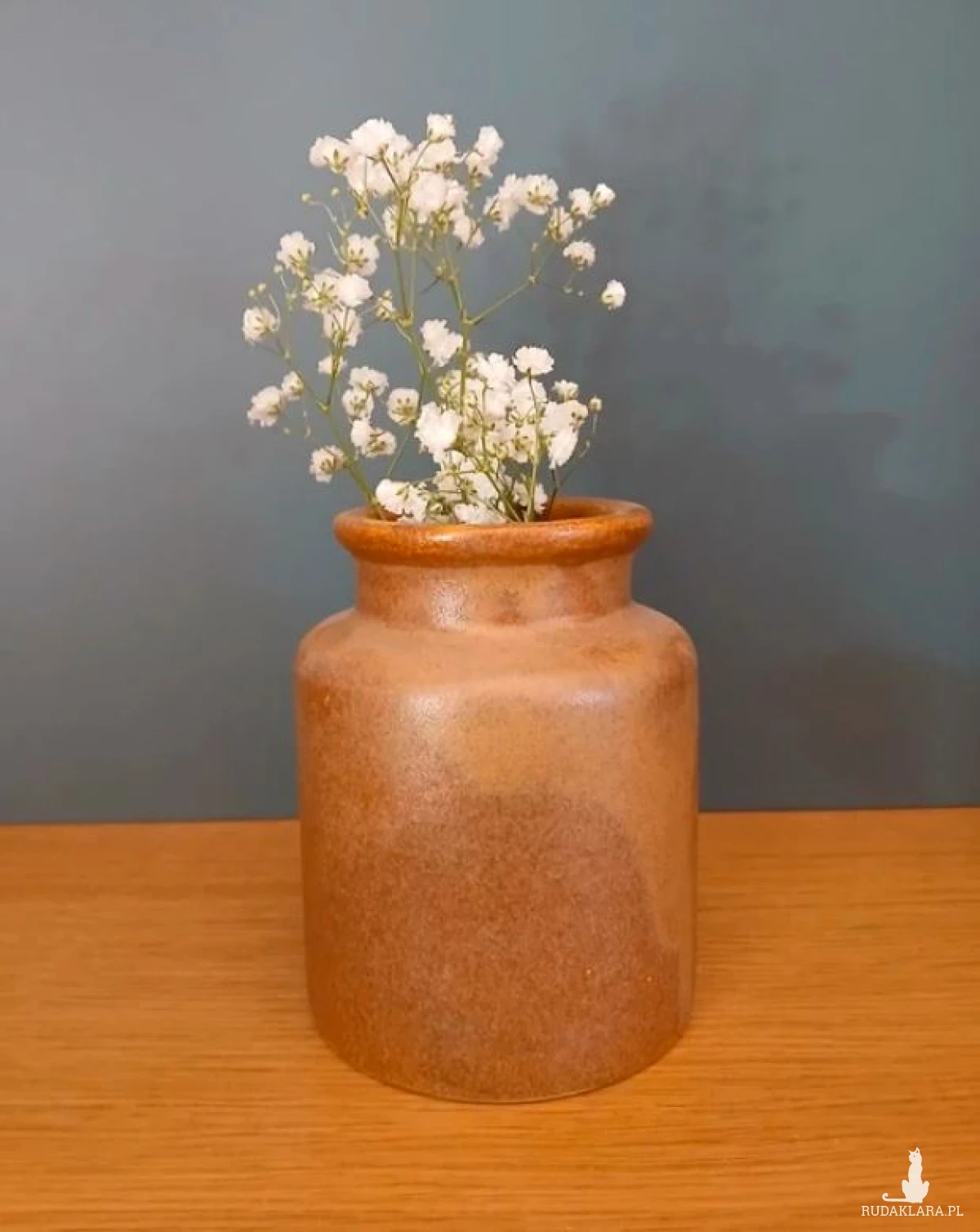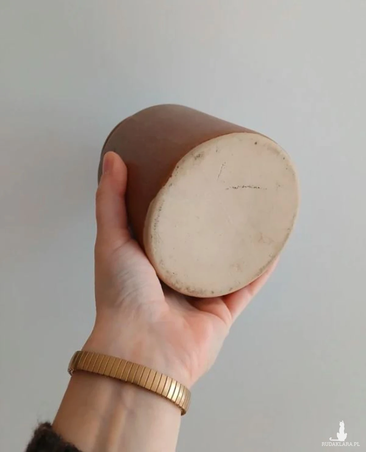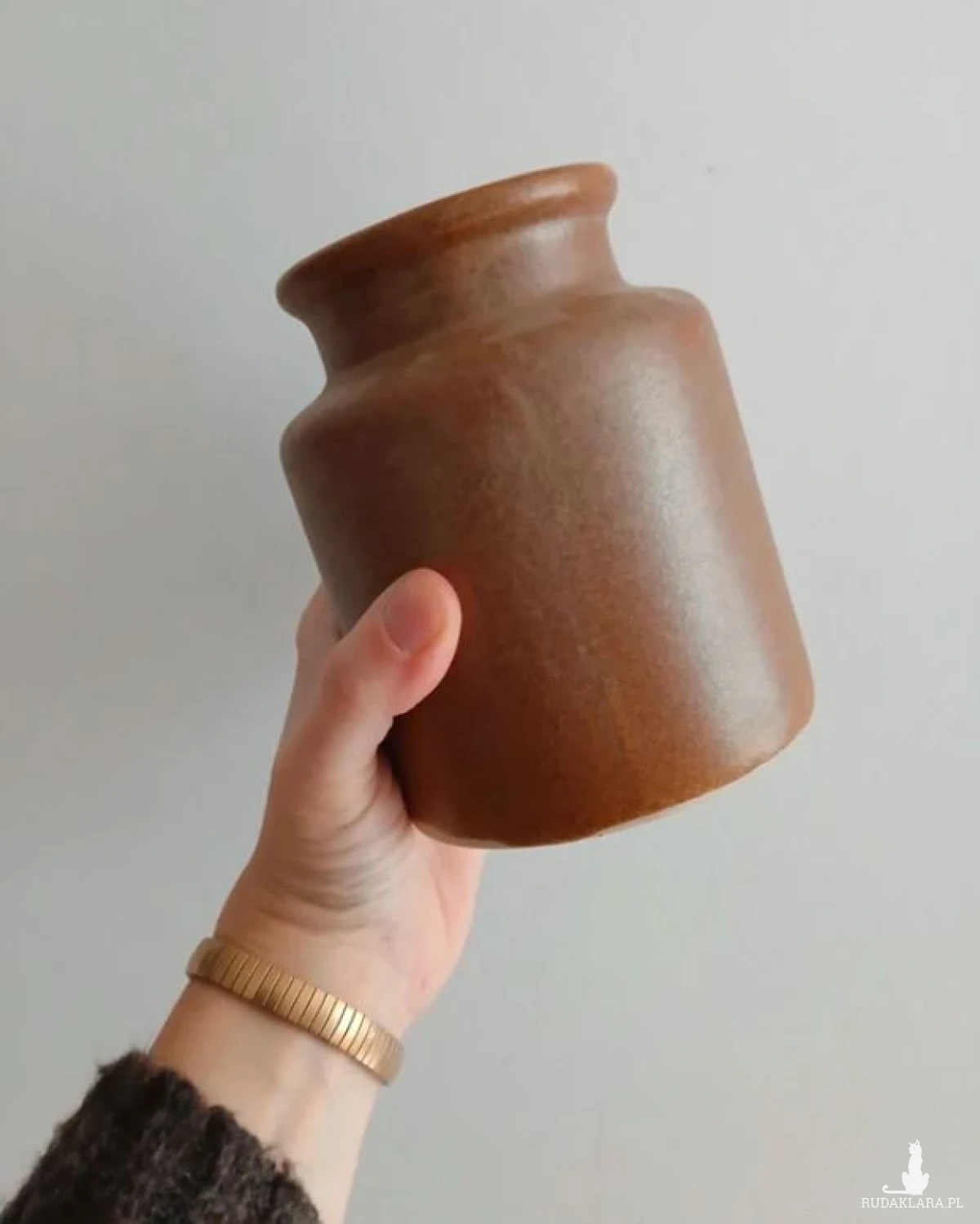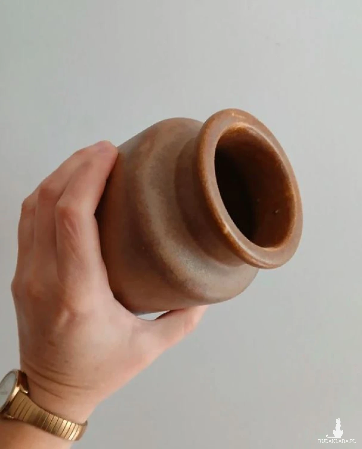 Gliniany wazon beczułka, toczony na kole, kamionka w pięknym złoto brązowym kolorze. Kształtem przypomina duży ceramiczny słoik. W sam raz na jesienne bukiety. Rękodzieło z Beskidu. Pomysł na prezent. Galeria sztuki, unikat. Wysokość 12cm Średnica podstawy 9cm Otwarcie 6cm