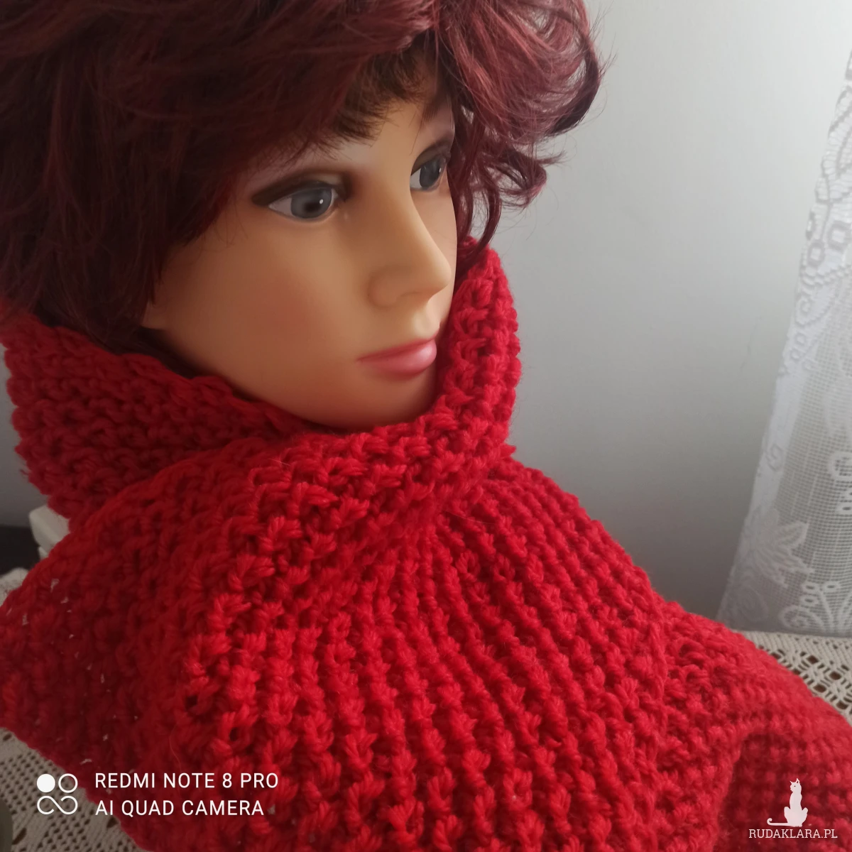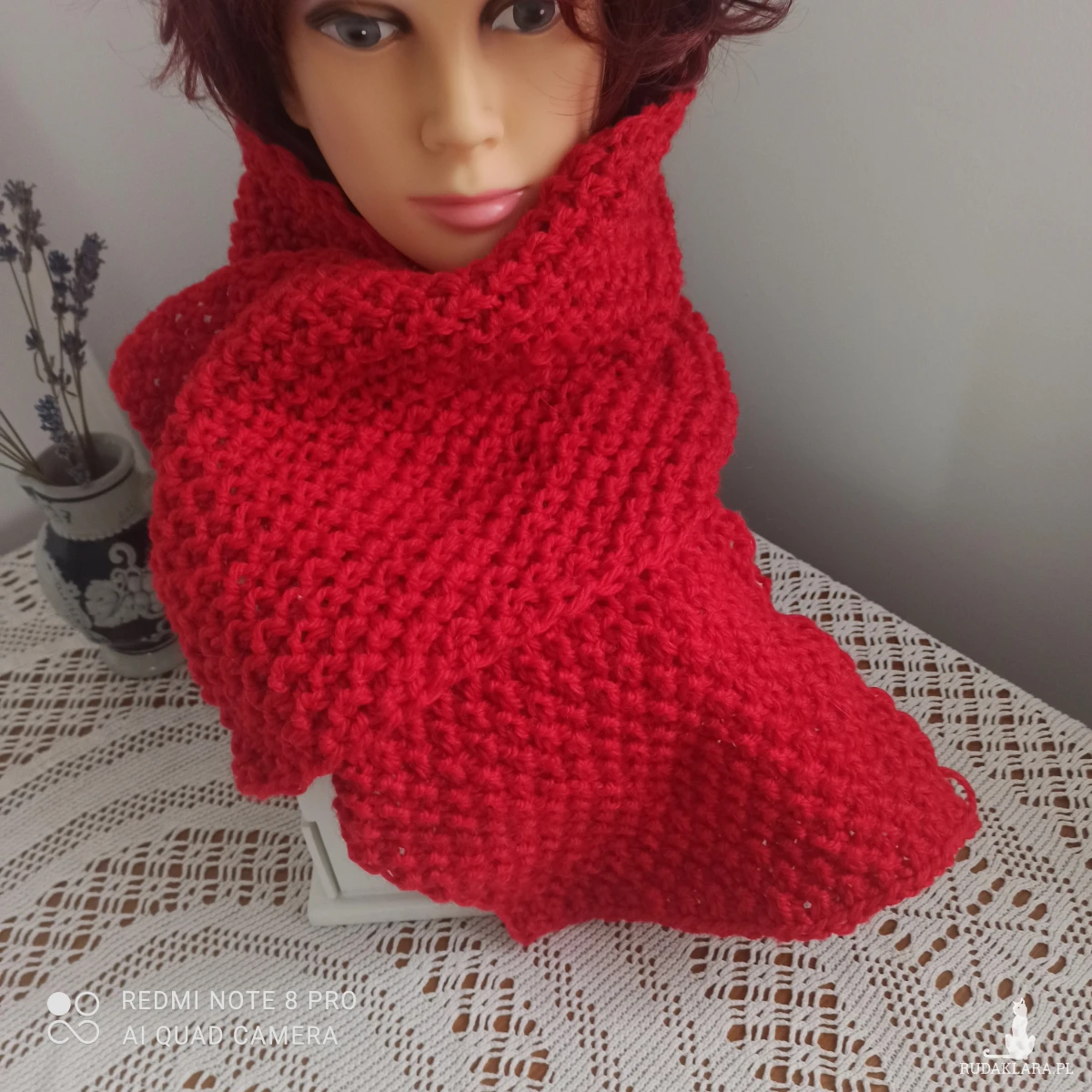 Szal w wyrazistym czerwonym kolorze /truskawkowym/wykonany na drutach z wełny. Wyrób bardzo mięsisty, mięciutki i bardzo przyjemny w dotyku. Nie drapie, jest bardzo milutki dla ciała. Całkowita długość 108 cm, szerokość 22,5 cm. Nie rozciąga się ale jest podatny na wydłużenie. Wykonany ściegiem ryżowym, dzięki niemu szalik staje si e dosyć gruby. Przy różnej pogodzie można wykorzystać wyrób jako tradycyjny szalik, chusta na bluzkę lub bezpośrednio na głowę lub na czapkę z daszkiem. Doskonały dodatek na chłodniejszą lub nawet zimną pogodę. Piękny rzucający się w oczy kolor. Pranie wyłącznie ręczne , w temperaturze do 30 stopni. Gorąco polecam, niska cena.