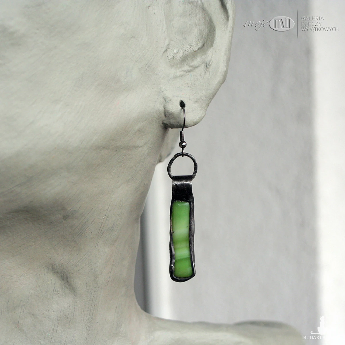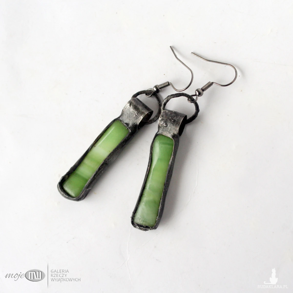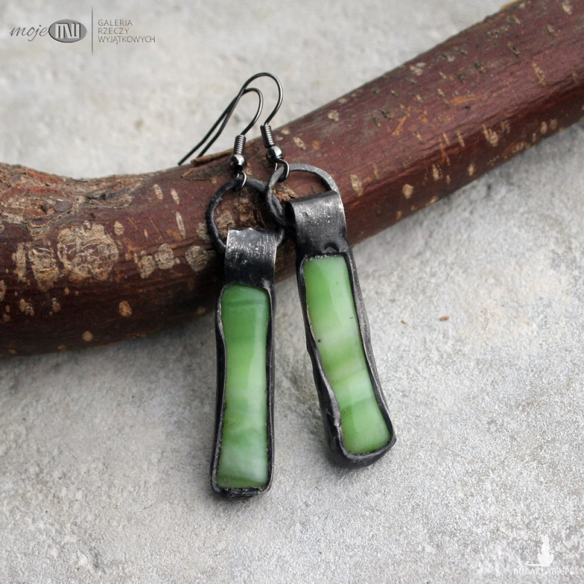 Kolczyki z zielonego, nieprzejrzystego, szklanego, podłużnego paluszka, wytopionego przeze mnie metodą fusingu w temperaturze min. 800 stopni. Całość oprawiona w miedź - cynowaną, patynowaną i przecieraną.