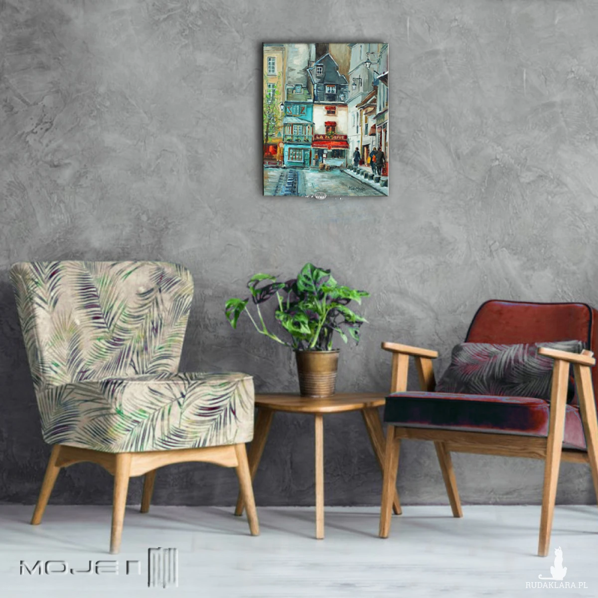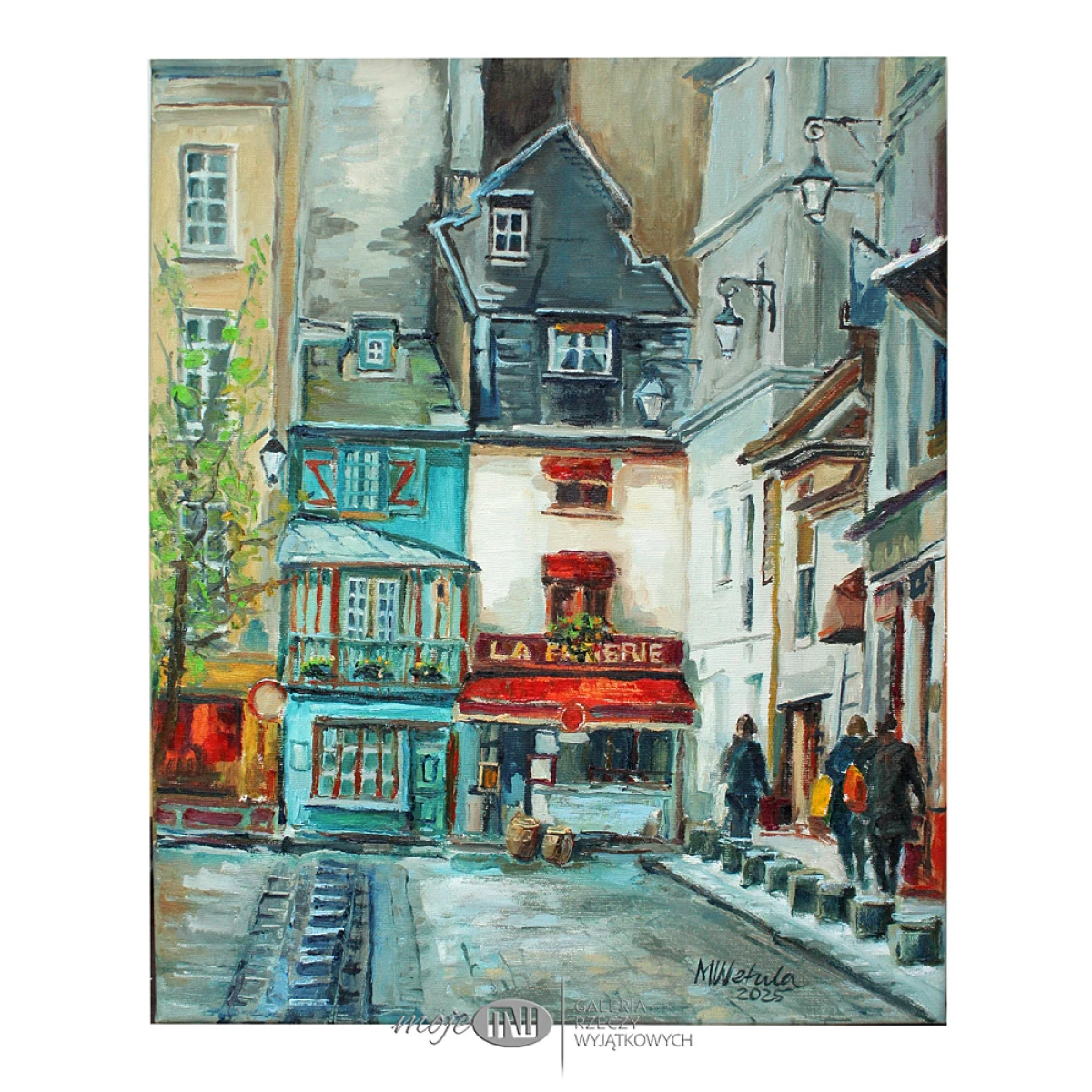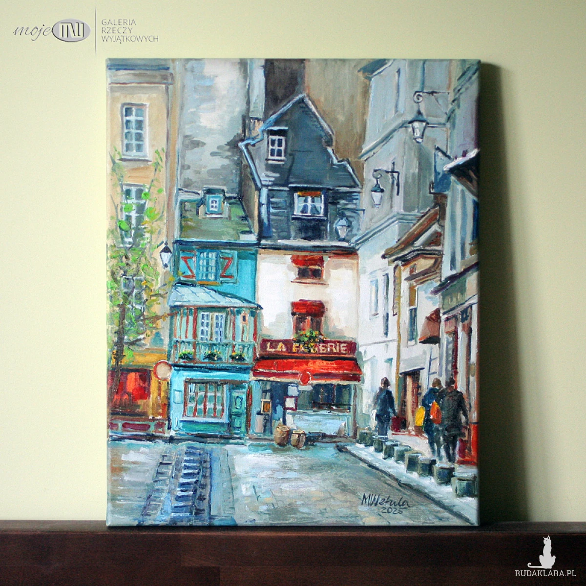 Obraz olejny, utrzymany w pełnej palecie barw, przedstawia starą paryską uliczkę.