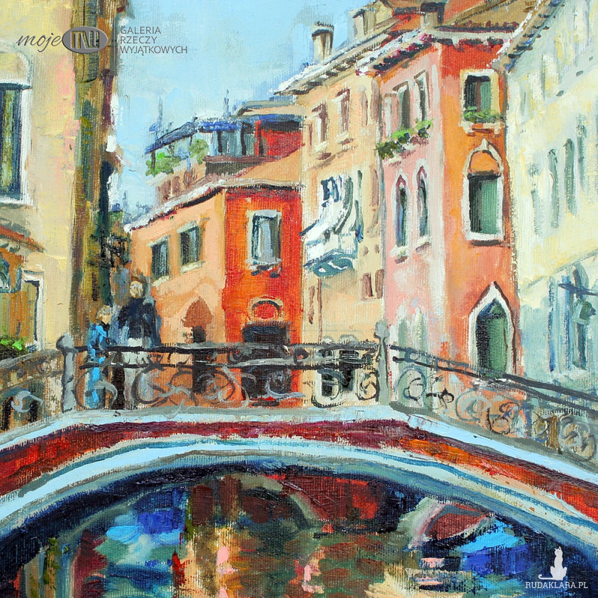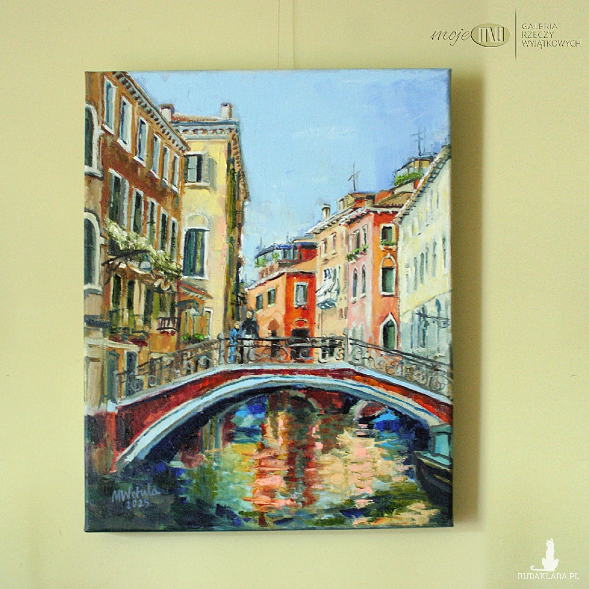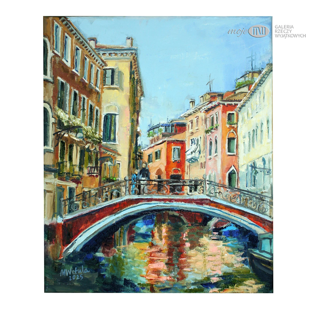 Obraz olejny na płótnie, utrzymany w pełnej, mocno nasyconej gamie kolorystycznej. Boki pomalowane pod kolor. Sygnowany.