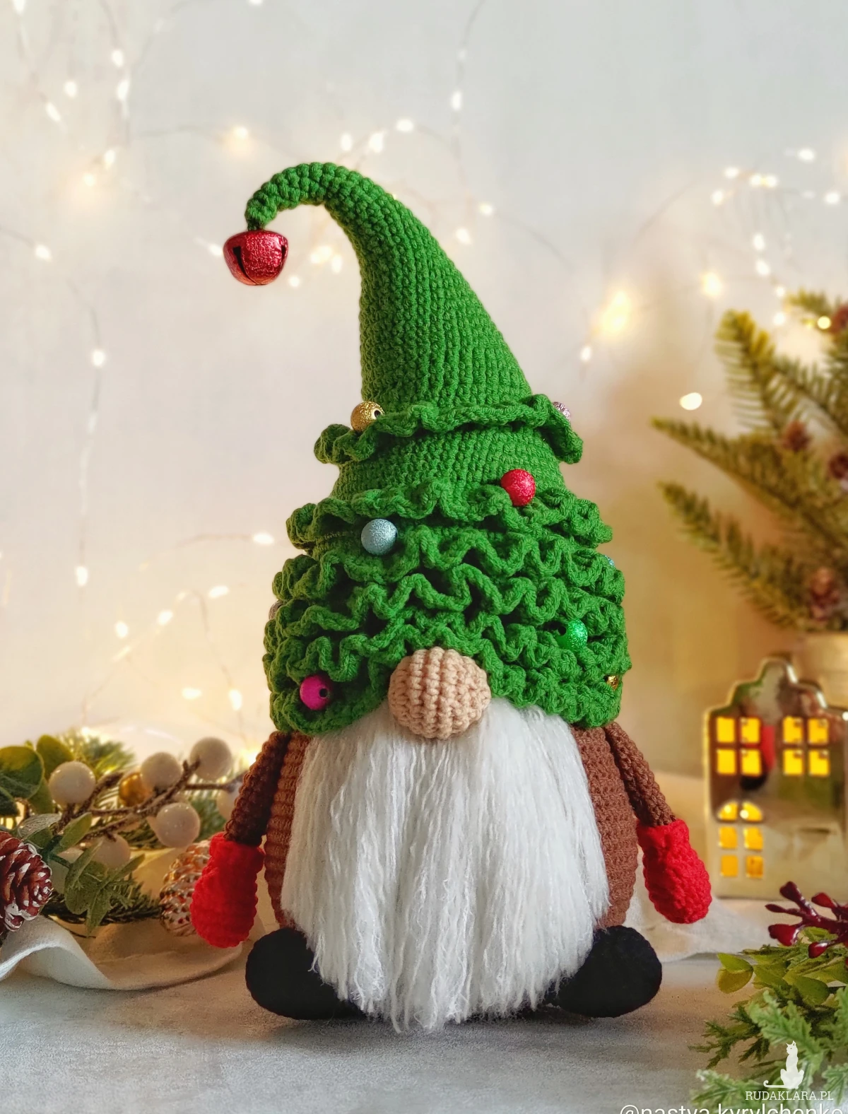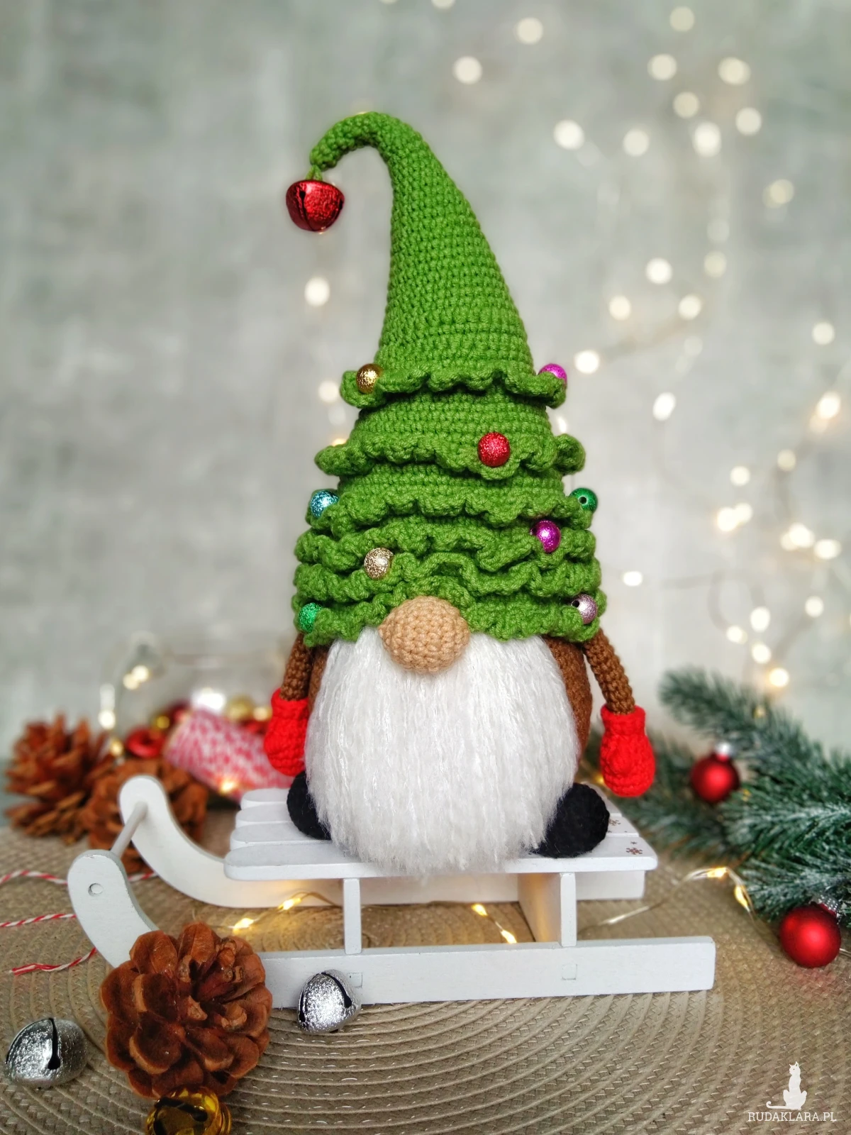 - Czapka gnoma ma kształt choinki, ozdobiona jest kolorowymi, błyszczącymi koralikami, a na końcu kapelusza wisi metalowy dzwoneczek (kolor losowy).