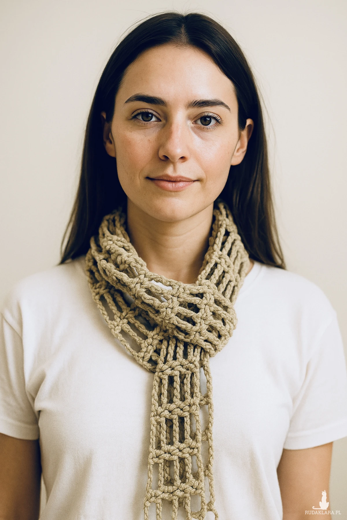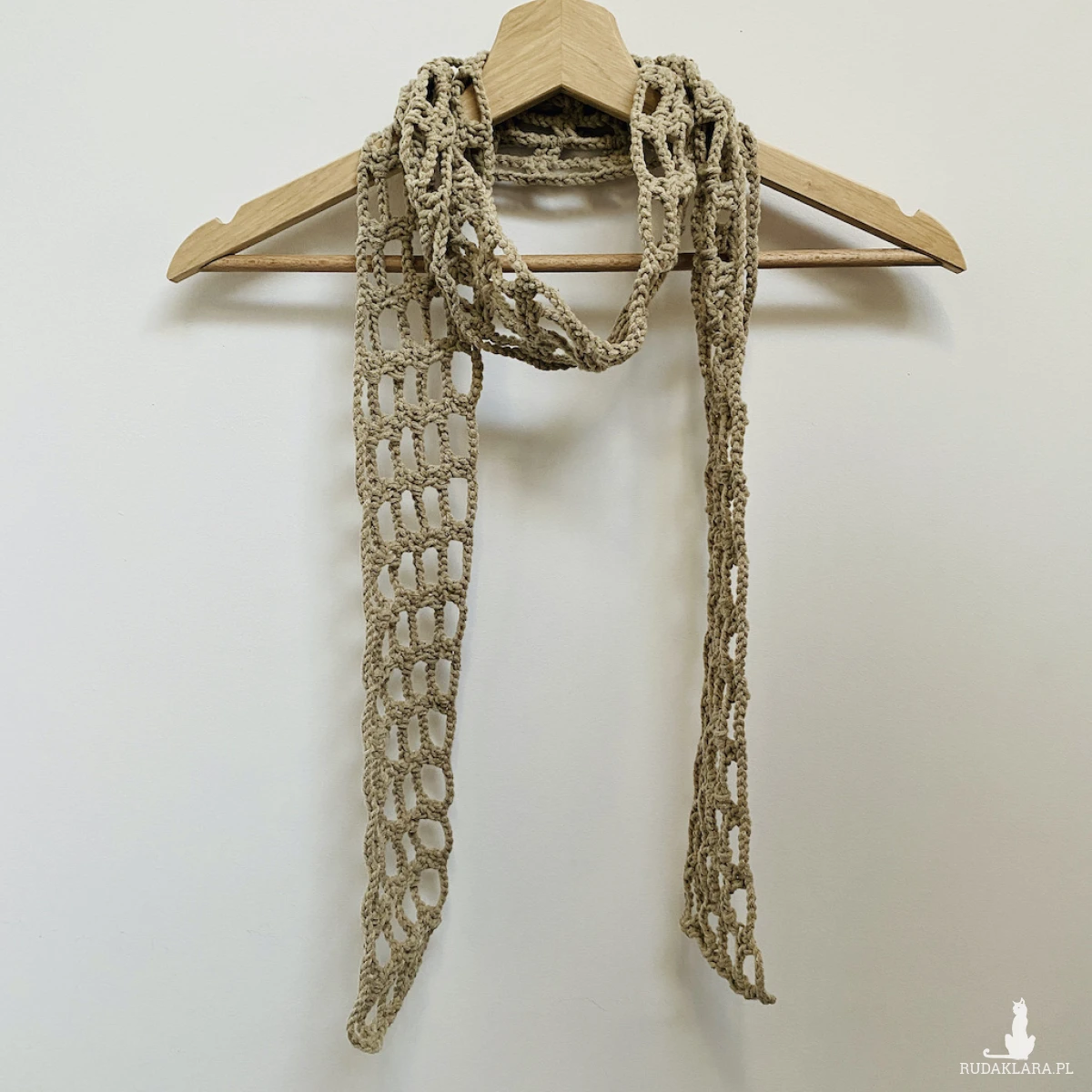Ażurowy, siatkowy wzór nadaje mu ciekawego charakteru, a odpowiednia długość pozwala na różne sposoby stylizacji – możesz owinąć go wokół szyi, nosić jak naszyjnik, opaskę lub delikatny akcent do letnich i jesiennych stylizacji.
