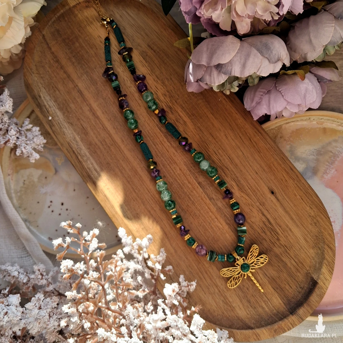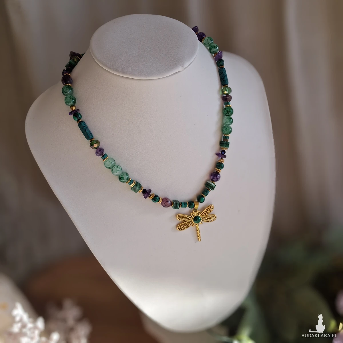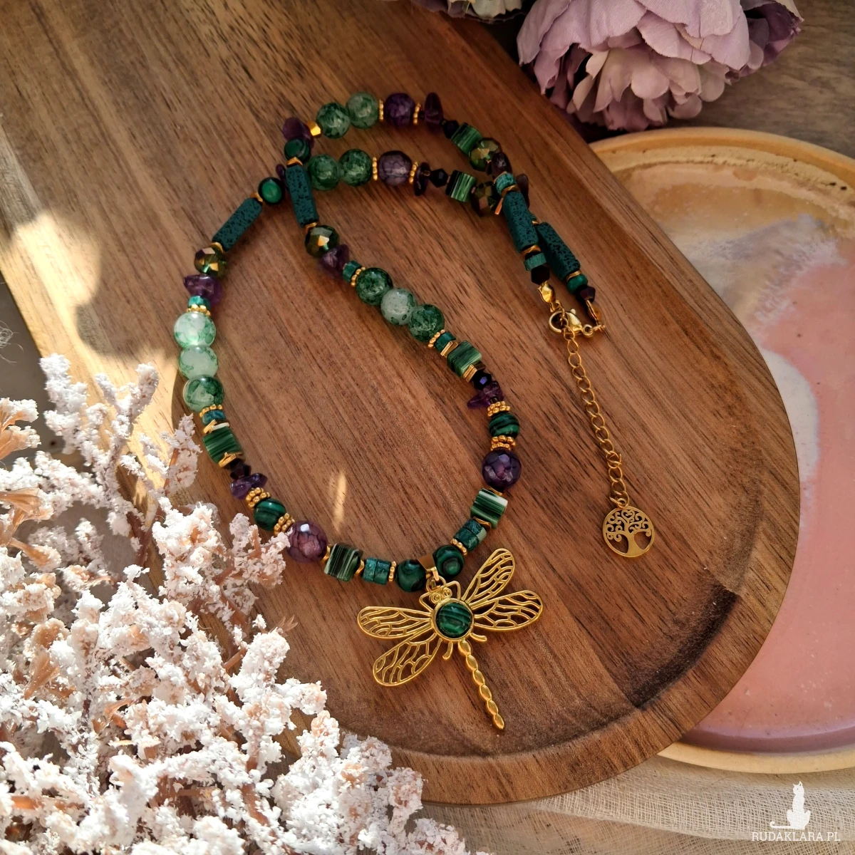 Naszyjnik wykonany ze stali nierdzewnej (jubilerskiej), szklanych i akrylowych koralików oraz kamieni naturalnych. Użyte kamienie: