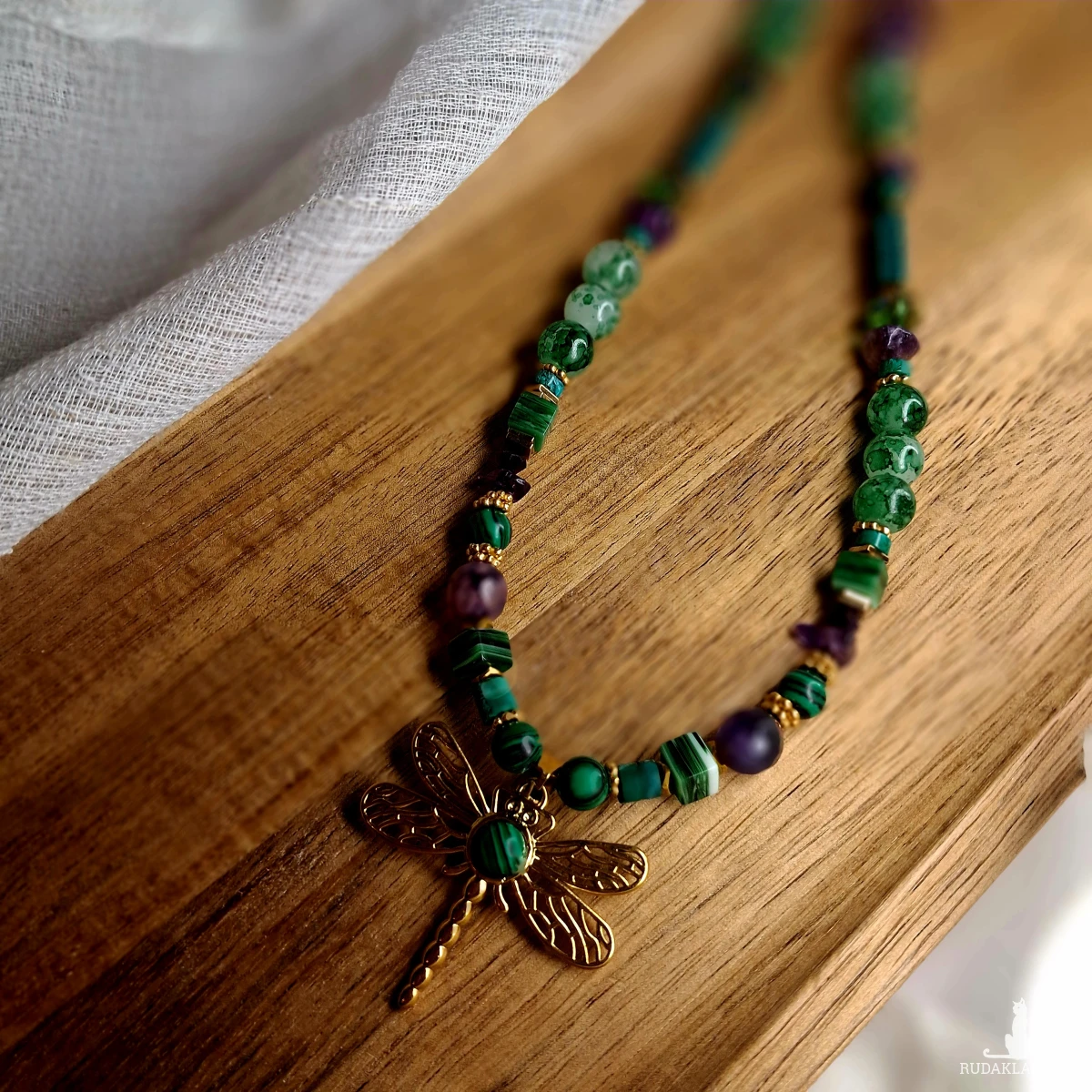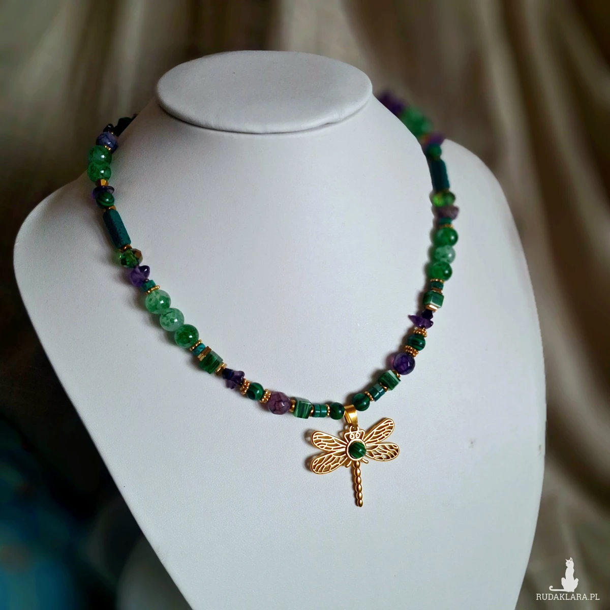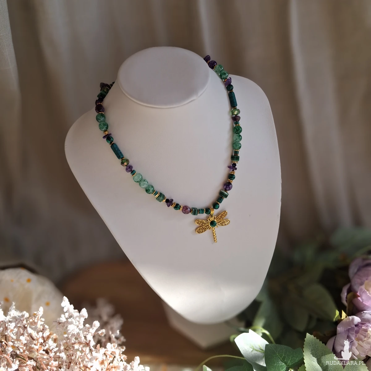 Naszyjnik wykonany ze stali nierdzewnej (jubilerskiej), szklanych i akrylowych koralików oraz kamieni naturalnych. Użyte kamienie: